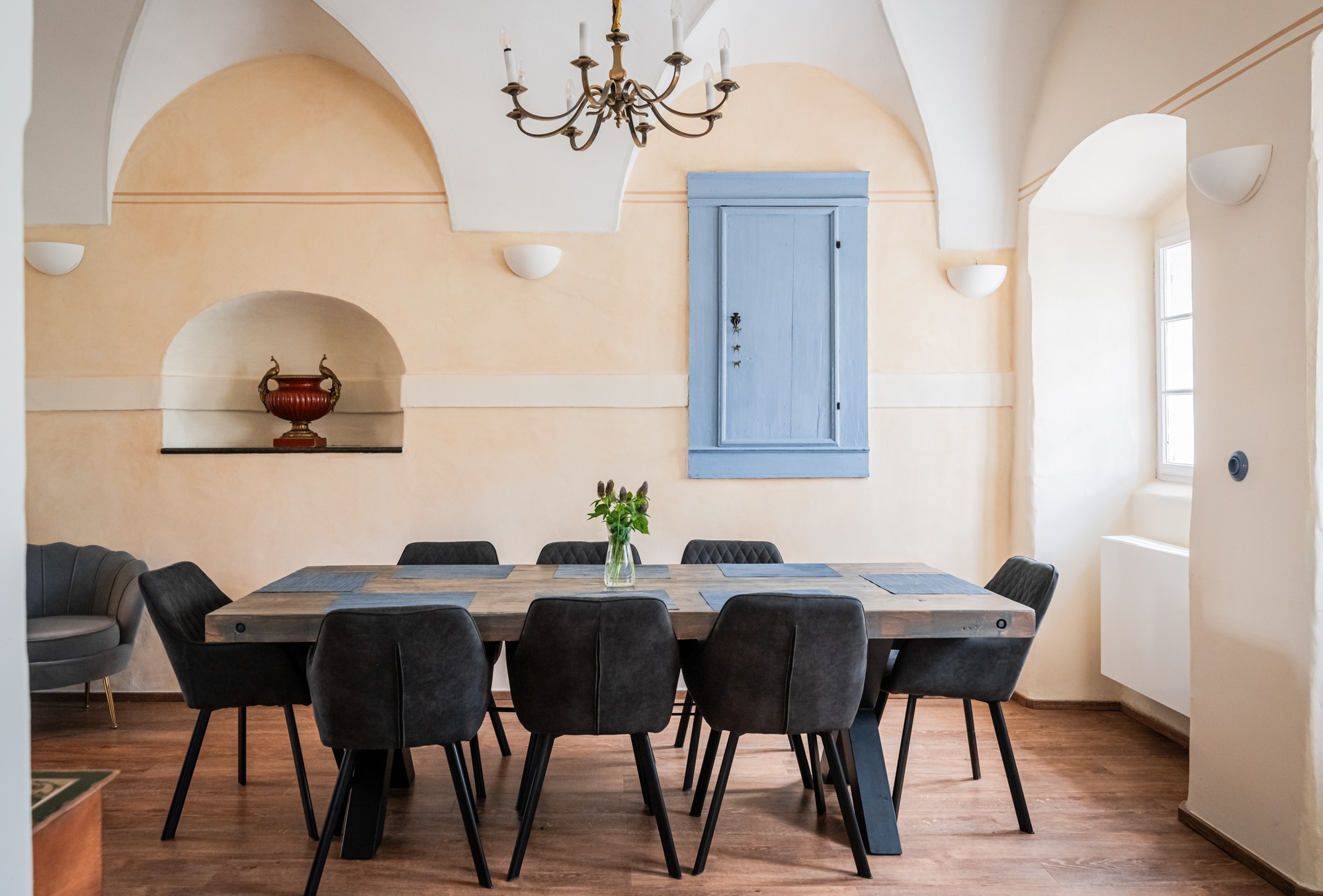 Určitě! To byl jeden z našich hlavních záměrů: maximálně zachovat a zdůraznit historickou autenticitu, zachovat syrovost detailů (dveře, podlahy, omítky, fasáda etc.). Síla té emoce vnímání historie místa je podle nás právě v té syrovosti a detailech, nechtěli jsme uhlazenou a neautentickou stylizaci. Usilovali jsme o to, aby ta úžasná historie domu byla hmatatelná na každém místě. Ponechali jsme v patře dřevěné podlahy 400 let staré, které jsme hrubě zbrousili a naolejovali, schodiště je také původní z 16 století a na jeho podestě jsme ponechali cihlovou dlažbu, které je za 4 století v určitých místech prošlapaná – to jsou ty otisky, to jsou ty symboly. Navíc jsme celý objekt stylizovali do šedomodrých odstínů: byla to typická barva hrubé jihočeské renesance a také barva schwarzenberská, tedy majitelů panství – i to otisk doby.
