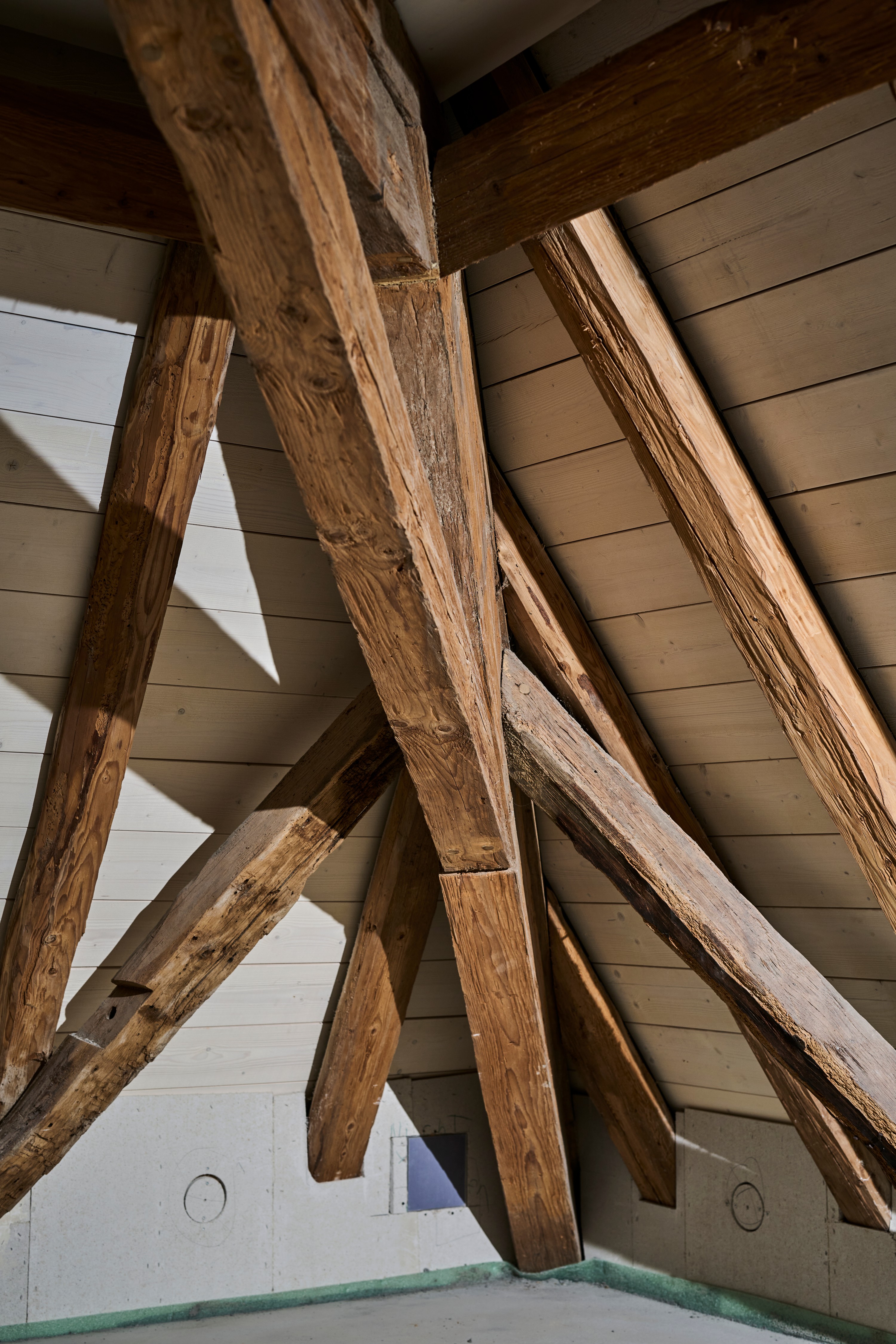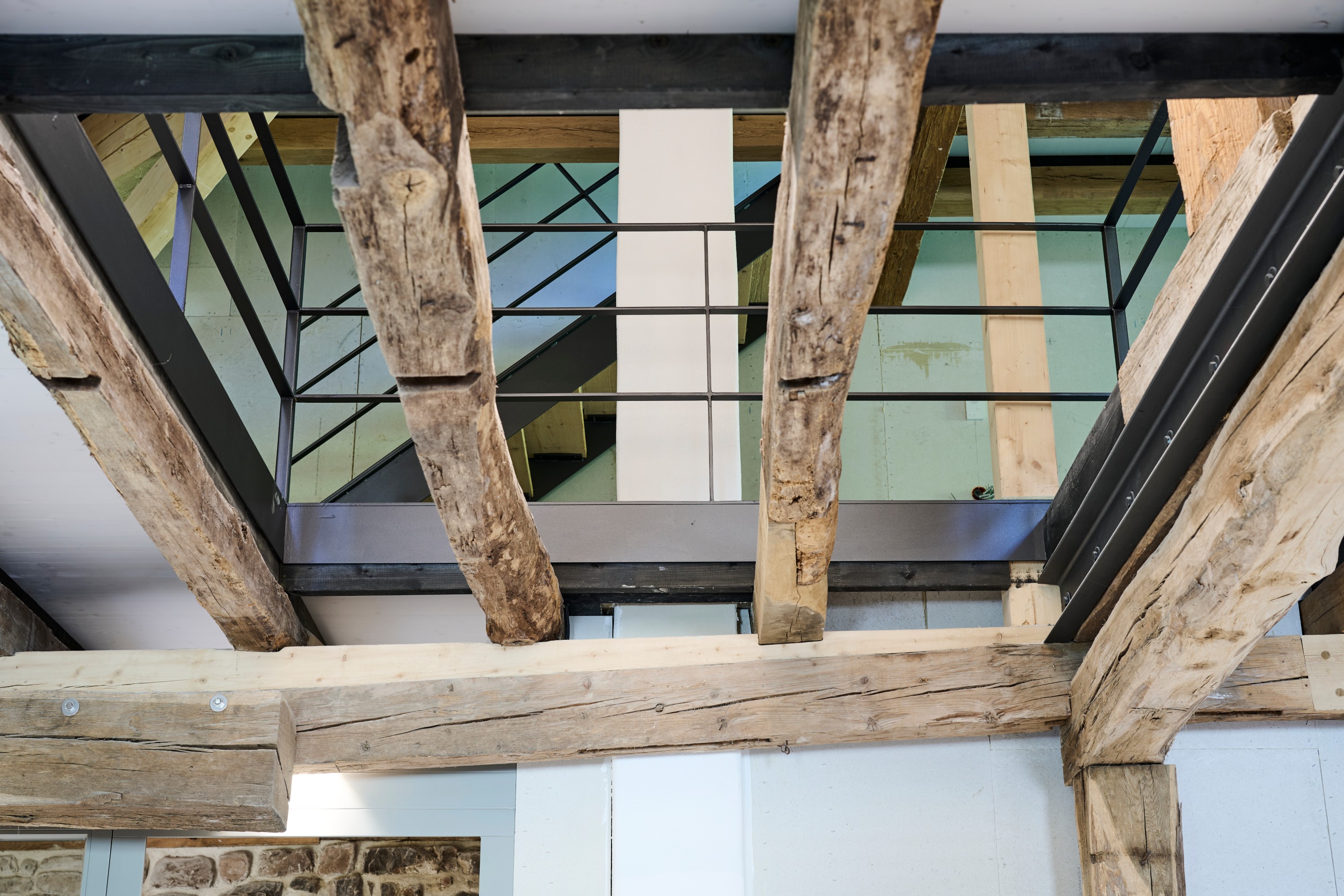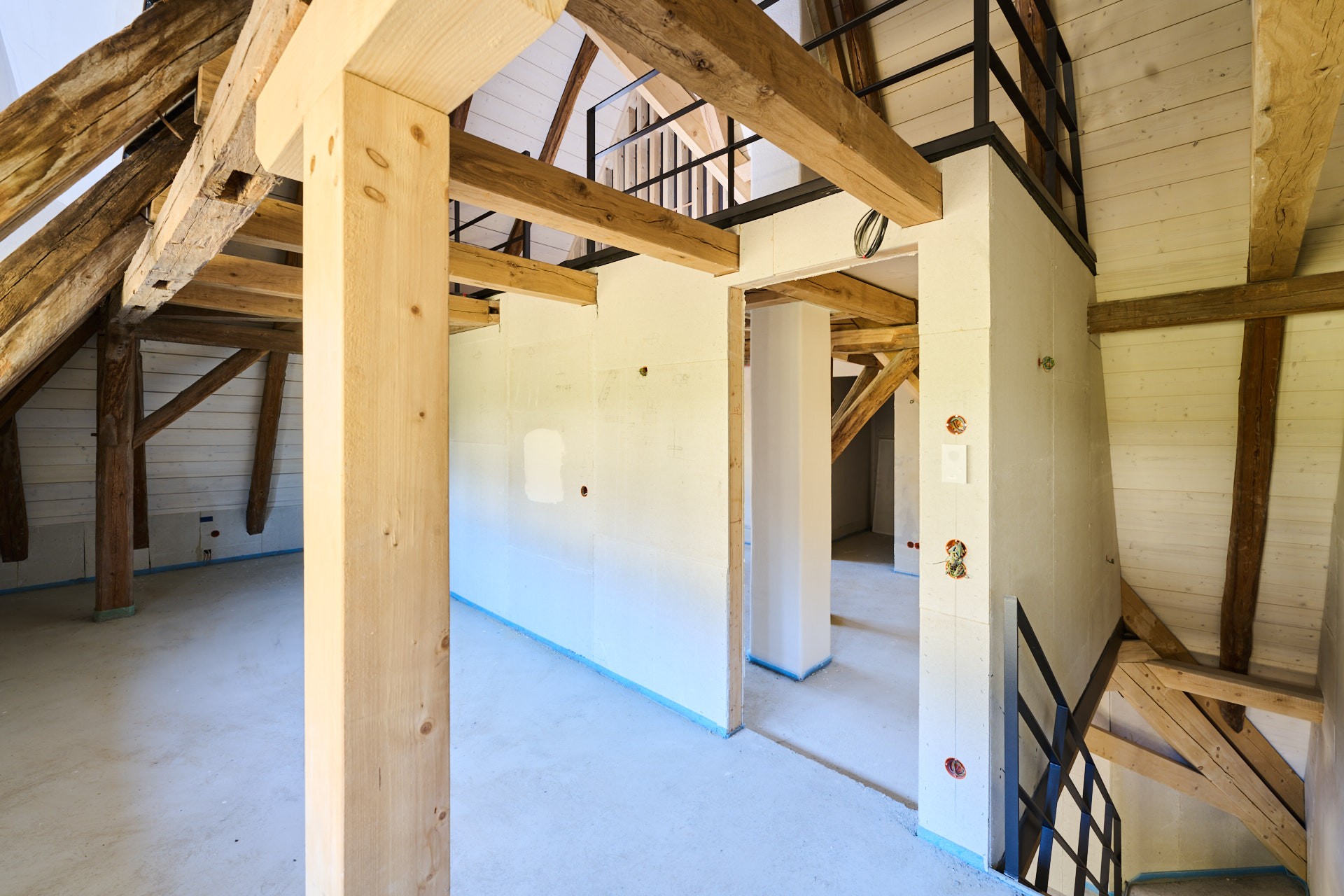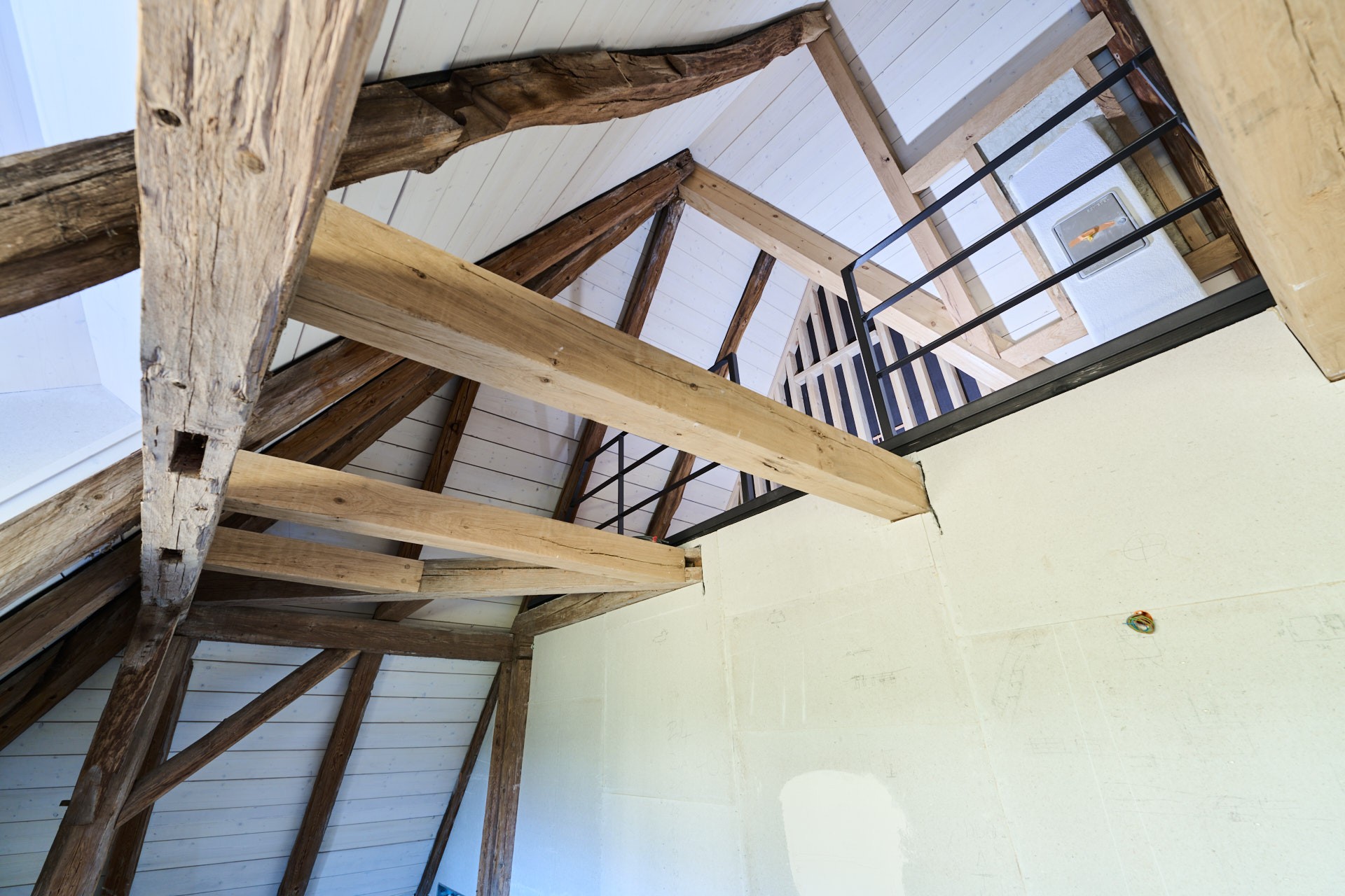 Im Innenraum beeindruckt das Bauwerk mit sichtbaren Holzbalken auf allen Etagen, die den ursprünglichen Charakter des Gebäudes unterstreichen und ein außergewöhnliches Ambiente erzeugen. Das teilweise freigelegte Sandstein-Sichtmauerwerk harmoniert mit den mit Lehmputz gestalteten Wänden und schafft ein gesundes Raumklima. Durch die umfangreichen Dämmmaßnahmen, insbesondere im Dachbereich mit Zellulose-Dämmung, erfüllt das Gebäude den geförderten KfW-Effizienzhaus-Denkmal-Standard – eine Seltenheit bei denkmalgeschützten Objekten.