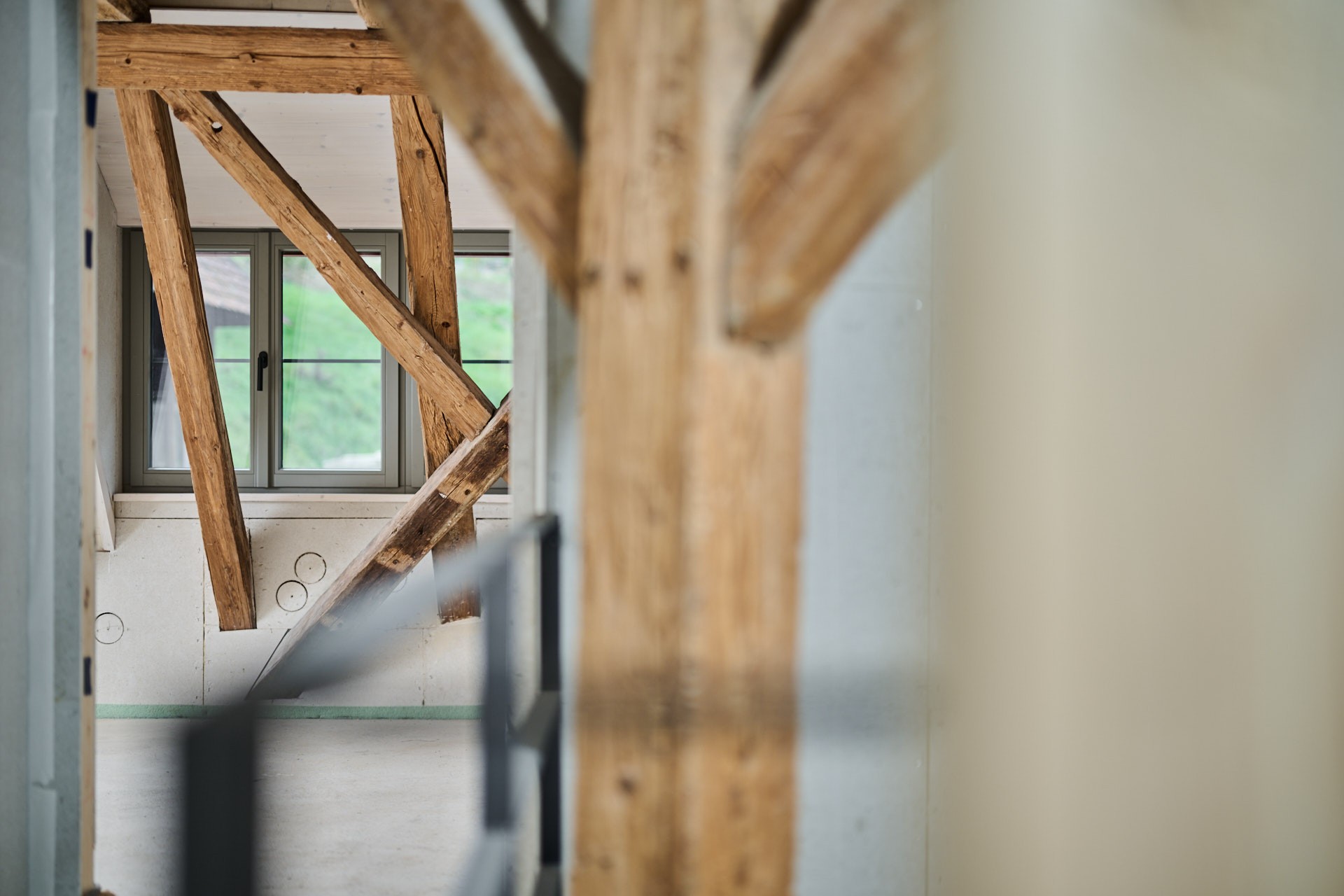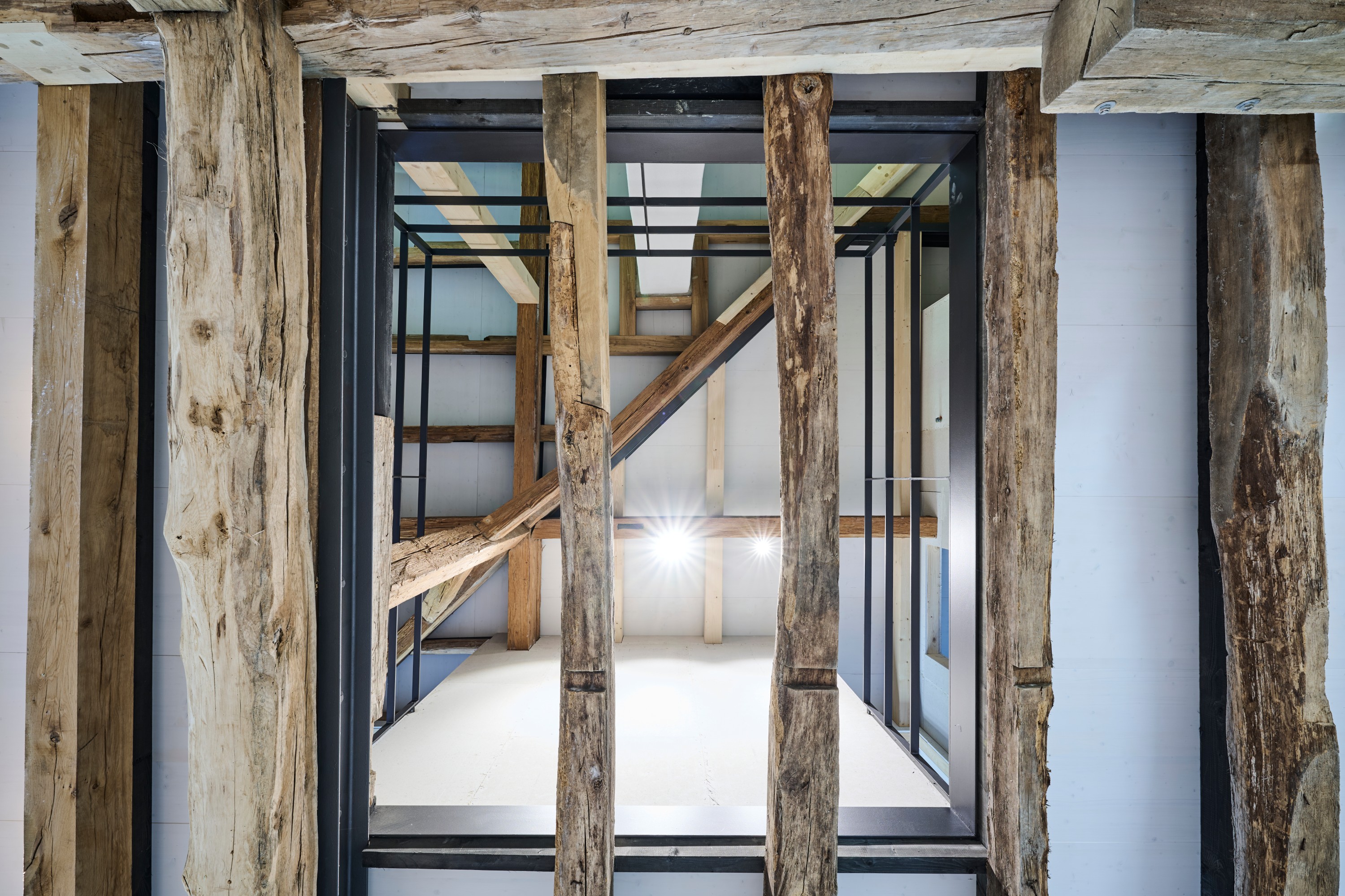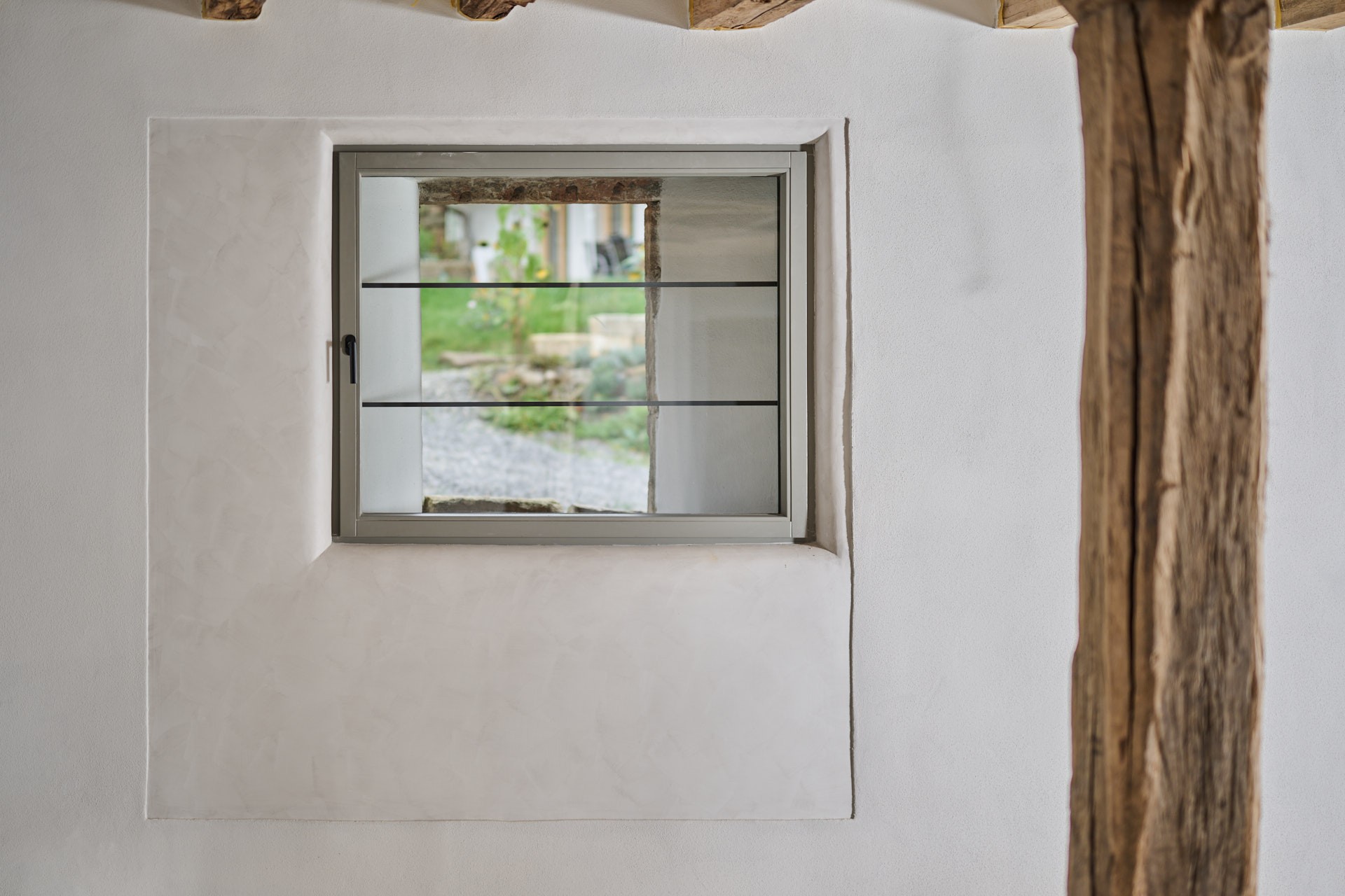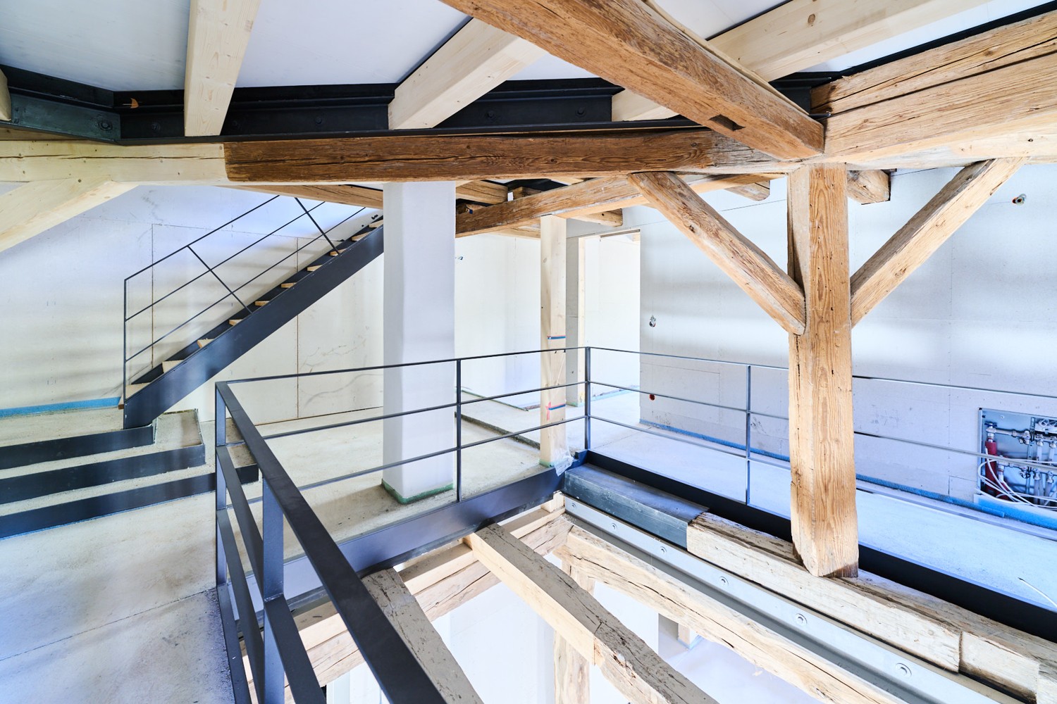 Im Innenraum beeindruckt das Bauwerk mit sichtbaren Holzbalken auf allen Etagen, die den ursprünglichen Charakter des Gebäudes unterstreichen und ein außergewöhnliches Ambiente erzeugen. Das teilweise freigelegte Sandstein-Sichtmauerwerk harmoniert mit den mit Lehmputz gestalteten Wänden und schafft ein gesundes Raumklima. Durch die umfangreichen Dämmmaßnahmen, insbesondere im Dachbereich mit Zellulose-Dämmung, erfüllt das Gebäude den geförderten KfW-Effizienzhaus-Denkmal-Standard – eine Seltenheit bei denkmalgeschützten Objekten.
