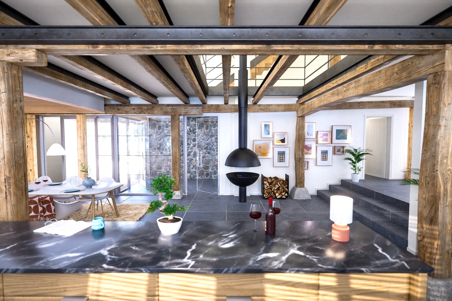 Das Raumambiente kann nur als "außergewöhnlich" beschrieben werden, was einerseits durch die erhaltene historische Bausubstanz, aber auch durch akzentuiert geschaffene, moderne Elemente erzeugt wird. Persönliche, individuelle Ausstattungswünsche können noch beim Endausbau realisiert werden, da dieser noch nicht abgeschlossen ist.