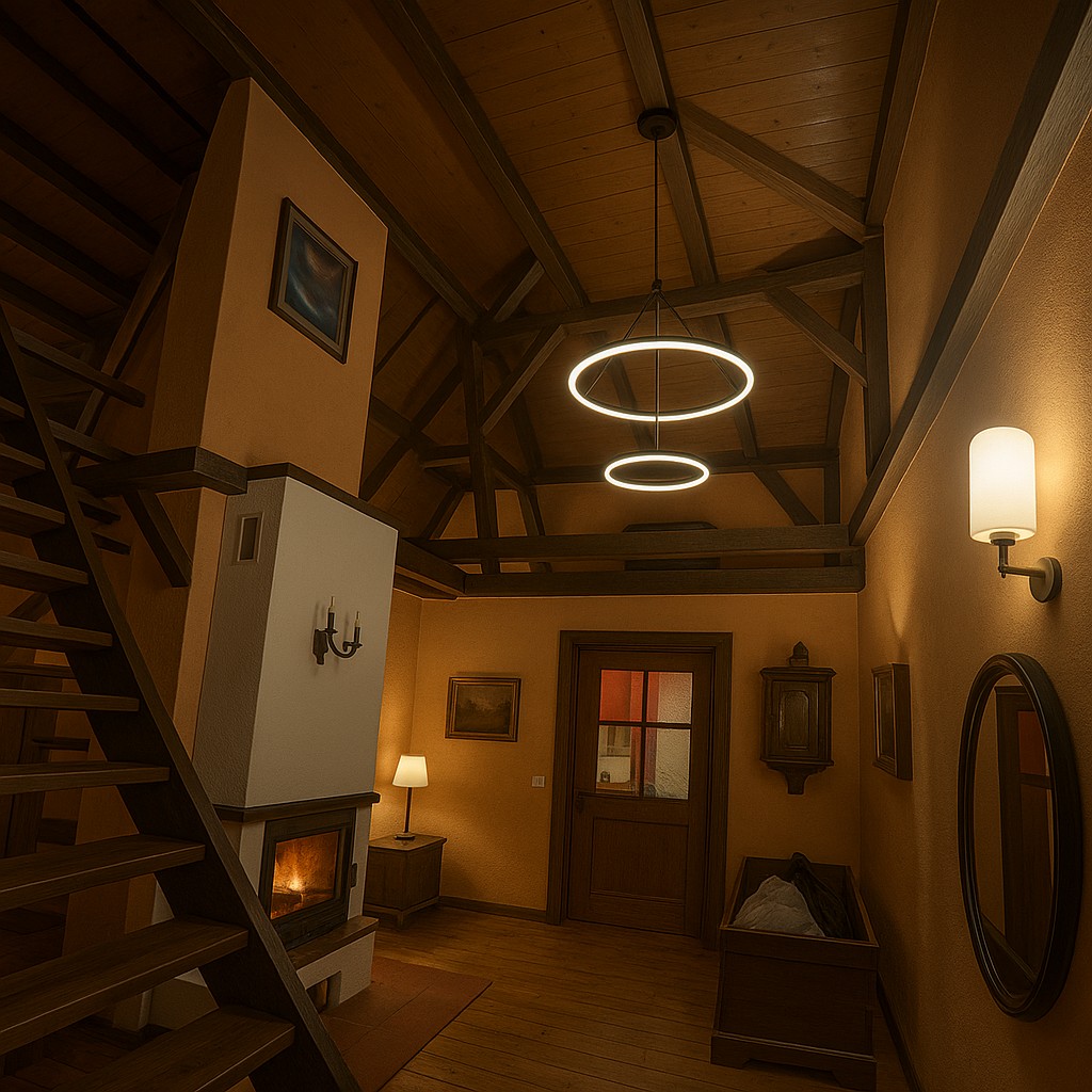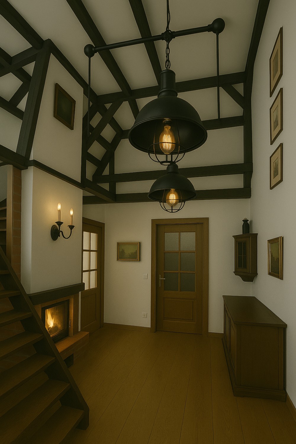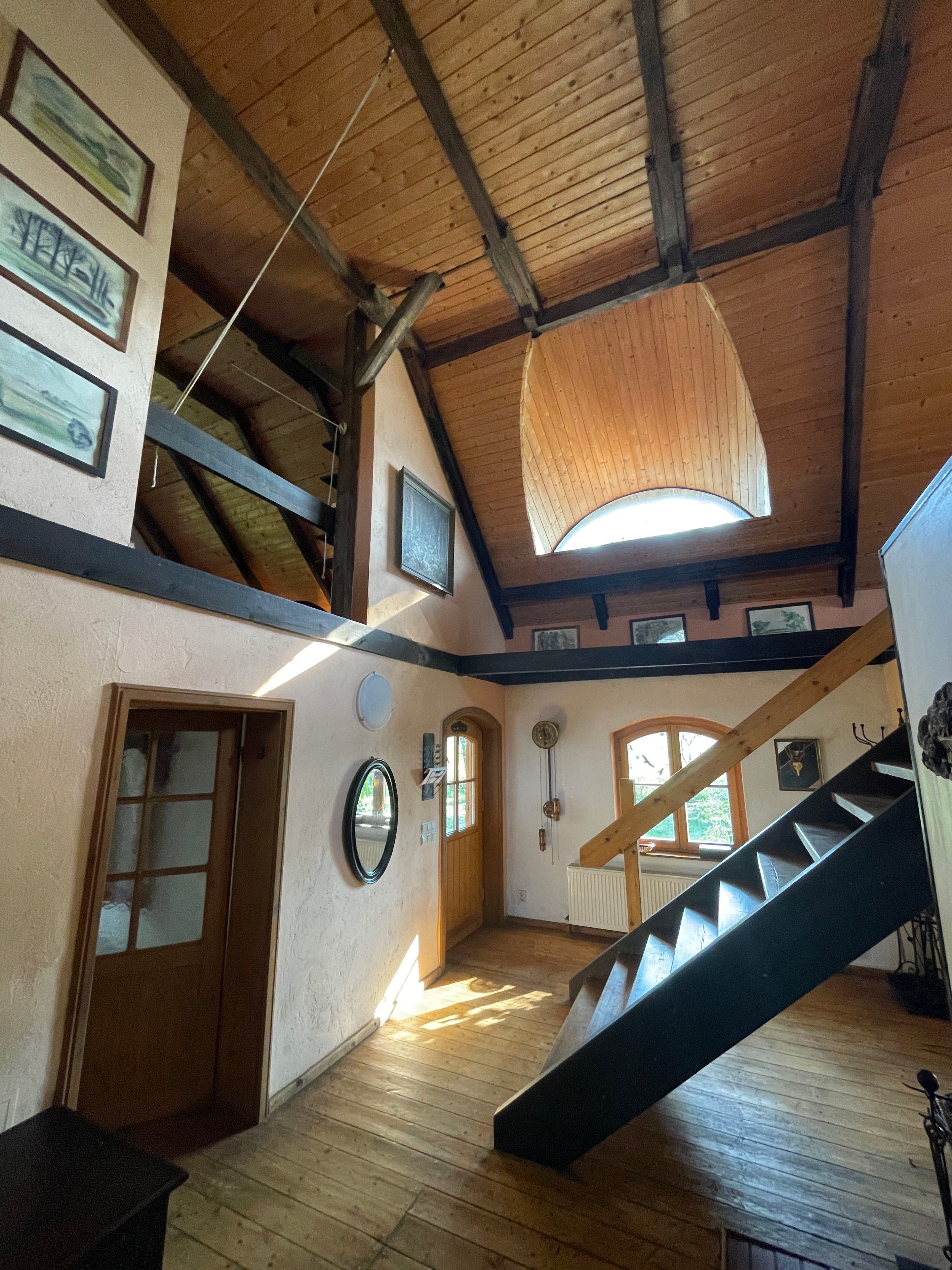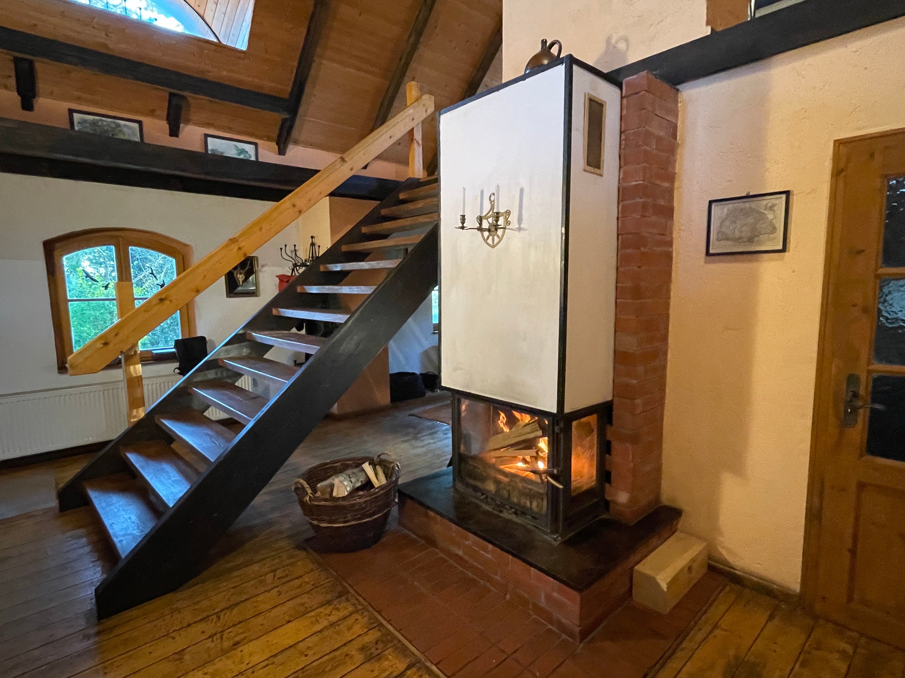 Vstupem hlavními dveřmi z terasy se dostanete do vstupní haly s krbem a otevřeným výhledem do druhého patra, které je přístupné širokým samostatně stojícím dřevěným schodištěm. Vlevo od schodiště se nachází útulný obývací pokoj s výhledem do zahrady. Ze vstupní haly se dá pokračovat do obytné kuchyně s oddělenou místností, do prostorné koupelny s rohovou vanou a sprchou, a do dílny s přístupem do sklepa.