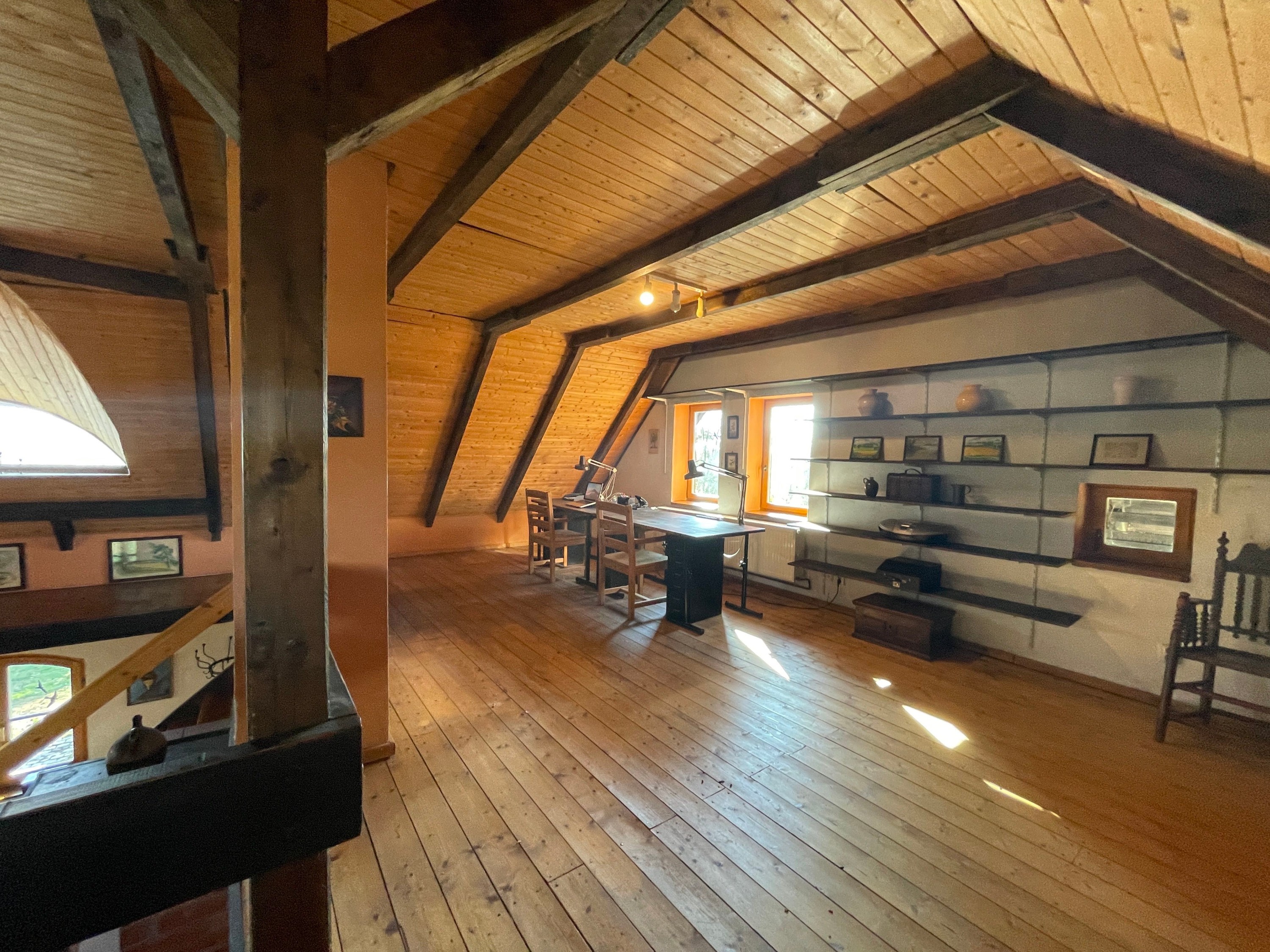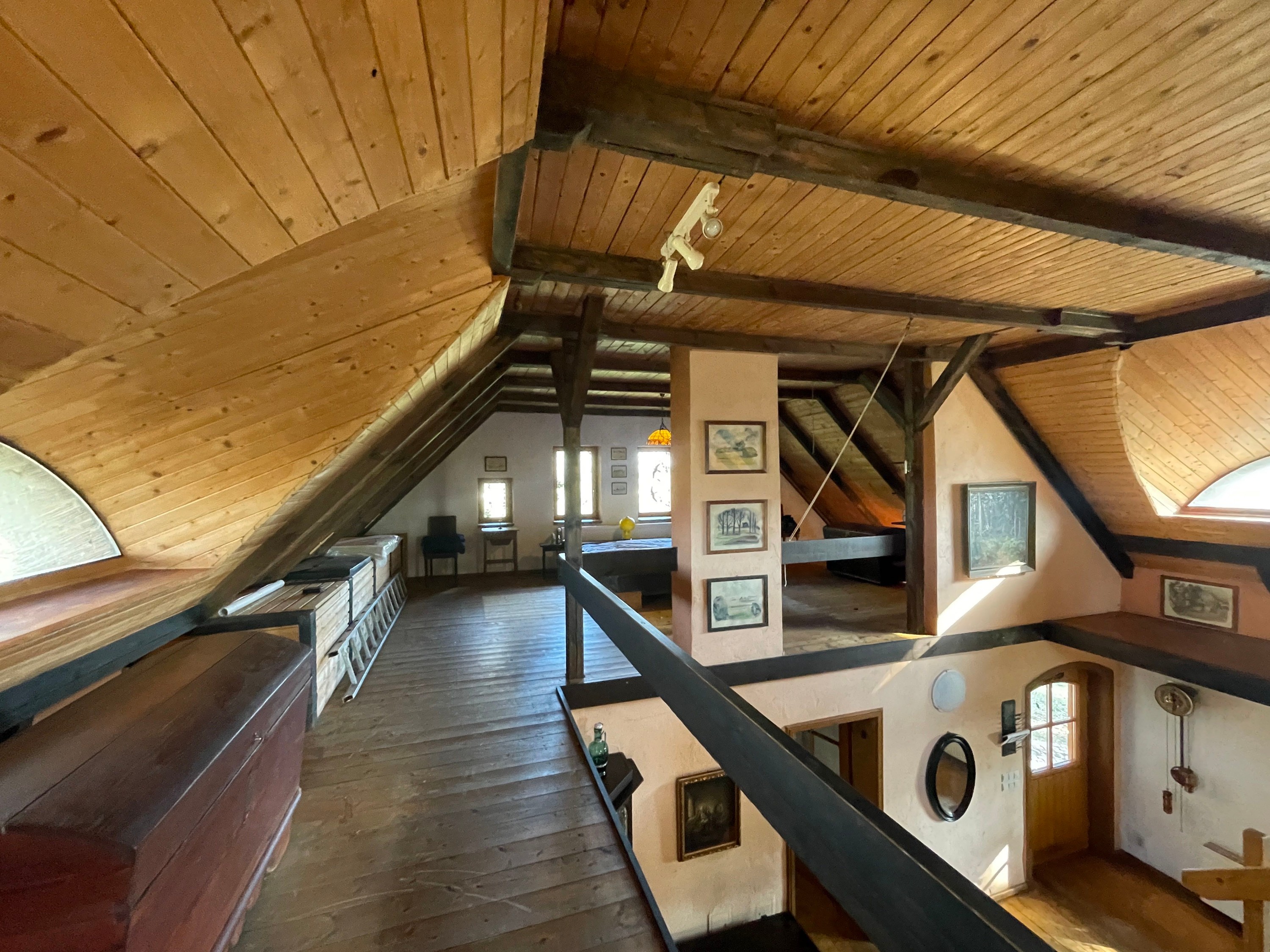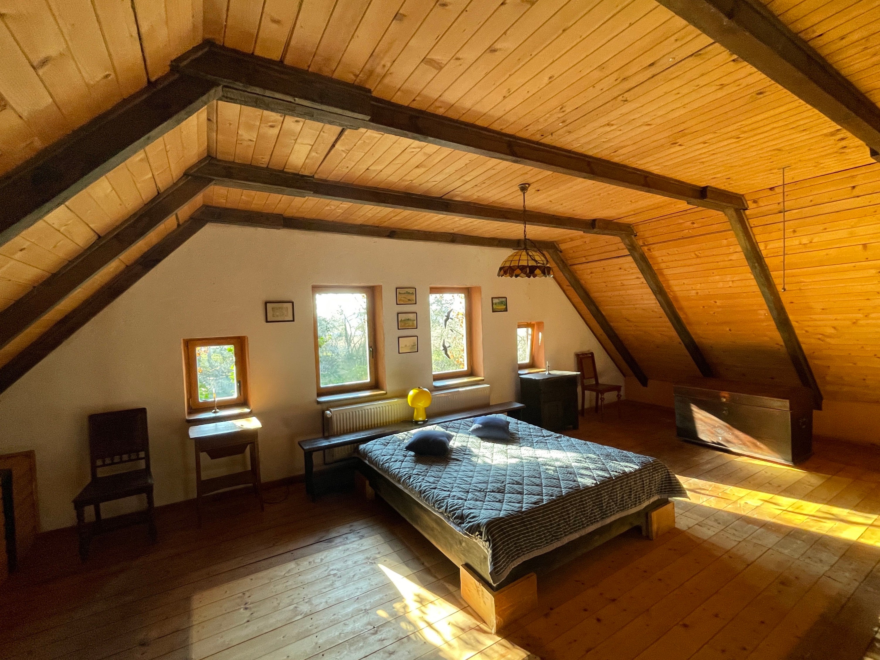 Druhé patro tvoří prostorný otevřený podkrovní prostor s dvěma protilehlými vikýři po stranách galerie a pracovním a ložnicovým koutem na štítových stranách.