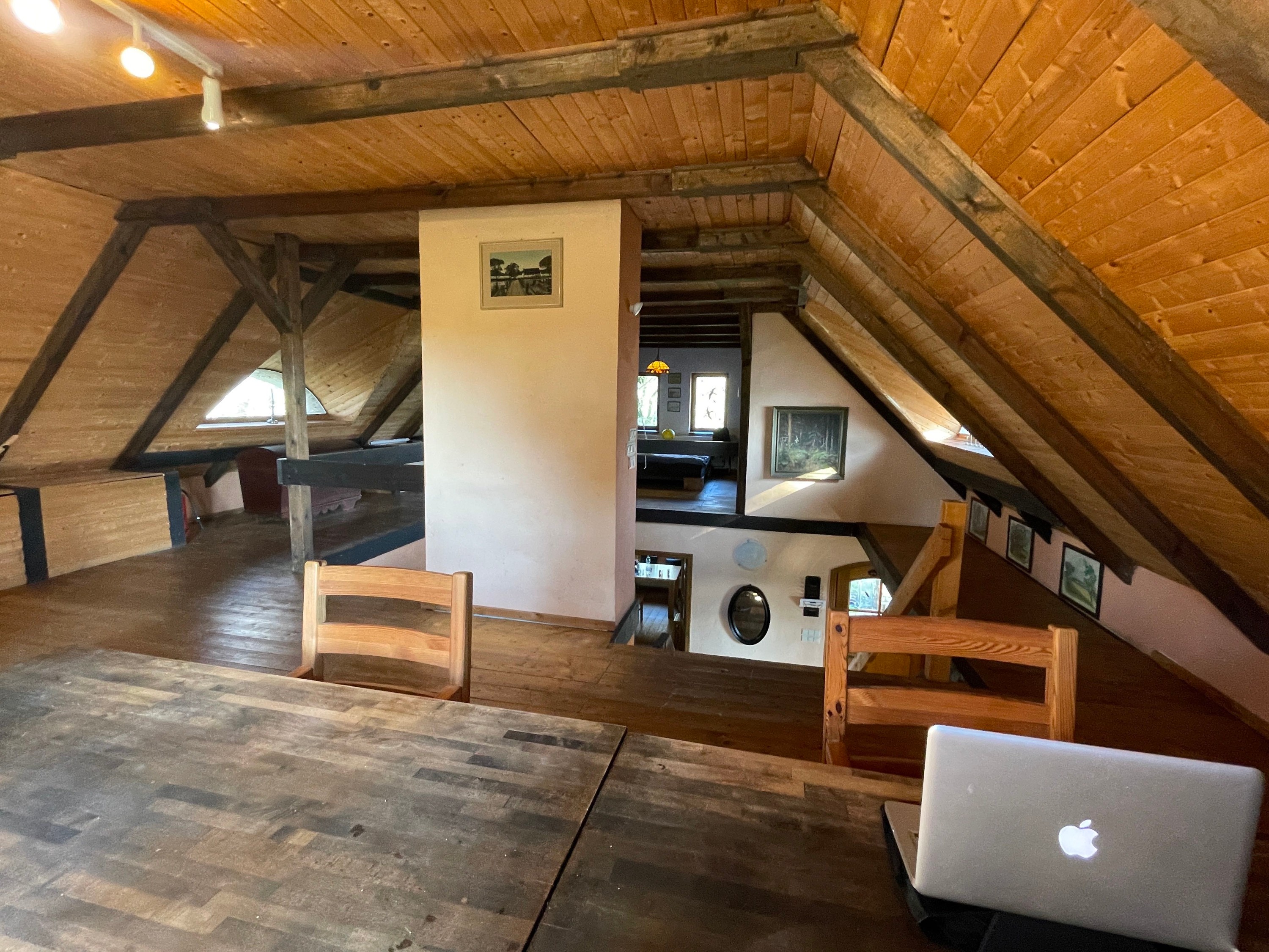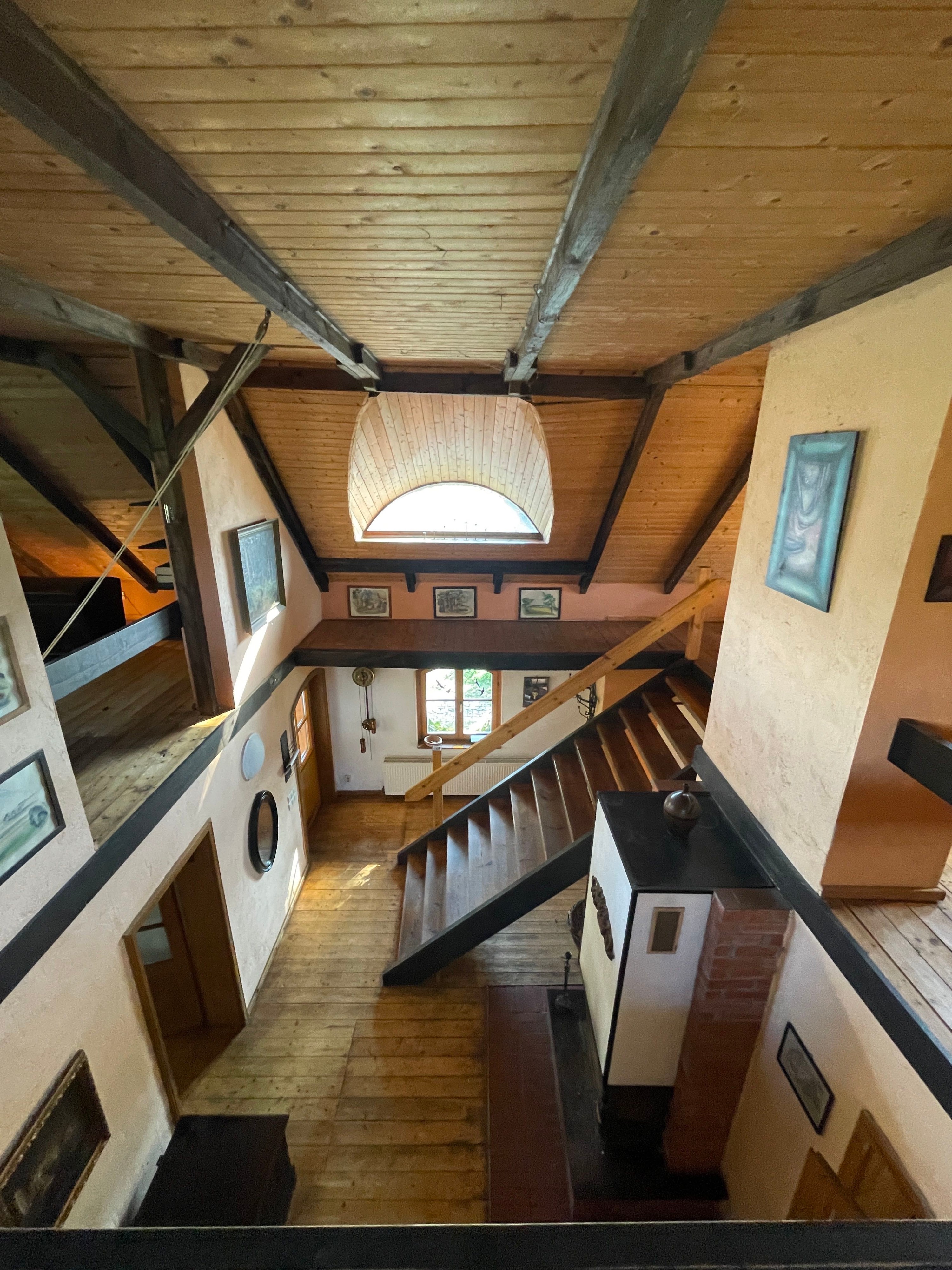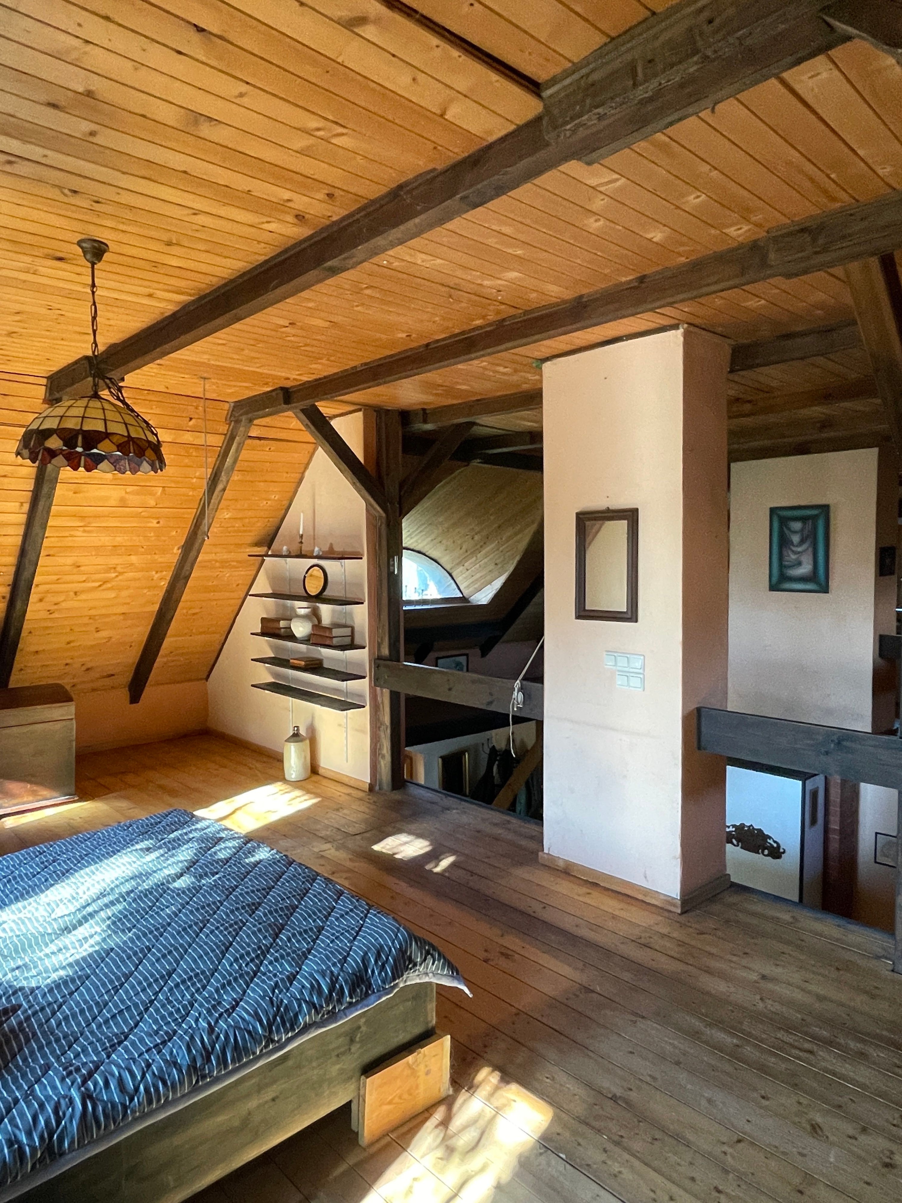 Druhé patro tvoří prostorný otevřený podkrovní prostor s dvěma protilehlými vikýři po stranách galerie a pracovním a ložnicovým koutem na štítových stranách.