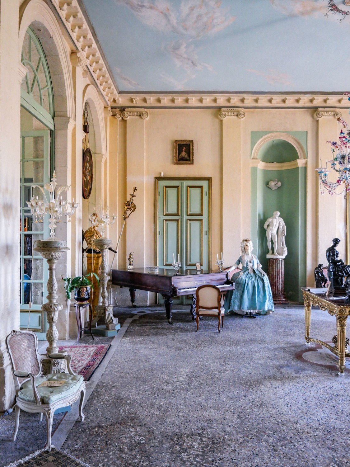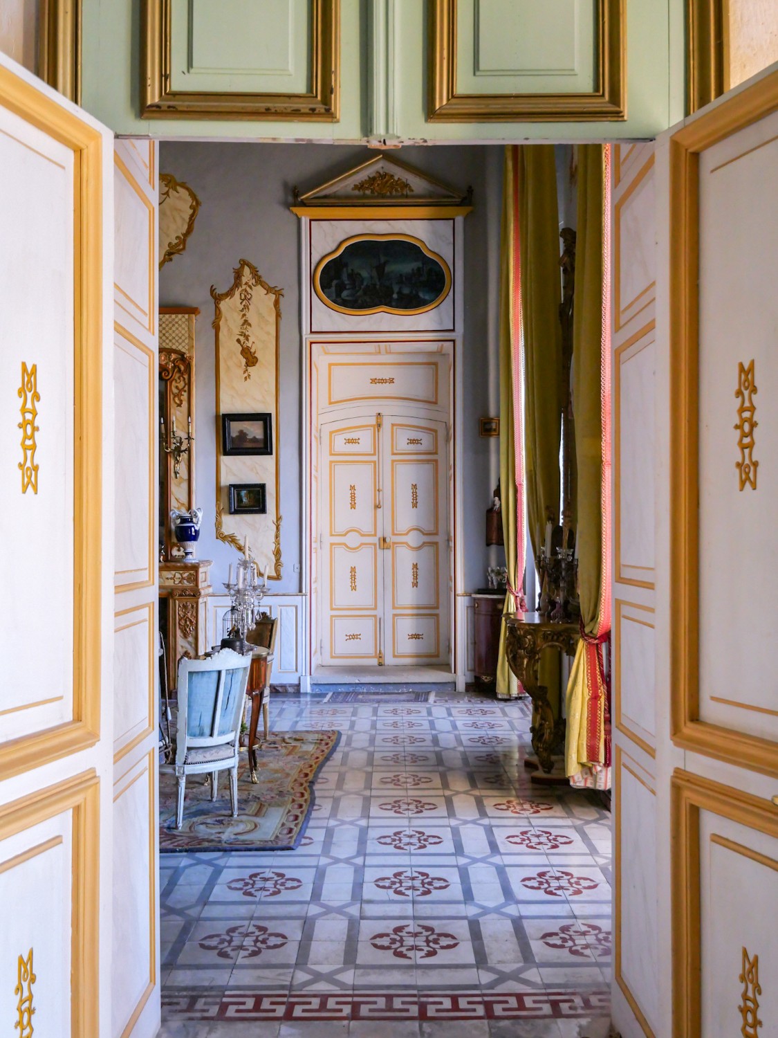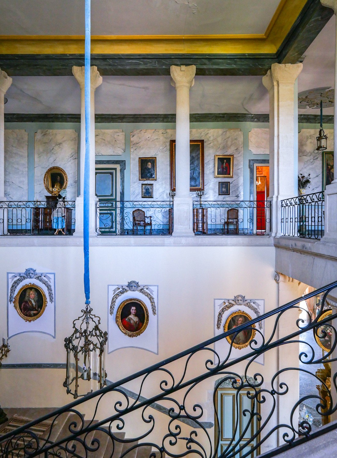 Centrální hala s výškou stropu 5,3 metru a bohatým denním světlem se otevírá do Grand Salonu o ploše 80 m². Jónské pilastry a monumentální sloupy doprovázejí majestátní schodiště, které vede přímo do horního patra, kde balkony vytvářejí dramatický výhled do haly. Schodiště je považováno za jedno z nejkrásnějších soukromých schodišť 18. století ve Francii.