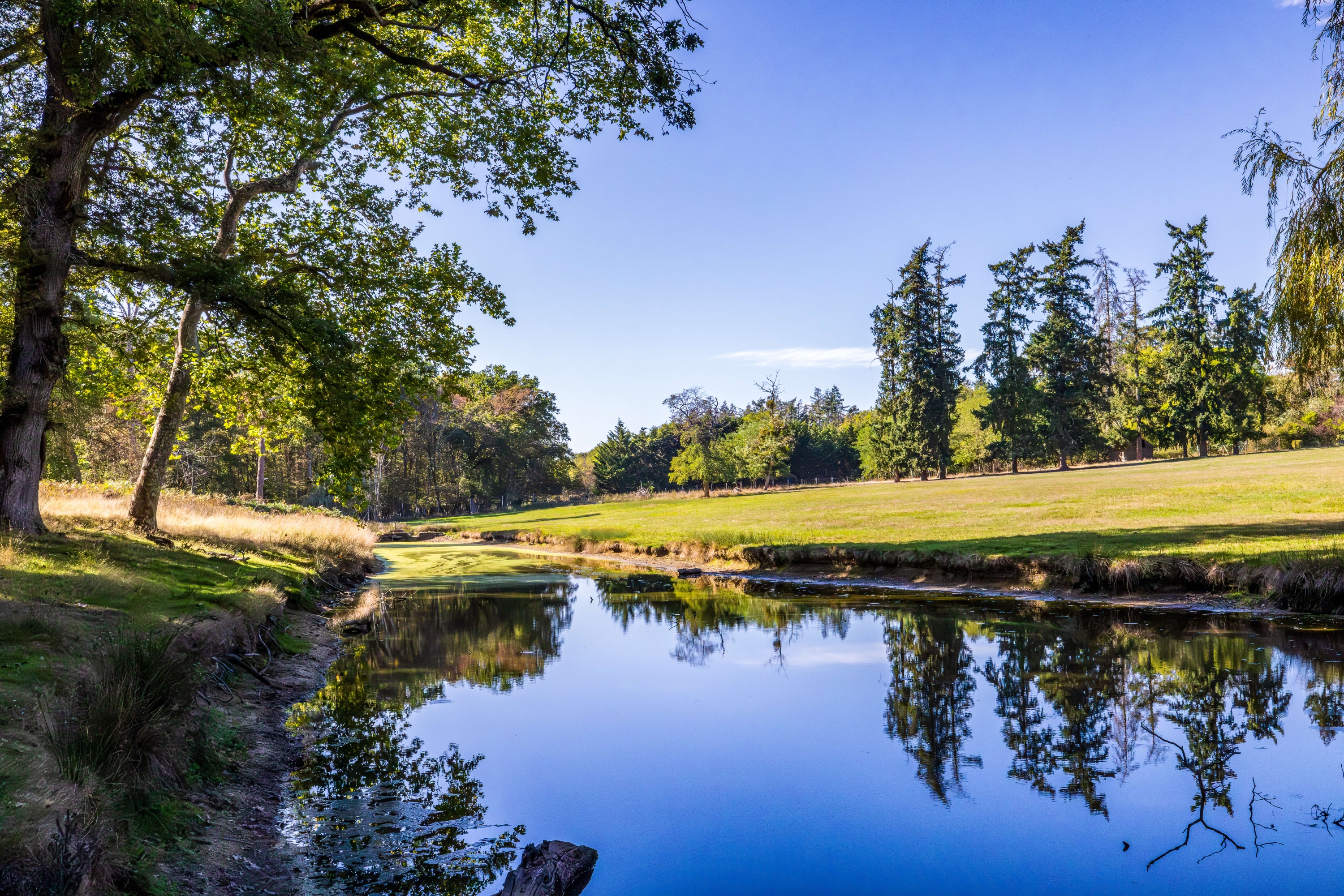 Před zámečkem se rozprostírá přibližně patnáctihektarový krajinářský park. Otevřené louky, vzácné druhy stromů, rybník a kaštanová alej tvoří prostředí, které vybízí k procházkám a vnímání přírody. Zde není krajina ovládána, ale vnímána – dusot kopyt, vítr v listí a světelné odlesky vytvářejí tichý dialog mezi člověkem a historickým prostředím.