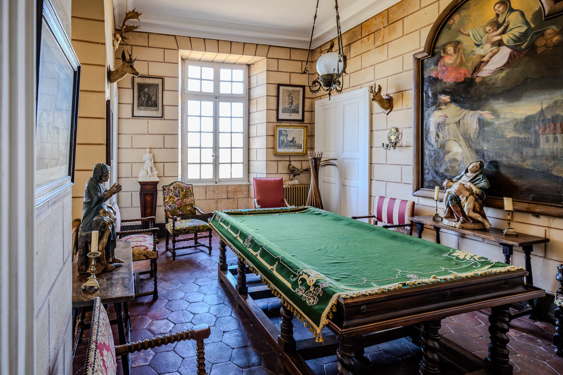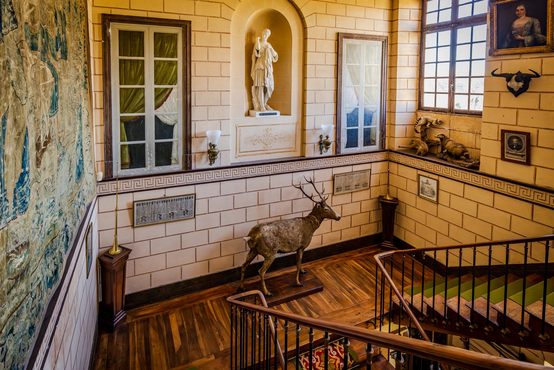 Interiéry odpovídají zřetelné hierarchii: reprezentativní a soukromé části jsou důsledně oddělené, ale harmonicky propojené. Z velkolepého vstupního prostoru vede monumentální schodiště do vyšších pater. Obytné prostory – slavnostní sály, společenské místnosti a jídelna – na sebe plynule navazují. V patře jsou soukromé pokoje, předpokoje, budoáry a prostorné ložnice. Vedlejší místnosti, technické zázemí a chodby byly včleněny s ohledem na funkčnost a eleganci celku.