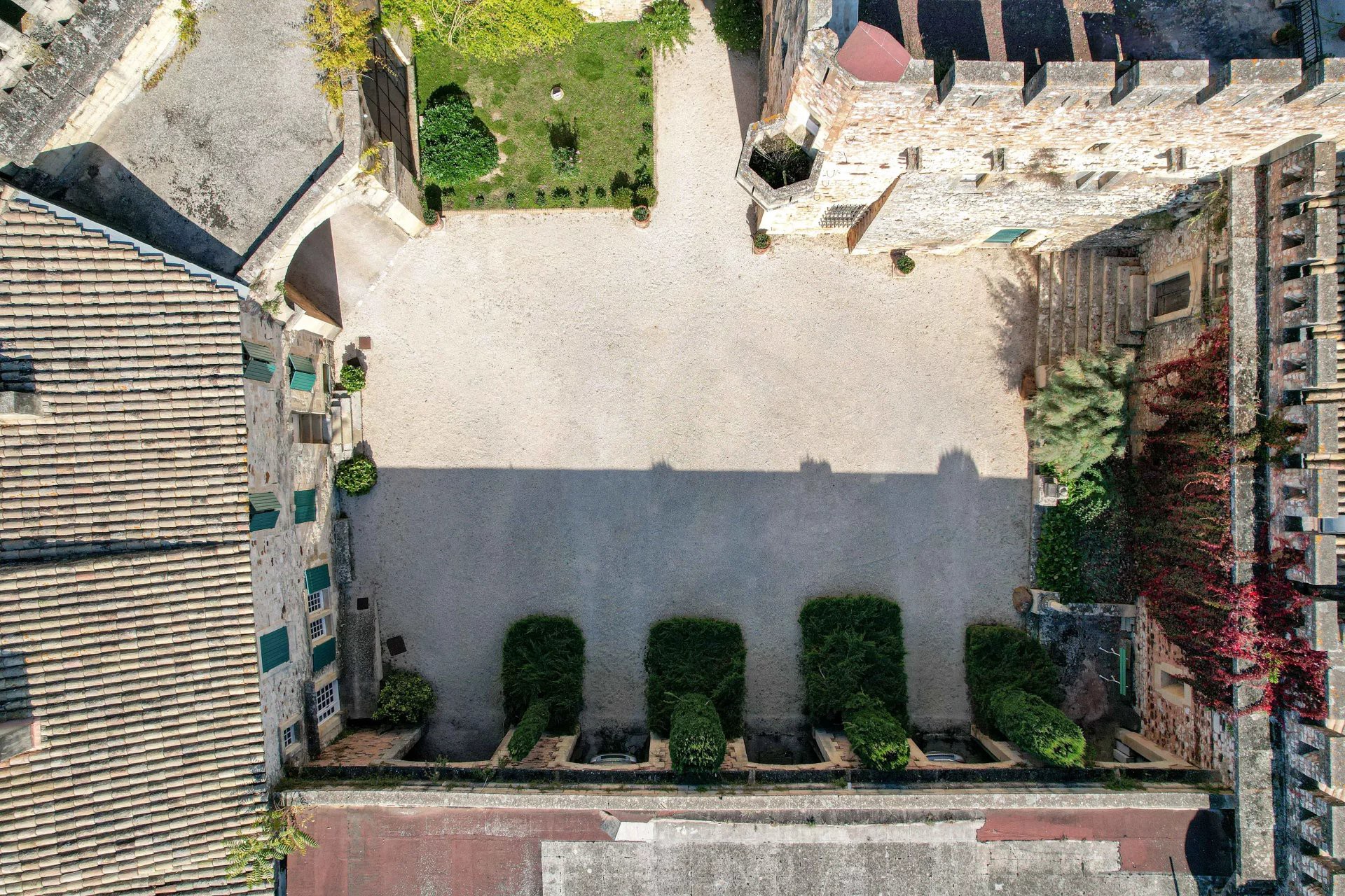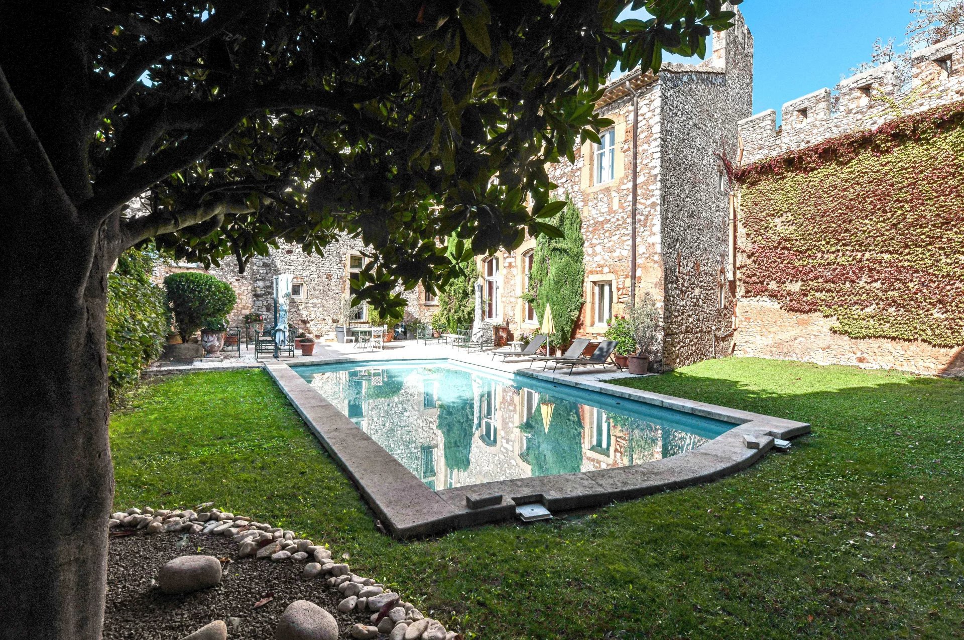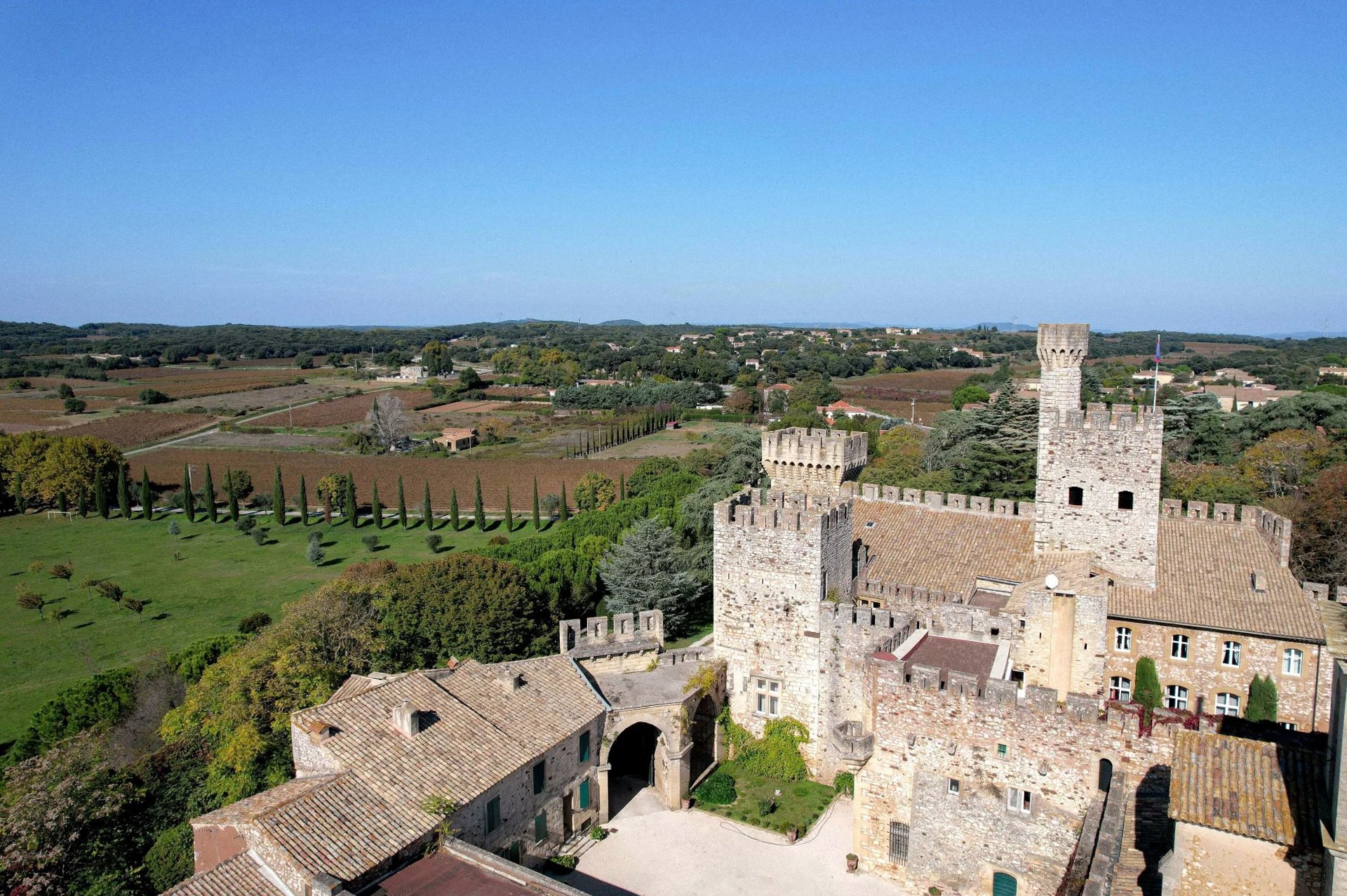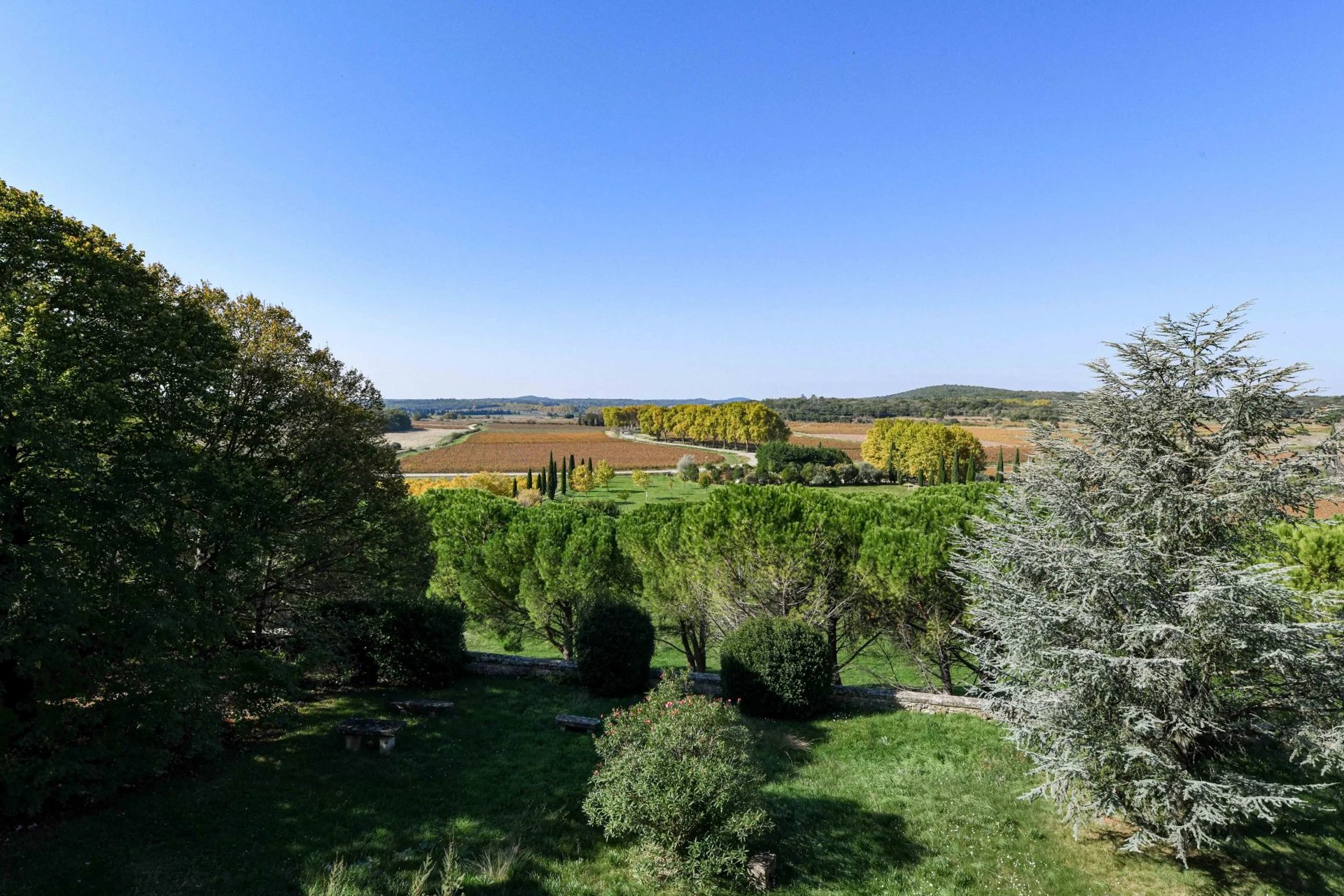 Uzavřený park se rozkládá na 1,17 hektaru a nabízí soukromí typické pro podobné nemovitosti. Z teras a věží se otevírá široký výhled na klidnou krajinu mezi Uzès a Avignon.