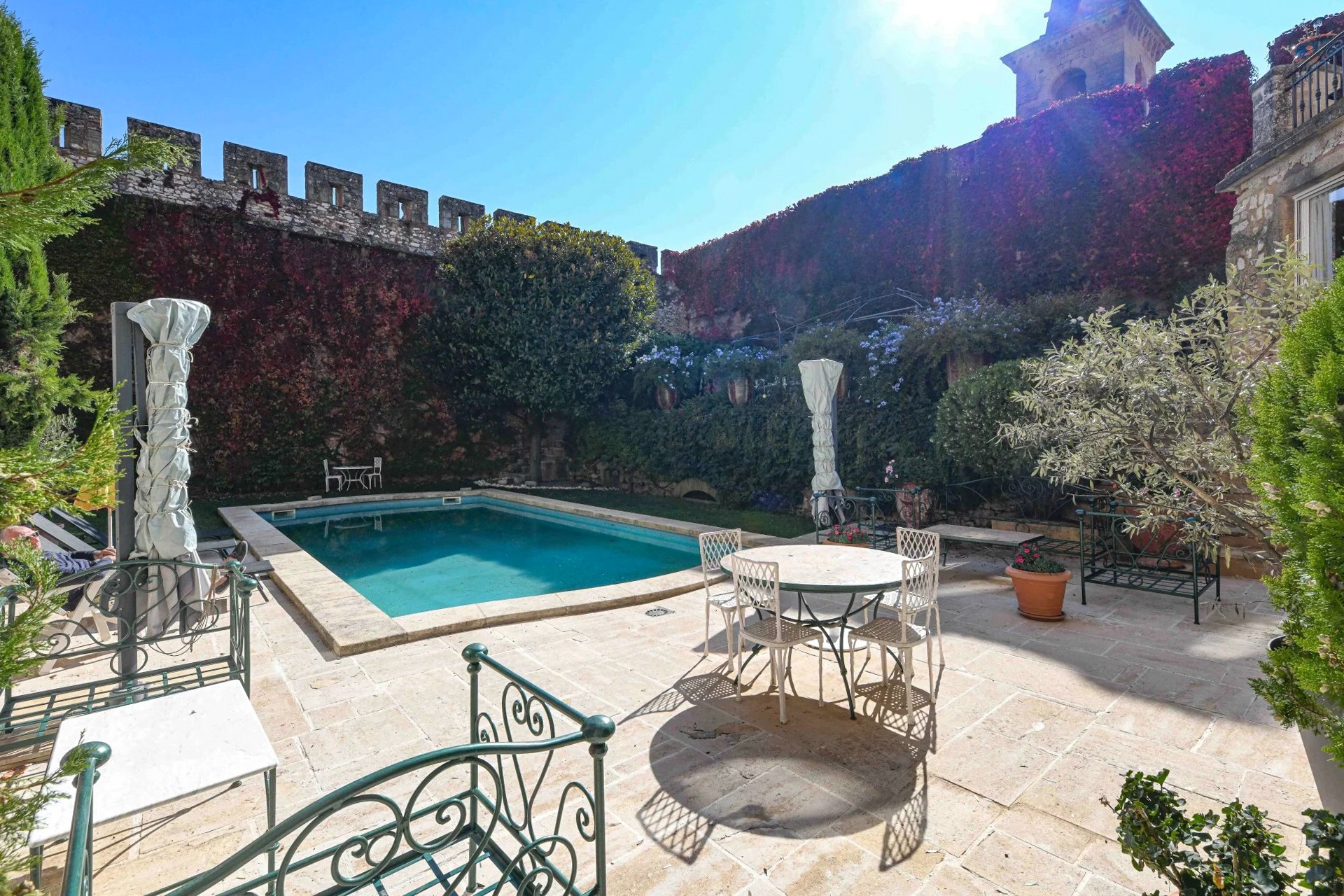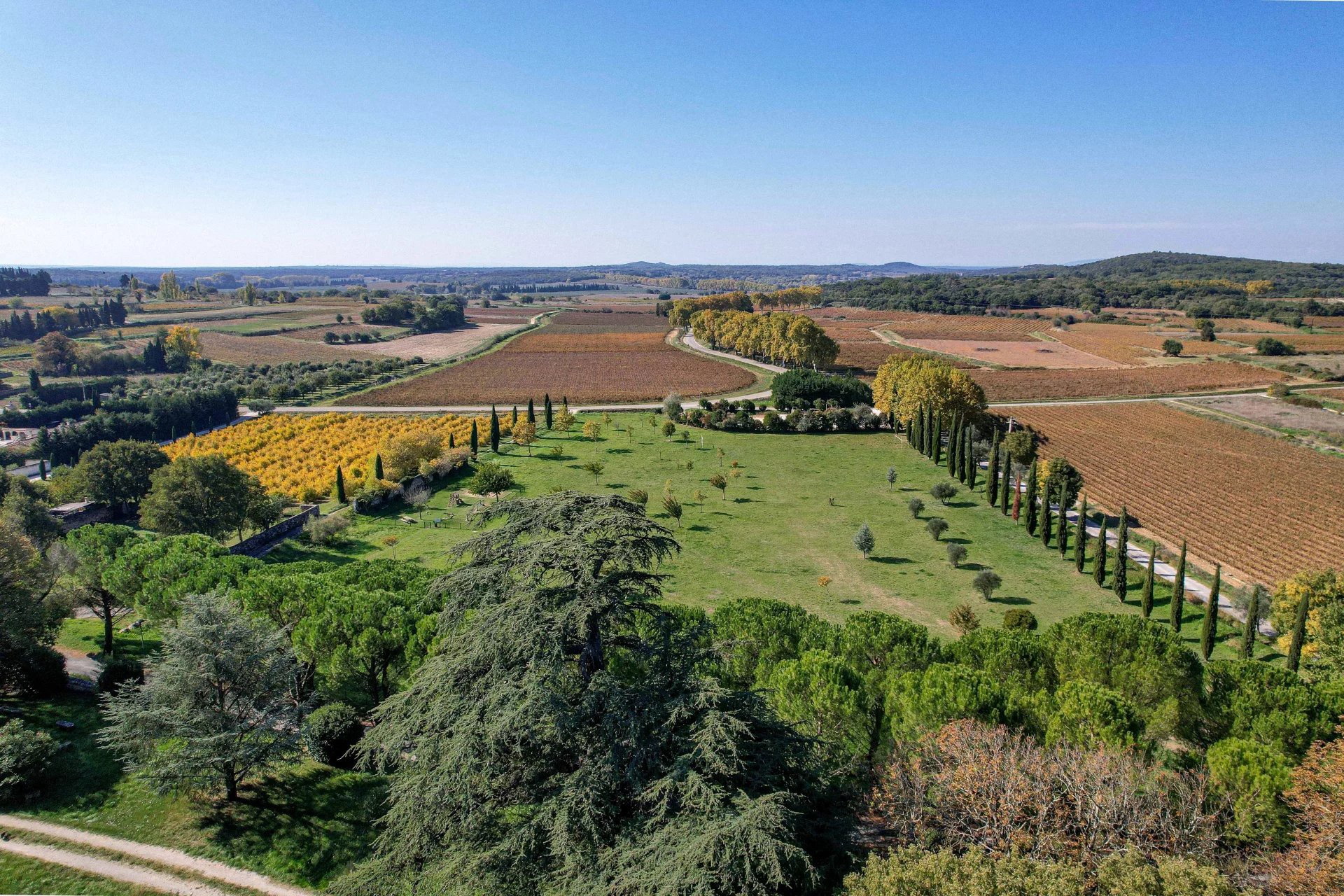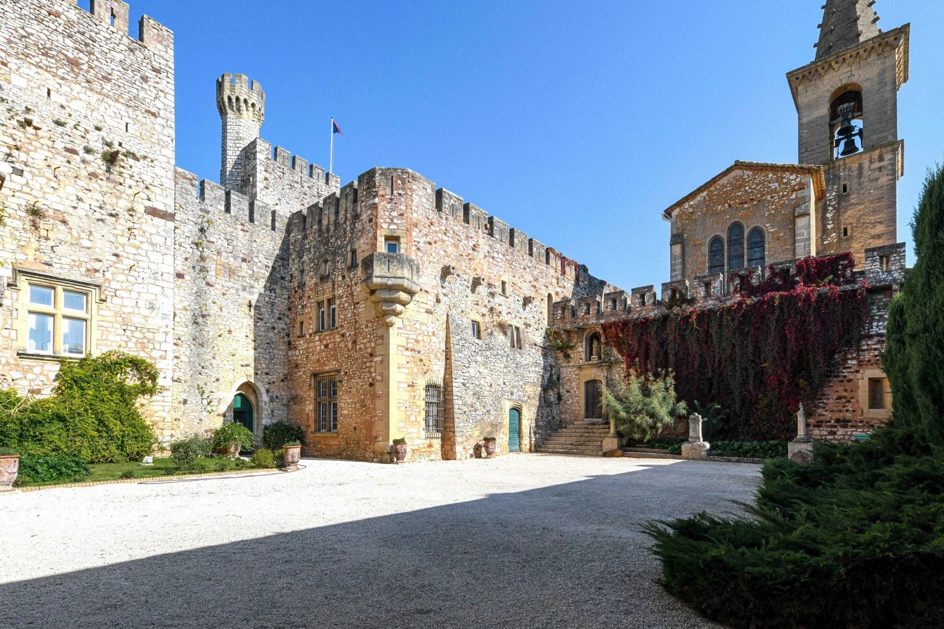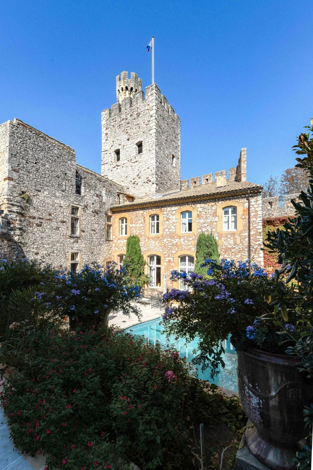 Uzavřený park se rozkládá na 1,17 hektaru a nabízí soukromí typické pro podobné nemovitosti. Z teras a věží se otevírá široký výhled na klidnou krajinu mezi Uzès a Avignon.