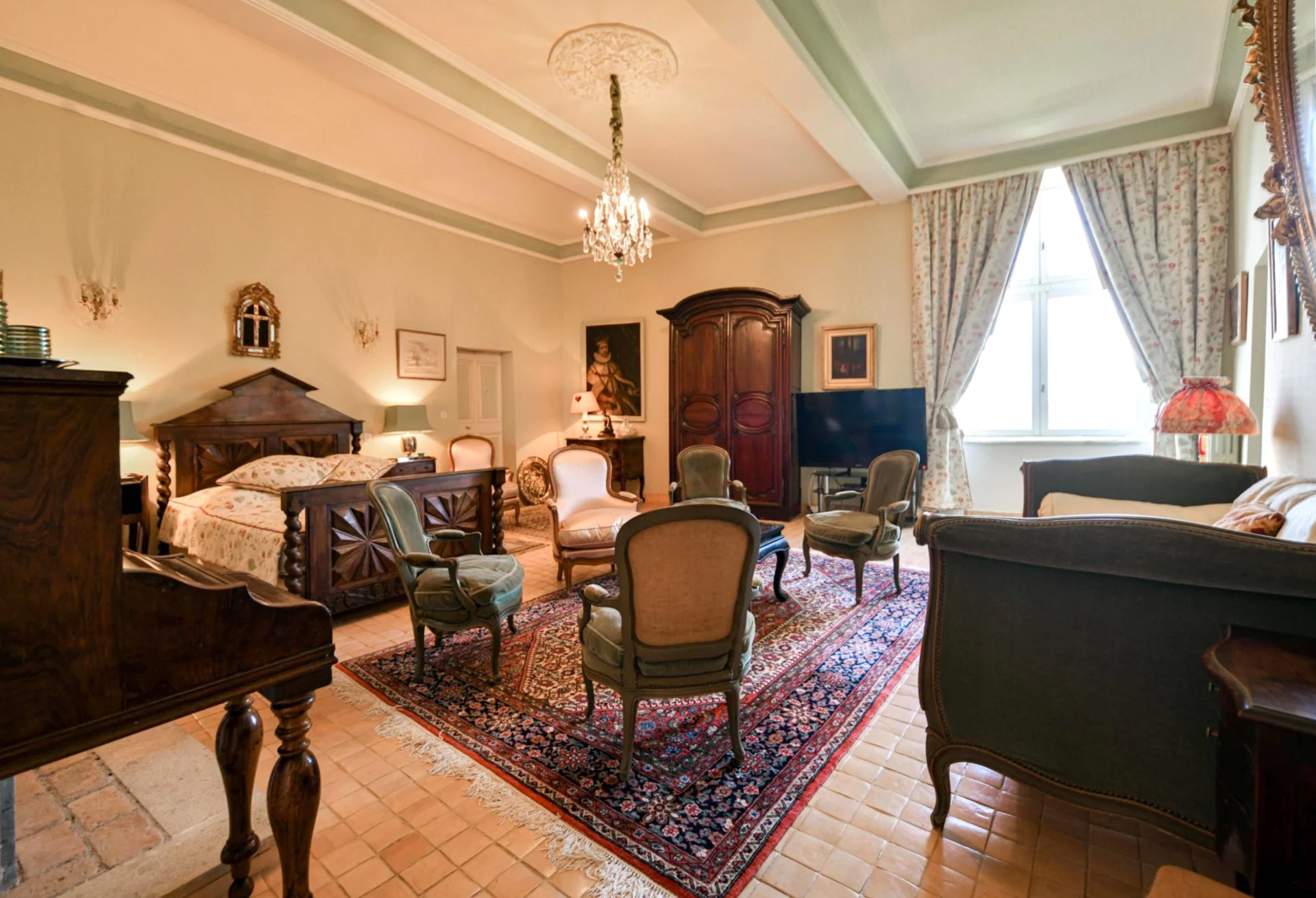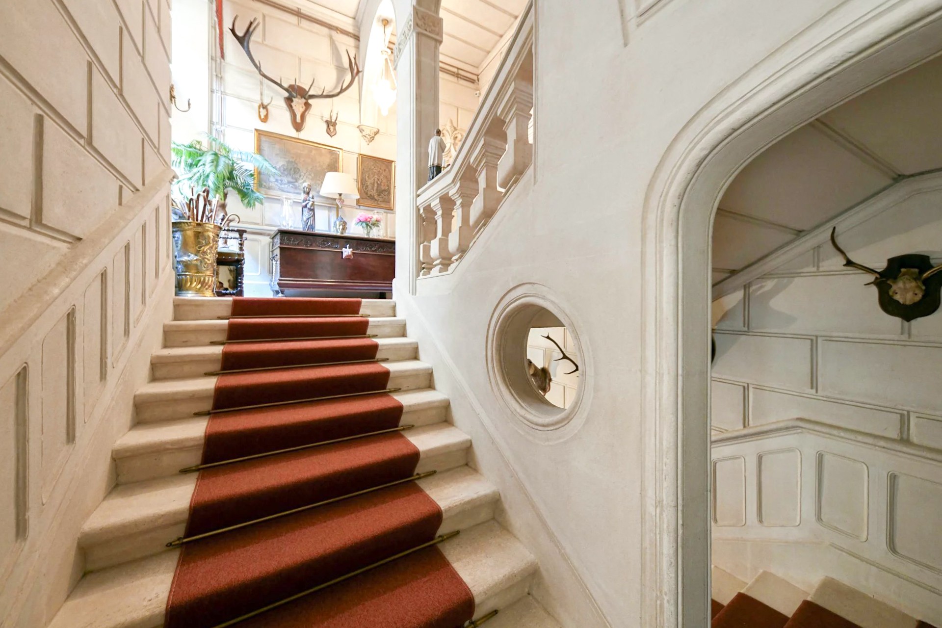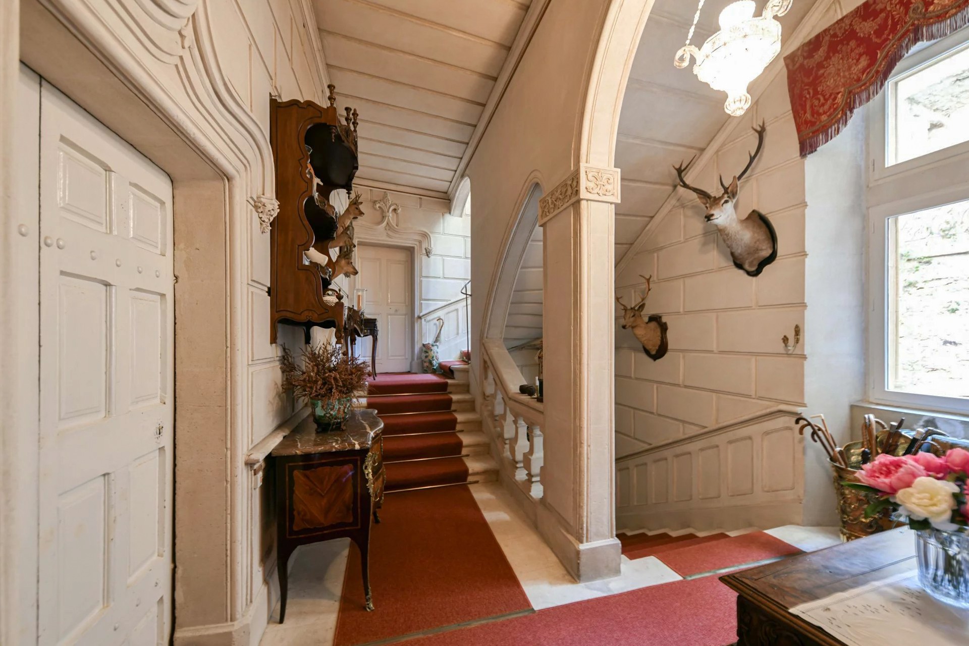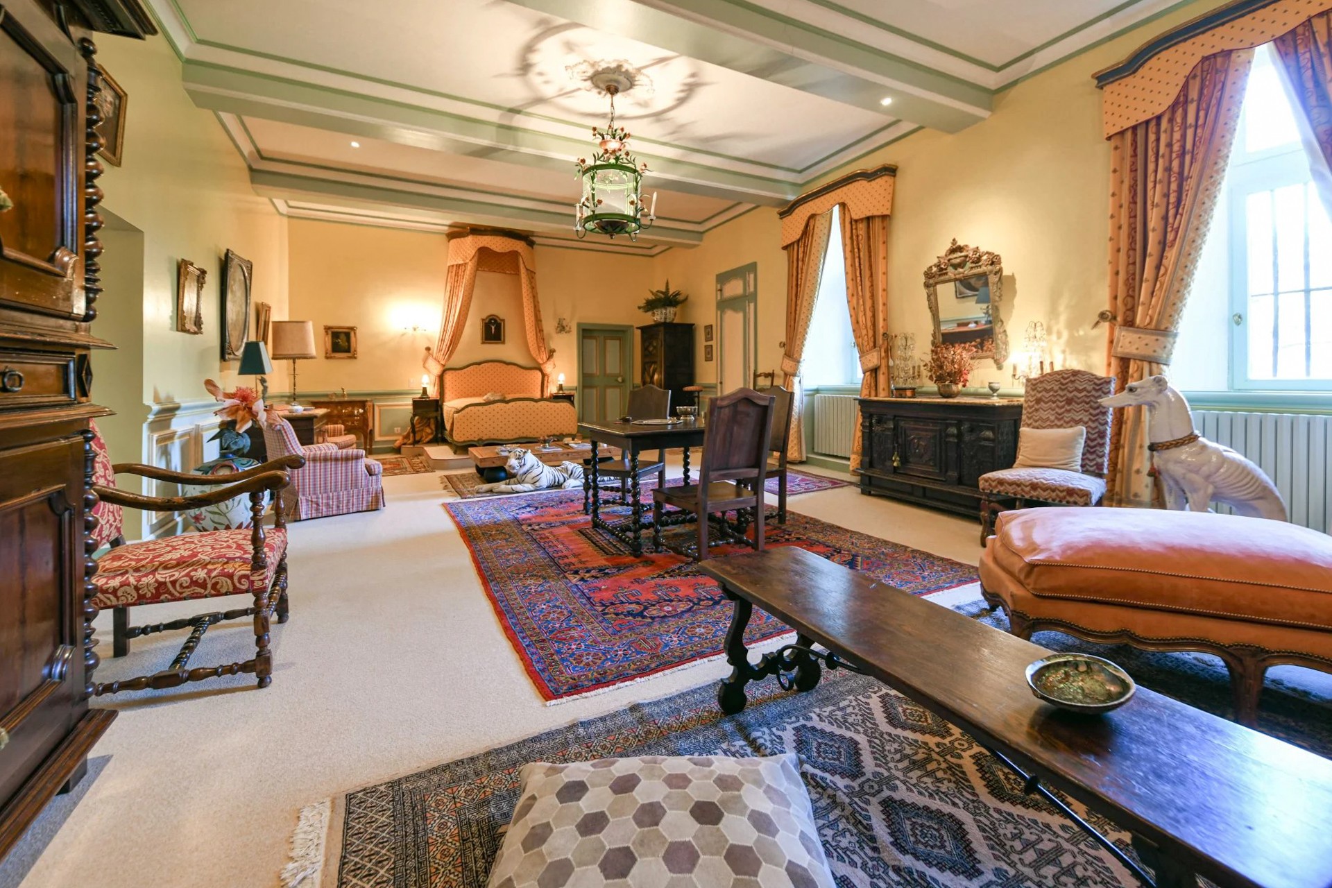 Hlavní budova se rozkládá na třech patrech. V přízemí přivítá prostorný klenutý salón s originálním stropem ze 17. století. Nádherné schodiště vede do prvního patra, kde se harmonicky propojují reprezentační místnosti: dva salony s vysokými okny, jídelna s krbem a knihovna. Z dlouhé chodby se vstupuje do hlavní suite o rozloze 100 m² s výhledem do parku.