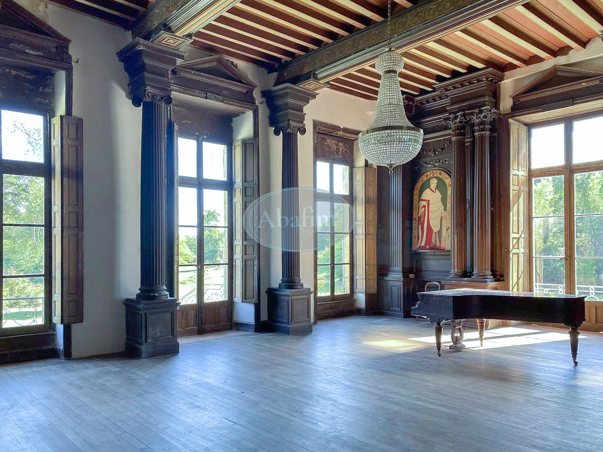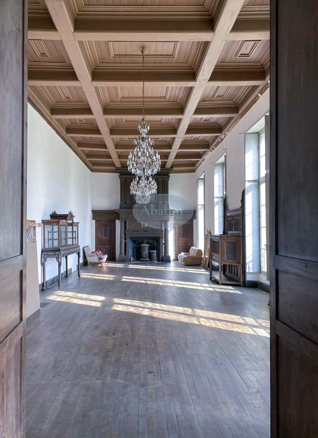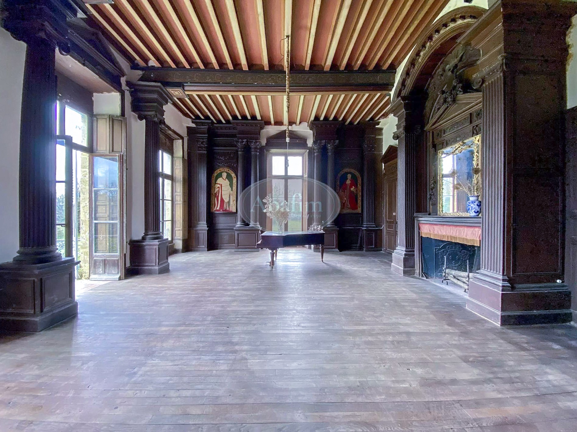 Hlavní budova nabízí více než 2.000 m² užitné plochy. Centrální vstupní hala s terakotovou podlahou a dřevěnými obklady vede do reprezentativních místností. Dva sály o rozloze přibližně 90 m² každý tvoří přízemí: první s monumentálním krbem, dubovou parketou a kazetovým stropem; druhý s vyřezávanými sloupy, dřevěnými obklady a tapisériemi zakládajících rodin. Druhý sál se otevírá do parku impozantním venkovním schodištěm. Stropy přes 5 metrů a četná okna zajišťují světlé a vzdušné prostory. Salon kompletně obložený dřevem o ploše 45 m² uzavírá enfiládu.