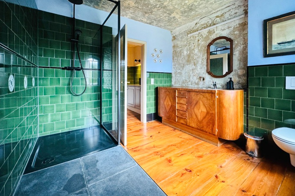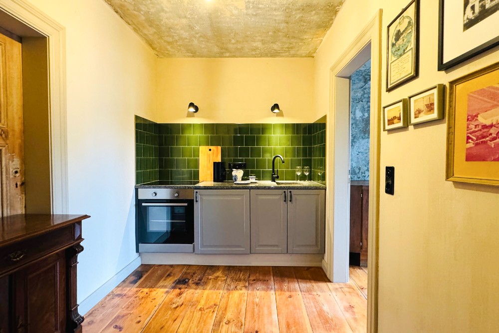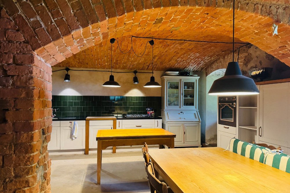 Prodávaná polovina zámečku se otevírá na pečlivě zrestaurovaný interiér. V klenutém suterénu se zachovala stará panská kuchyně s útulnou litinovou kamnou. V přízemí je dokončený malý apartmán pro hosty s vlastním sociálním zařízením; vedle se nachází kuchyně, jídelna a salon, které plynule navazují na téměř dokončenou terasu. V prvním patře se nachází několik ložnic a samostatná část pro hosty propojená s půvabnou věží, která je momentálně využívána jako ložnice. Toto patro rovněž nabízí velký prostor pro další rozšíření.
