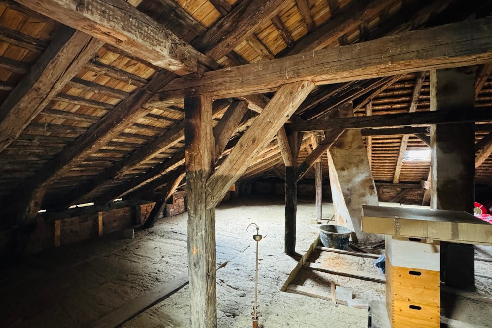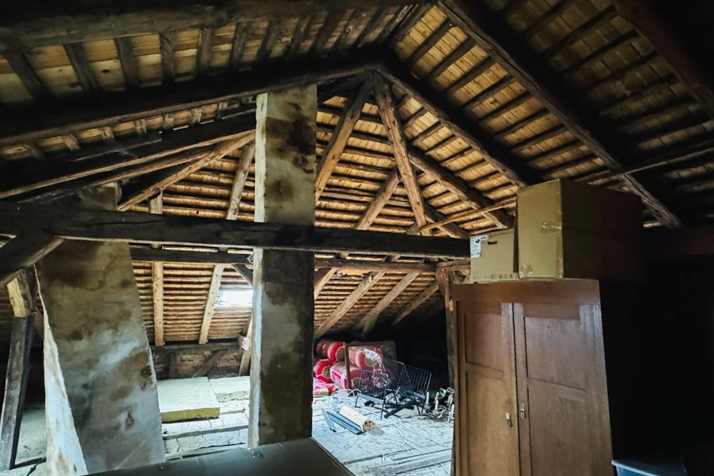 Střecha je pokryta asfaltovými šindeli; krovy jsou v dobrém stavu, samotná krytina však vyžaduje obnovu, což poskytuje prostor pro vlastní úpravy.