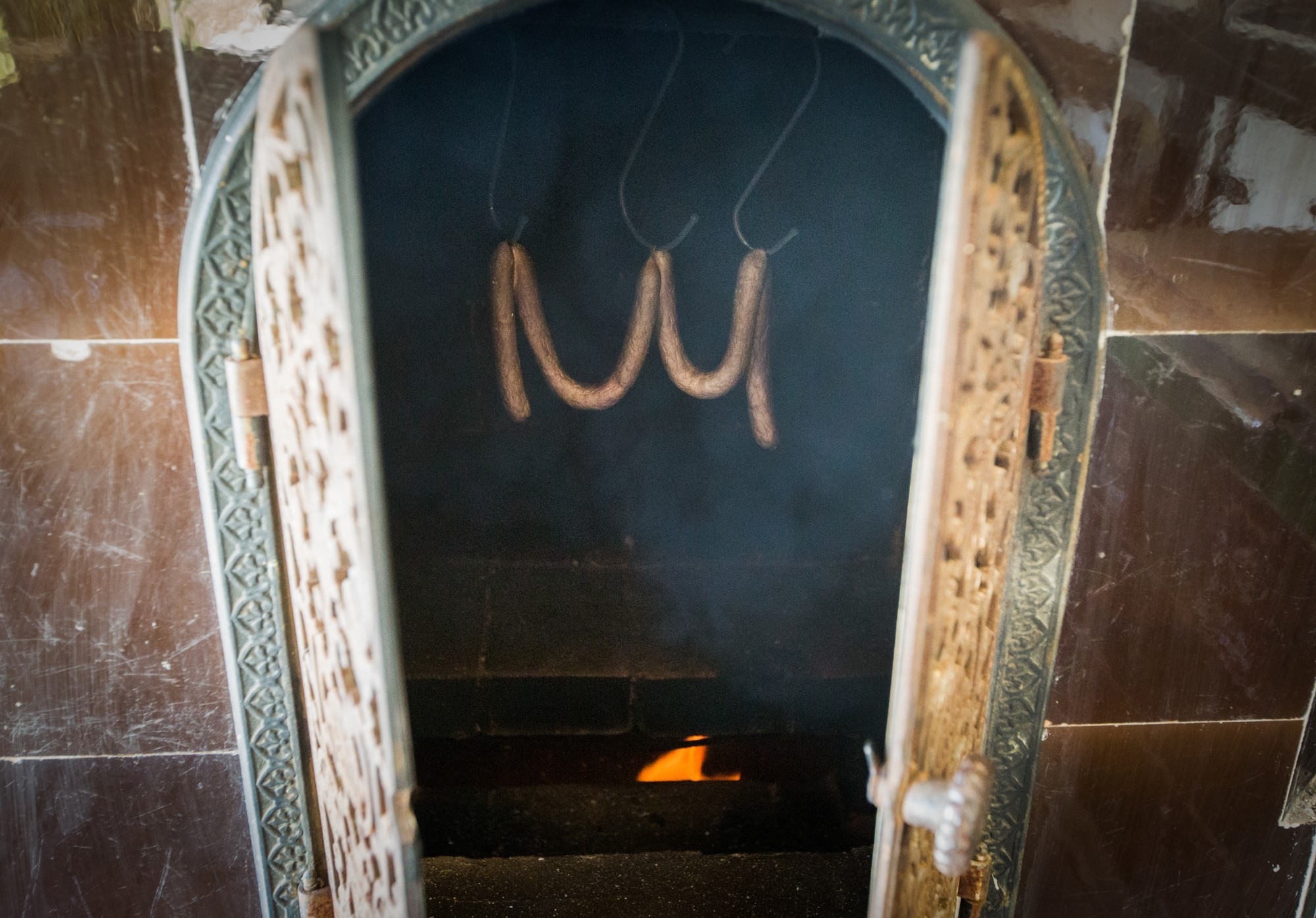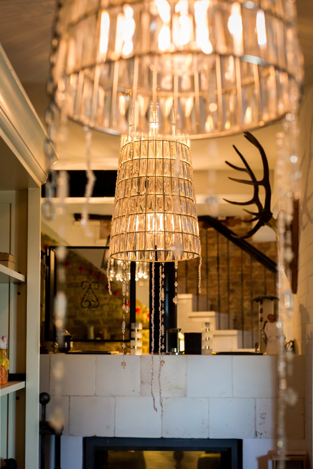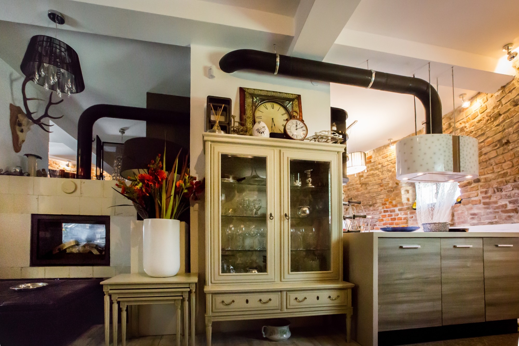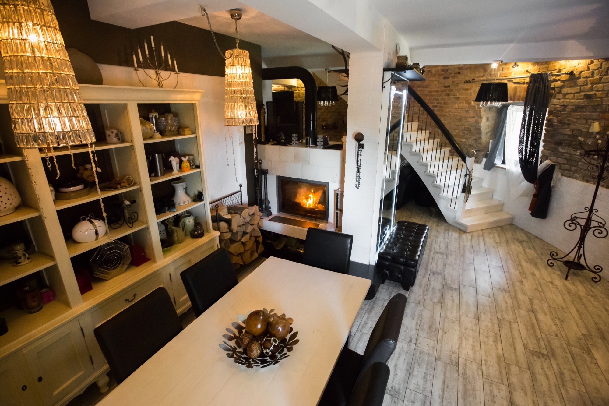 • První patro: Otevřená kuchyň, jídelna a obývací prostor s dvoustranným krbem a WC.