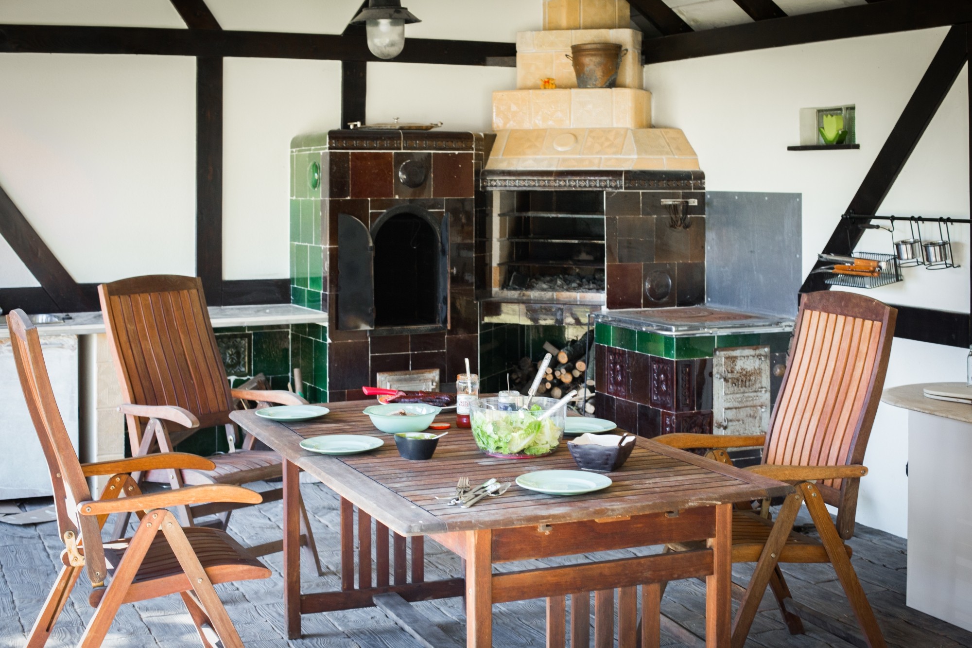 Na pozemku se nachází příslušenství spojené s velkým přístřeškem navrženým ve stylu Mazurska (omítaná konstrukce), vybaveným grilem, kuchyní a udírnou, zdobeným starými mazurskými dlaždicemi. Tato oblast nabízí obyvatelům příležitost organizovat akce a týmové aktivity, stejně jako trávit příjemné hodiny venku. Navíc je možné postavit stany pro větší akce.