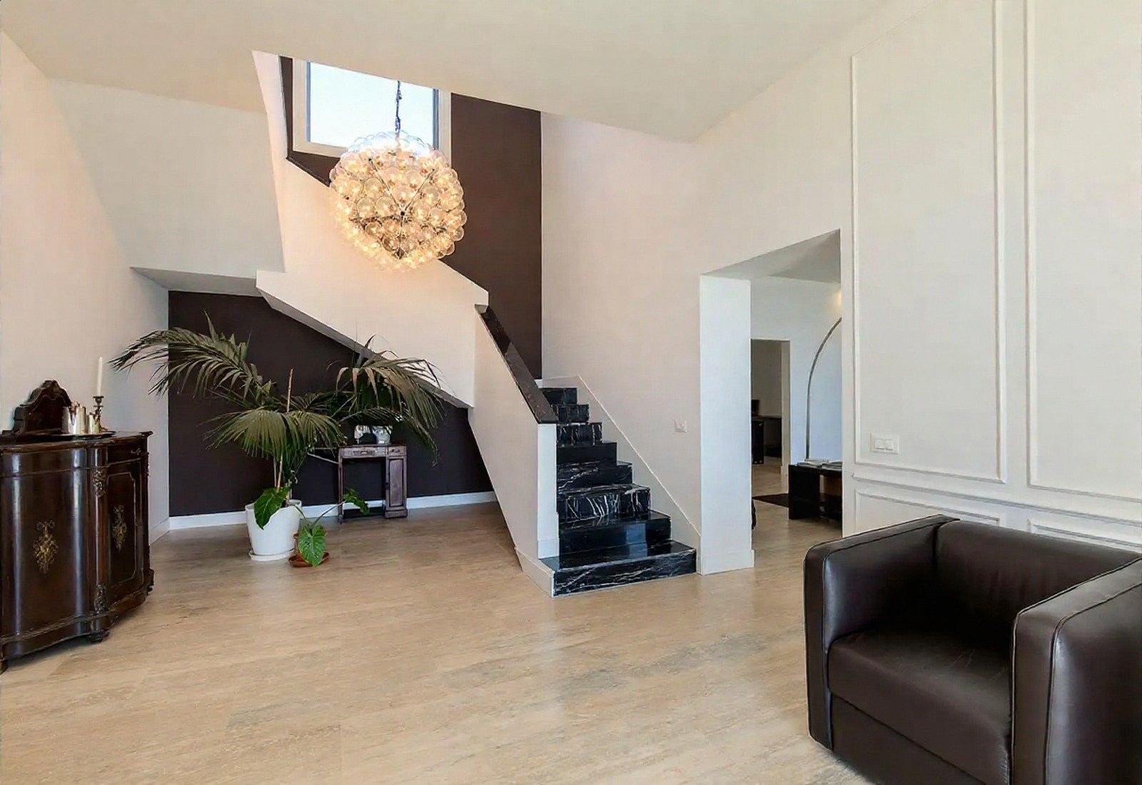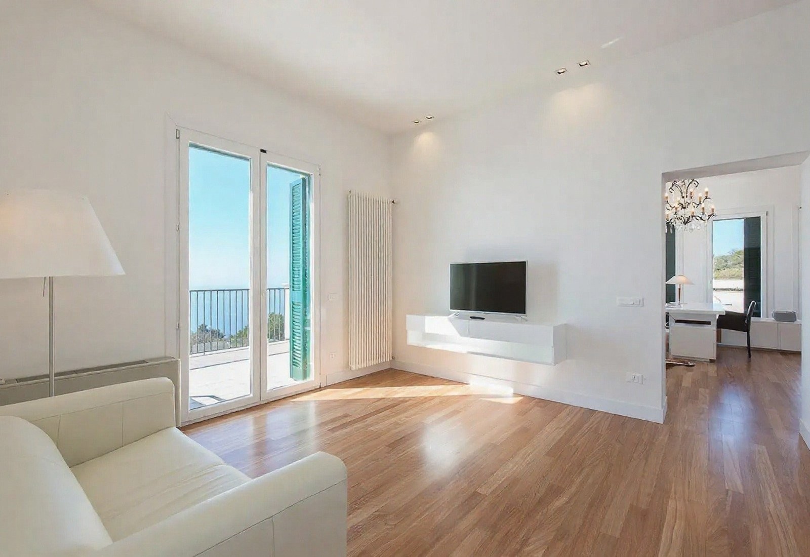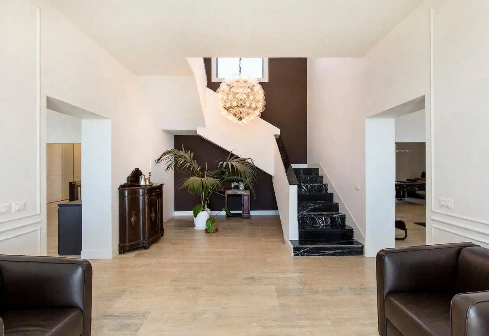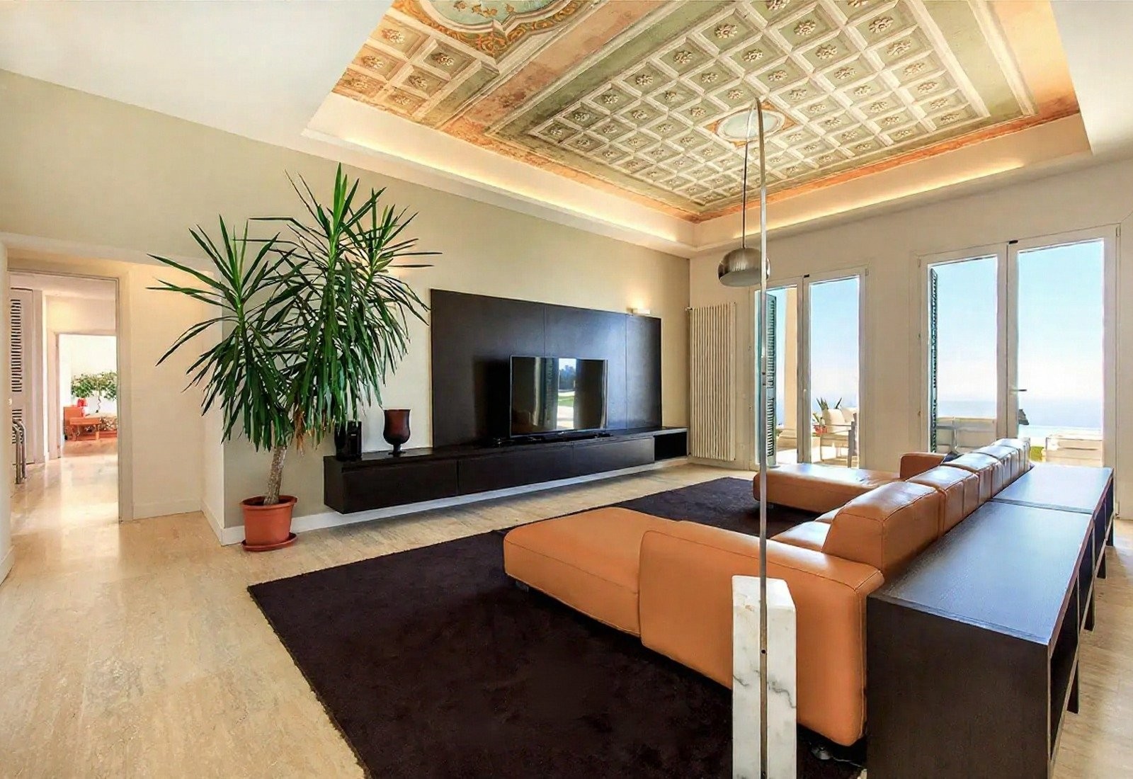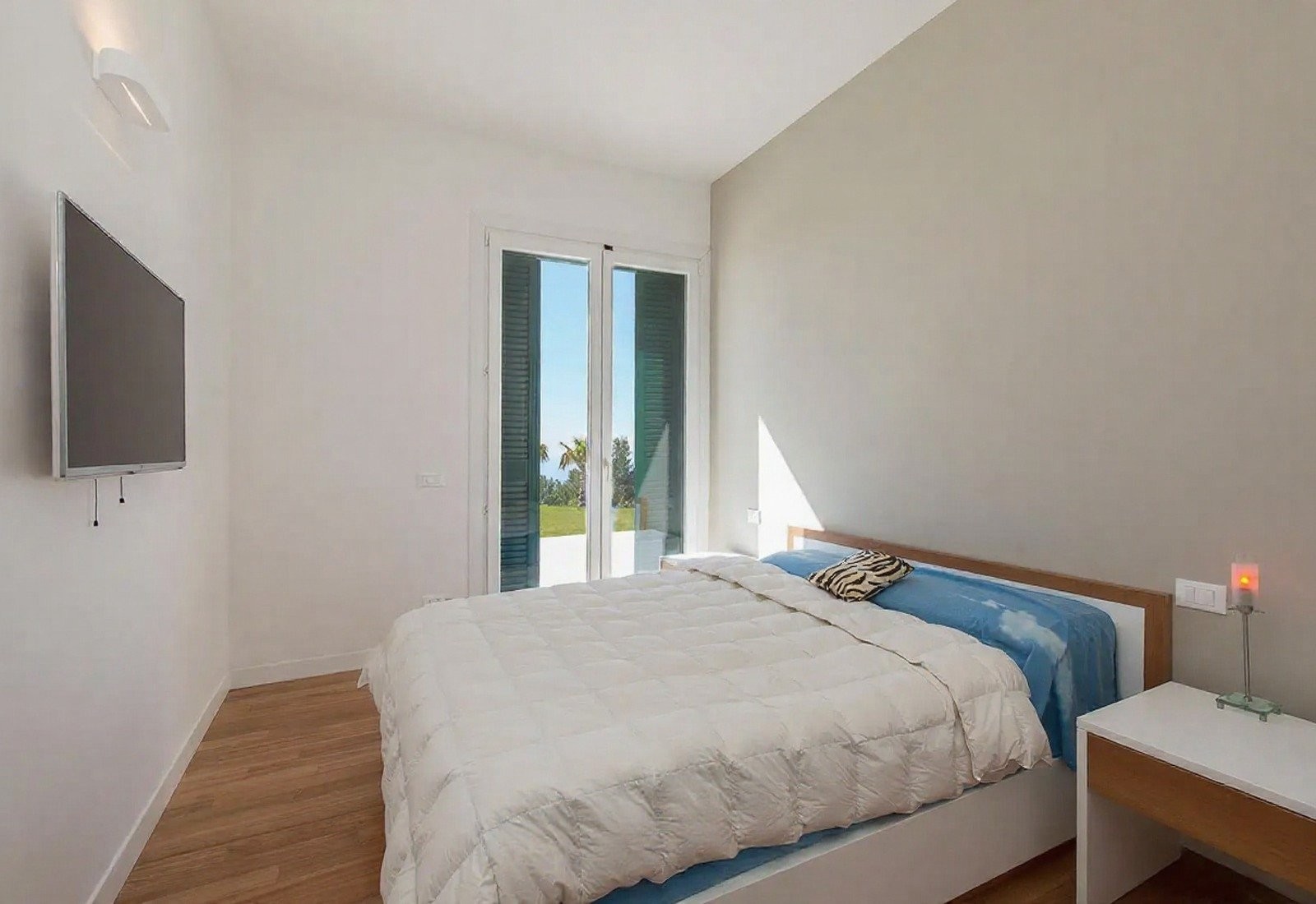 Kvalitní materiály, jako mramor, dřevěné podlahy a kované detaily, podtrhují eleganci interiérů. Celkový vzhled je udržován v jasných středomořských tónech.