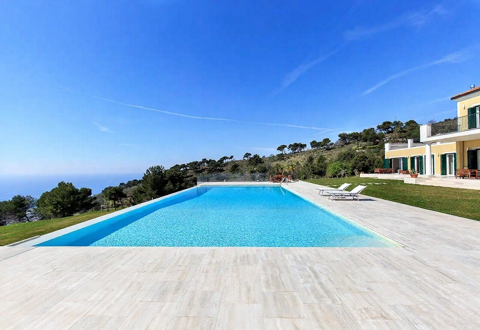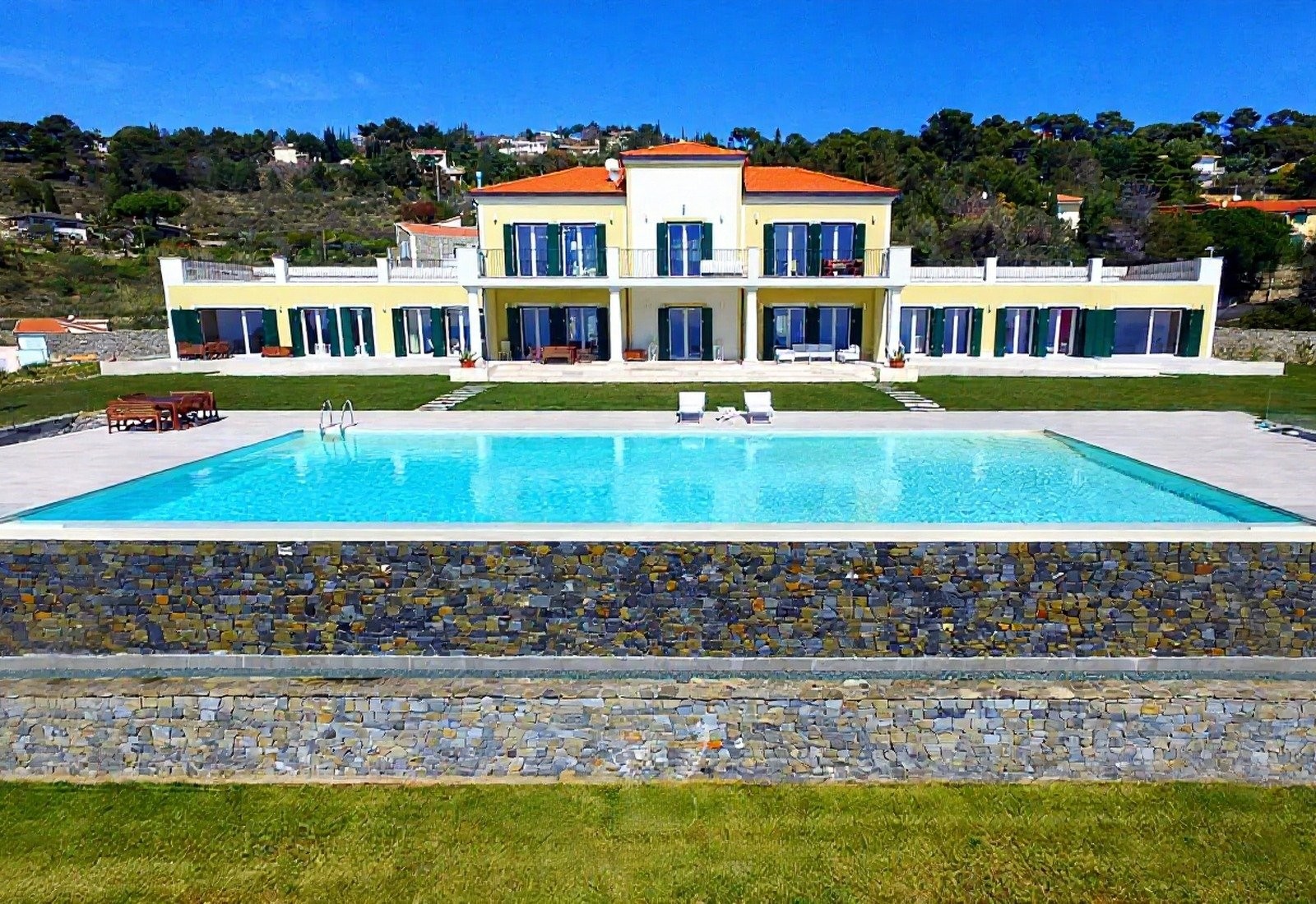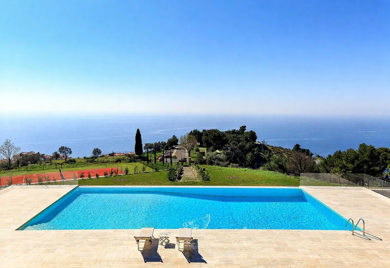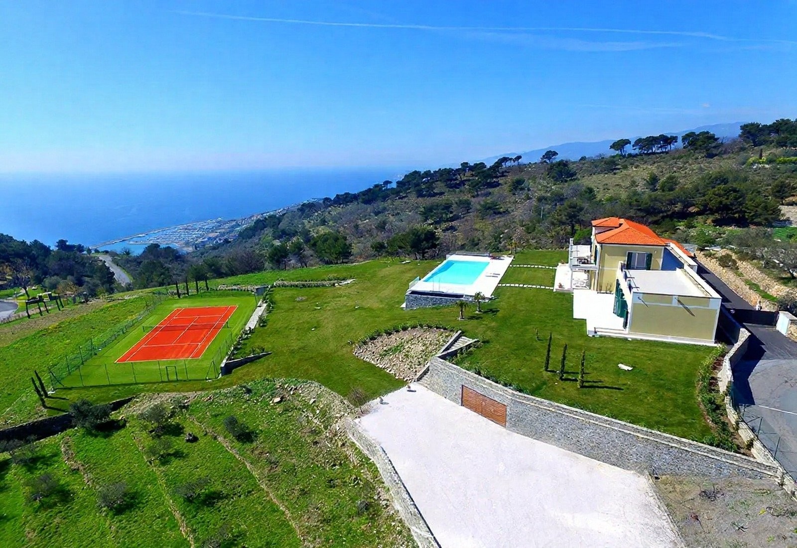 Středobodem je panoramatický bazén s výhledem na moře, obklopený terasou, odpočinkovou zónou a krytou plochou k relaxaci. Tenisový kurt a krytá pergola doplňují nabídku. Terasy a schodišťové zahrady vedou mírně směrem k moři. Večerní osvětlení zvýrazňuje zahrady a bazén.