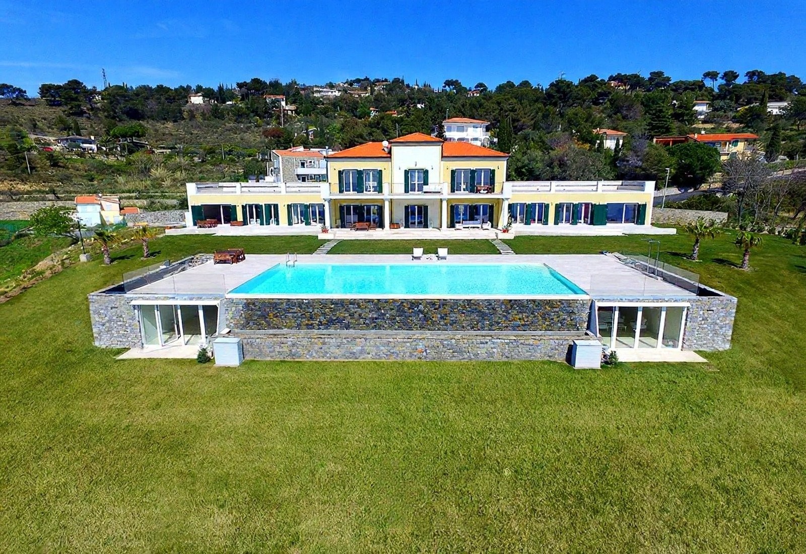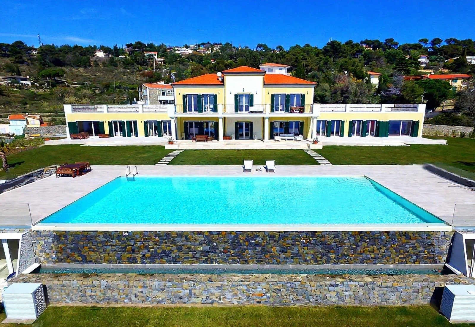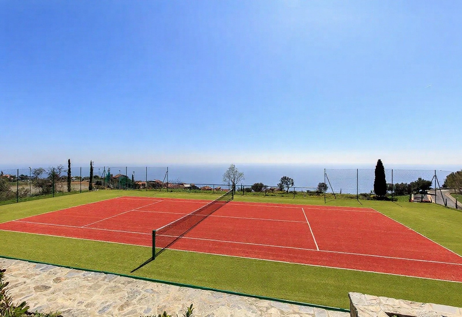 Středobodem je panoramatický bazén s výhledem na moře, obklopený terasou, odpočinkovou zónou a krytou plochou k relaxaci. Tenisový kurt a krytá pergola doplňují nabídku. Terasy a schodišťové zahrady vedou mírně směrem k moři. Večerní osvětlení zvýrazňuje zahrady a bazén.