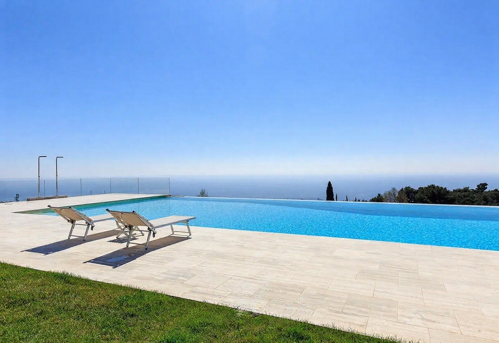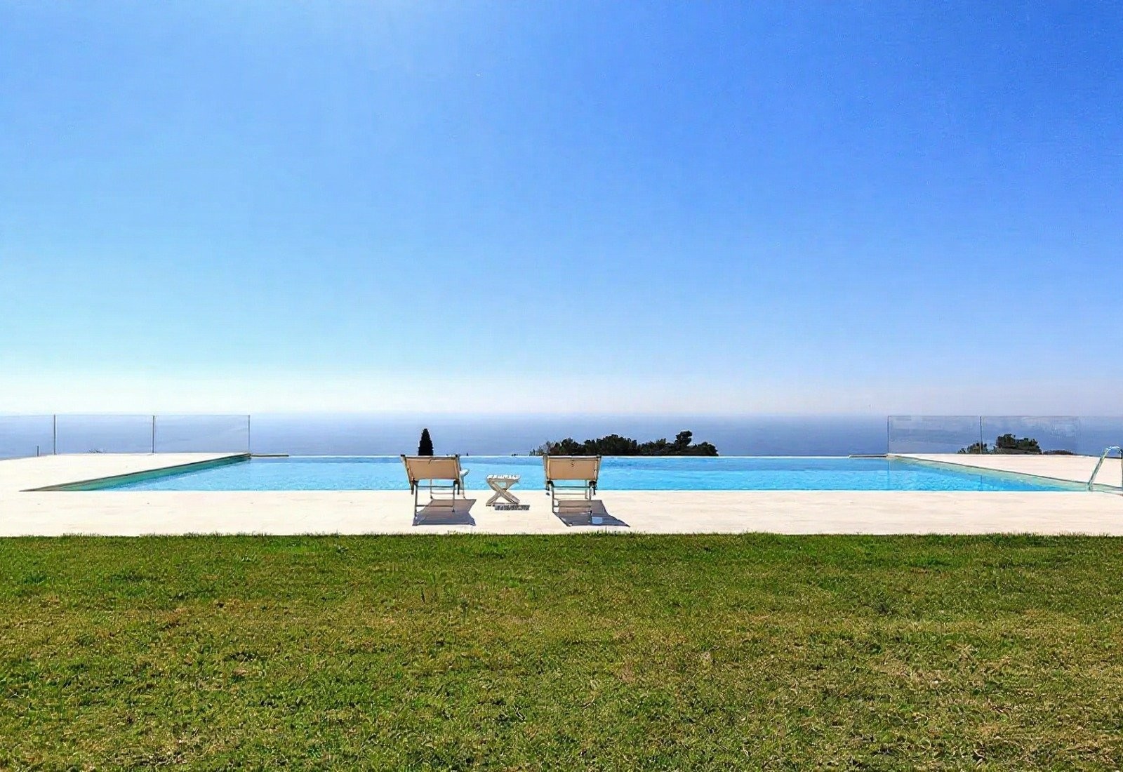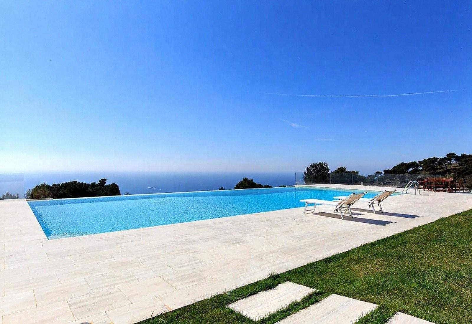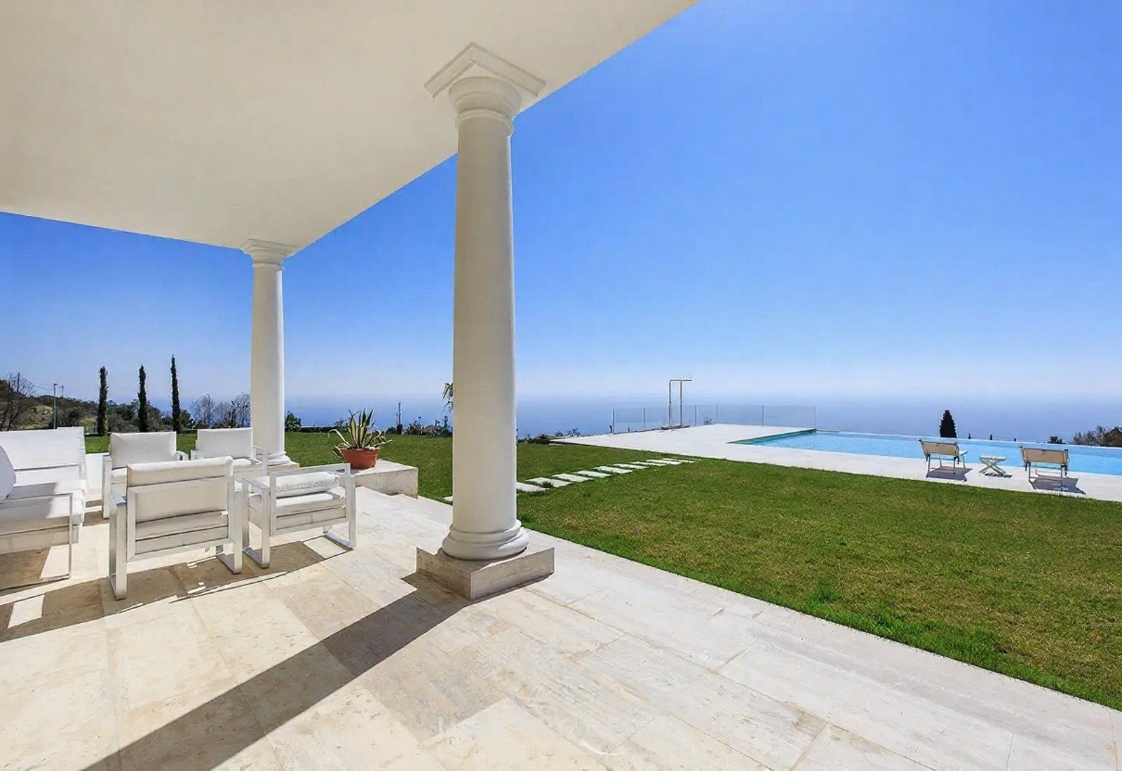 Středobodem je panoramatický bazén s výhledem na moře, obklopený terasou, odpočinkovou zónou a krytou plochou k relaxaci. Tenisový kurt a krytá pergola doplňují nabídku. Terasy a schodišťové zahrady vedou mírně směrem k moři. Večerní osvětlení zvýrazňuje zahrady a bazén.