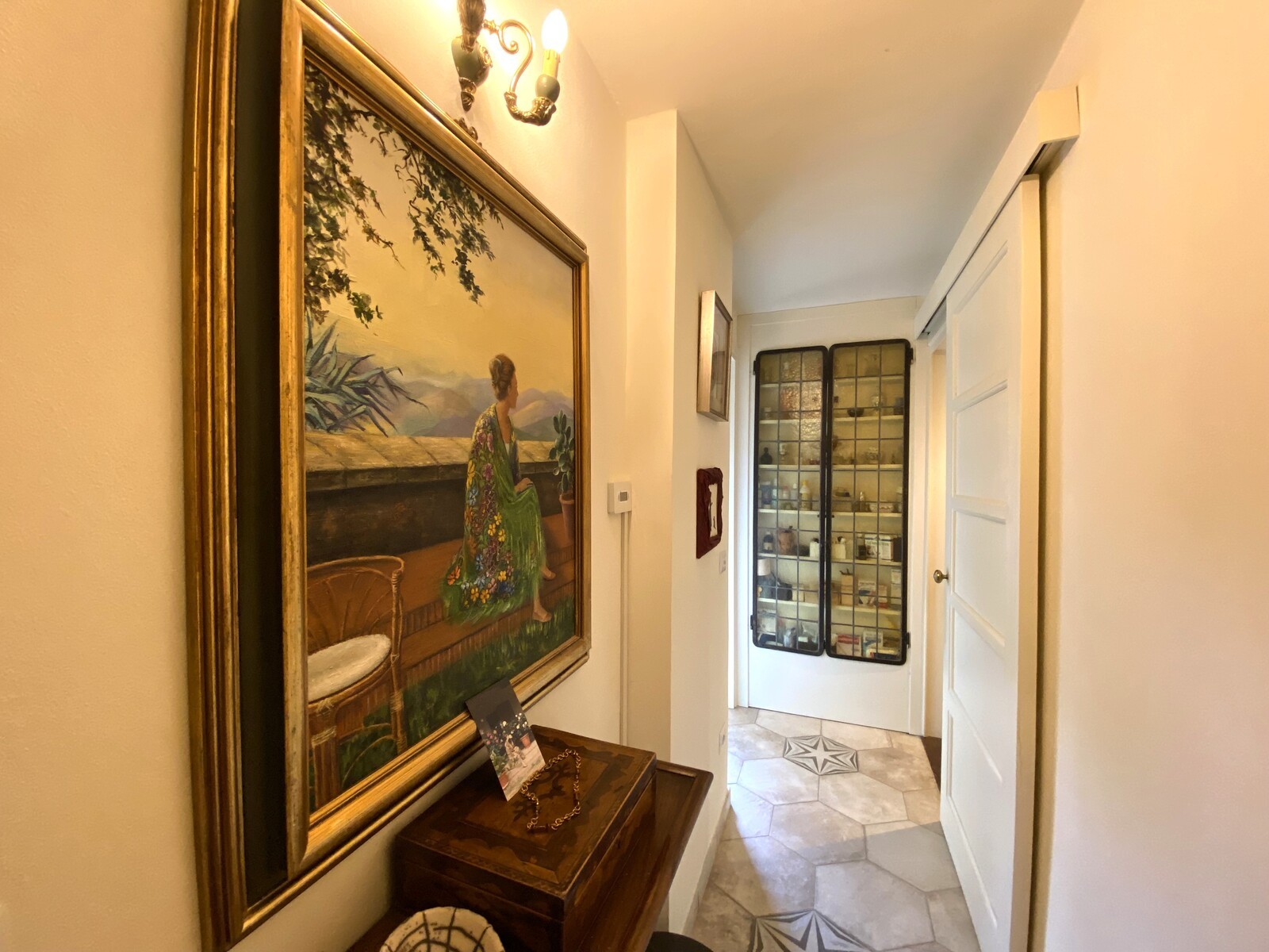 V přízemí se nachází vstupní hala, chodby, obývací pokoj, ložnice s manželskou postelí a dvě koupelny. První patro zahrnuje obývací pokoj, dvě kuchyně s přístupem na balkon, chodbu s výstupem na dlouhý balkon, ložnici s manželskou postelí a koupelnu. Druhé patro nabízí prostorný otevřený prostor využívaný jako obývací pokoj a pracovna, s balkonem a panoramatickou terasou, a koupelnu.