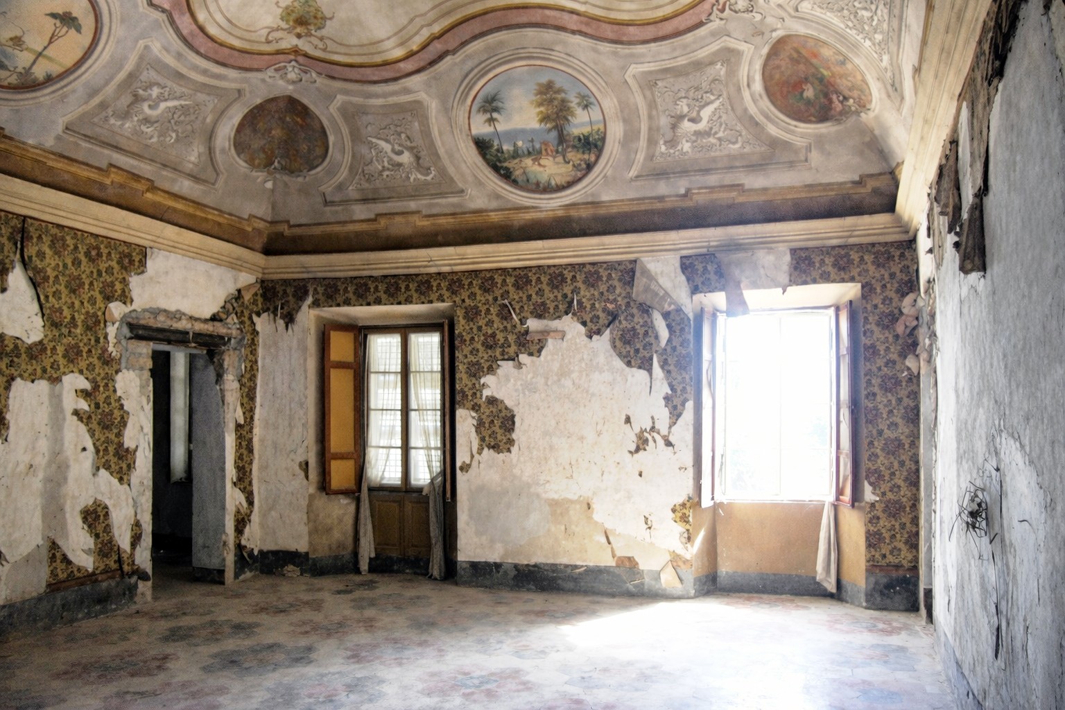 V prvním patře se nachází impozantní reprezentační sál zdobený freskami, lemovaný pěti ložnicemi a koupelnou.