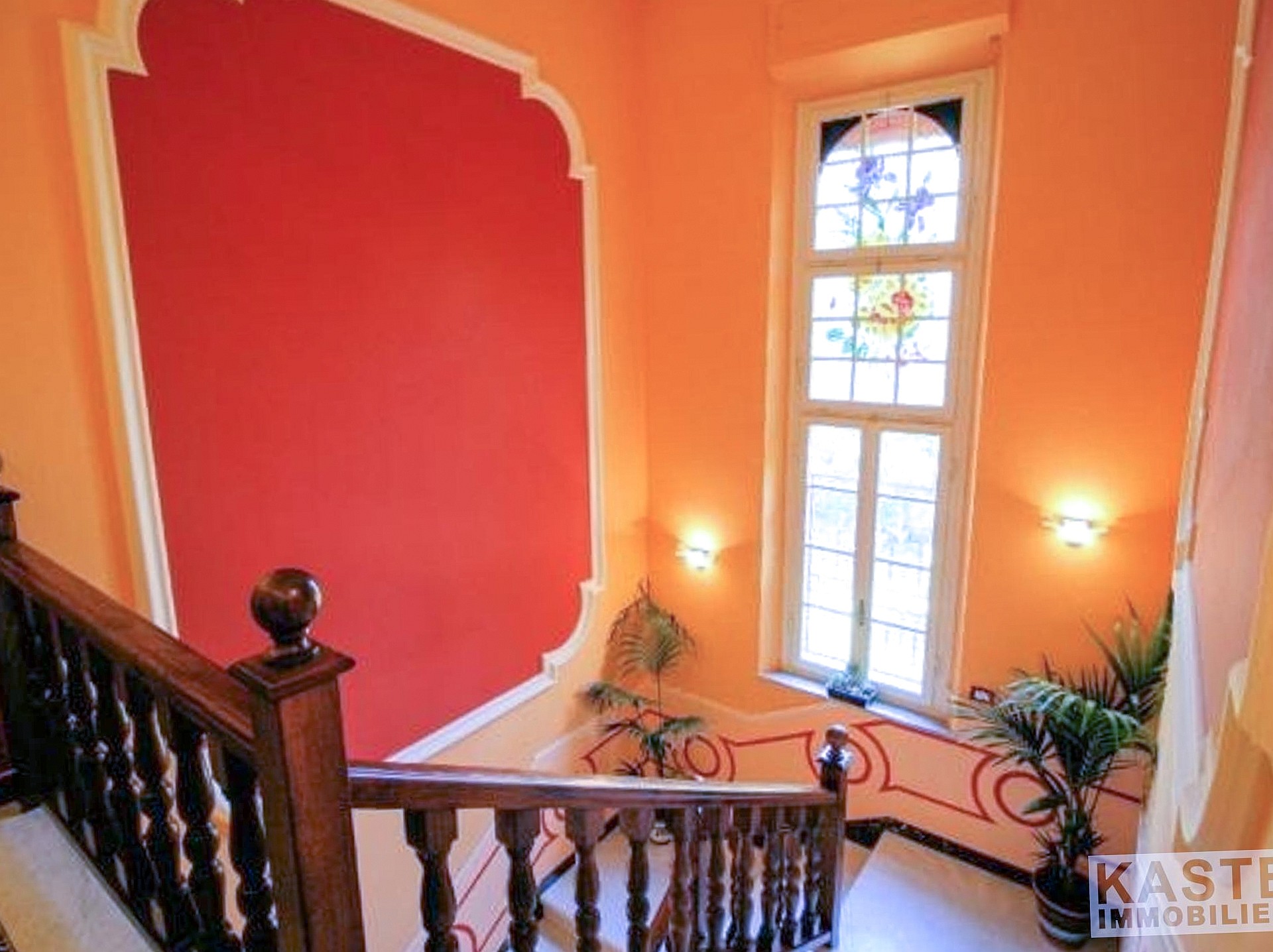 Vstupní hala Velké schodiště Krb Vitrážové sklo Vysoké stropy