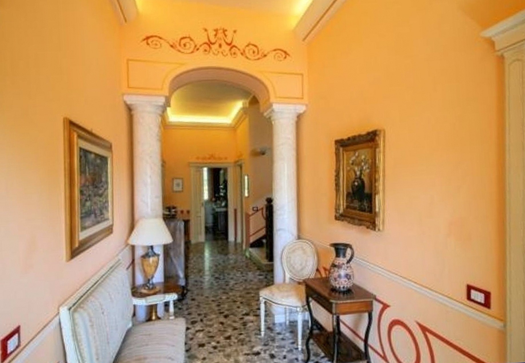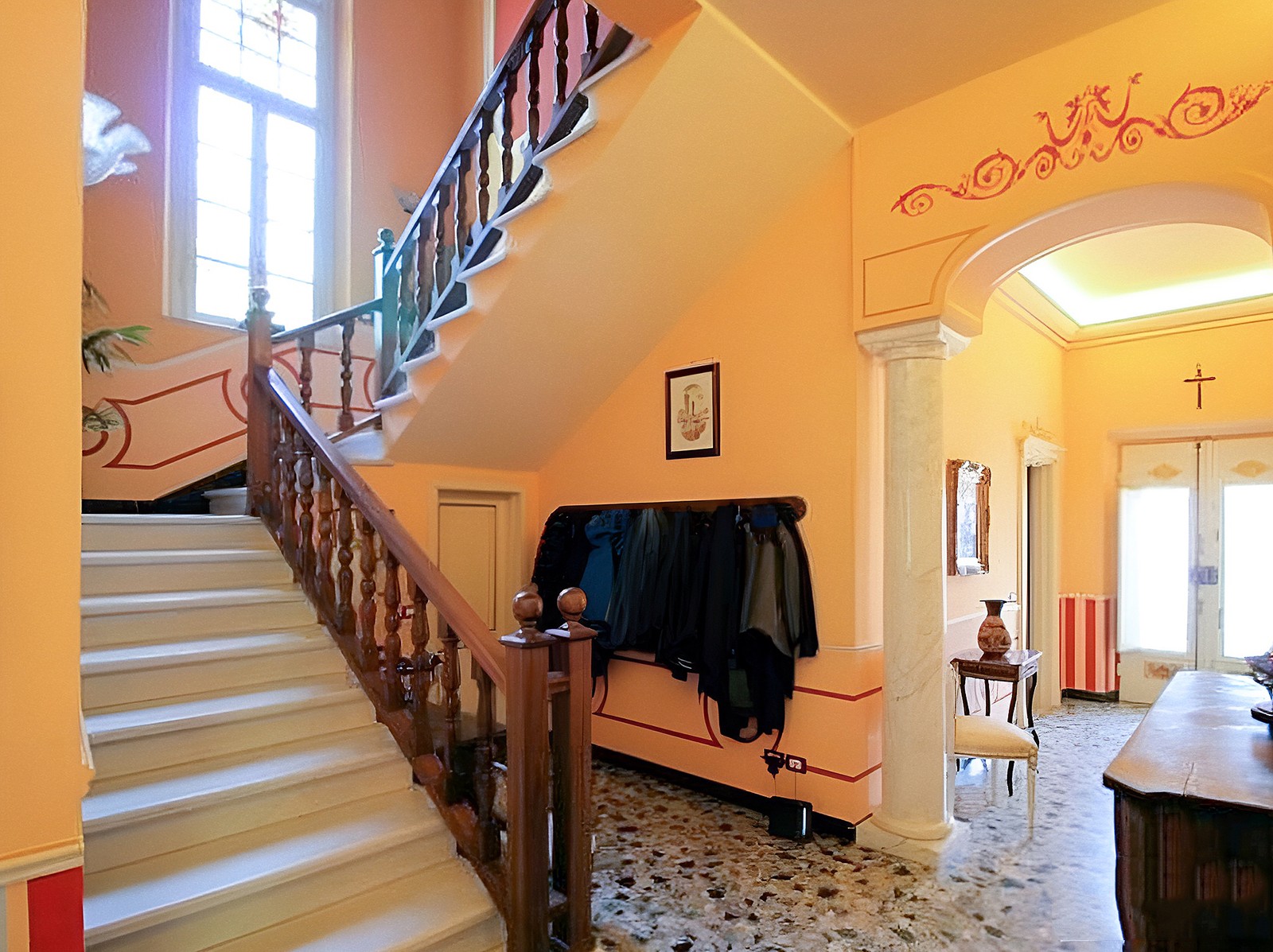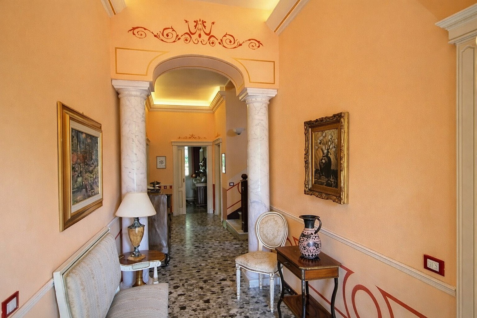 Obytná plocha přibližně 425 m² je rozložena do tří podlaží a kombinuje historické prvky s moderním komfortem. Interiér zdobí dekorativní mramorové sloupy, prostorné místnosti s krbem a parketové podlahy. V patře se nachází pět ložnic s přístupem na terasu, která nabízí výhled do udržované zahrady o rozloze cca 2 000 m² – klasického parku inspirovaného italským zahradním uměním.