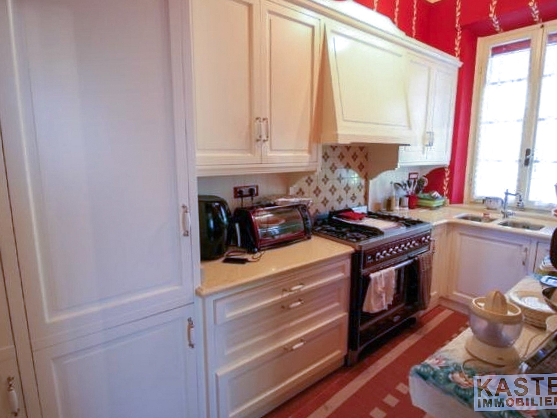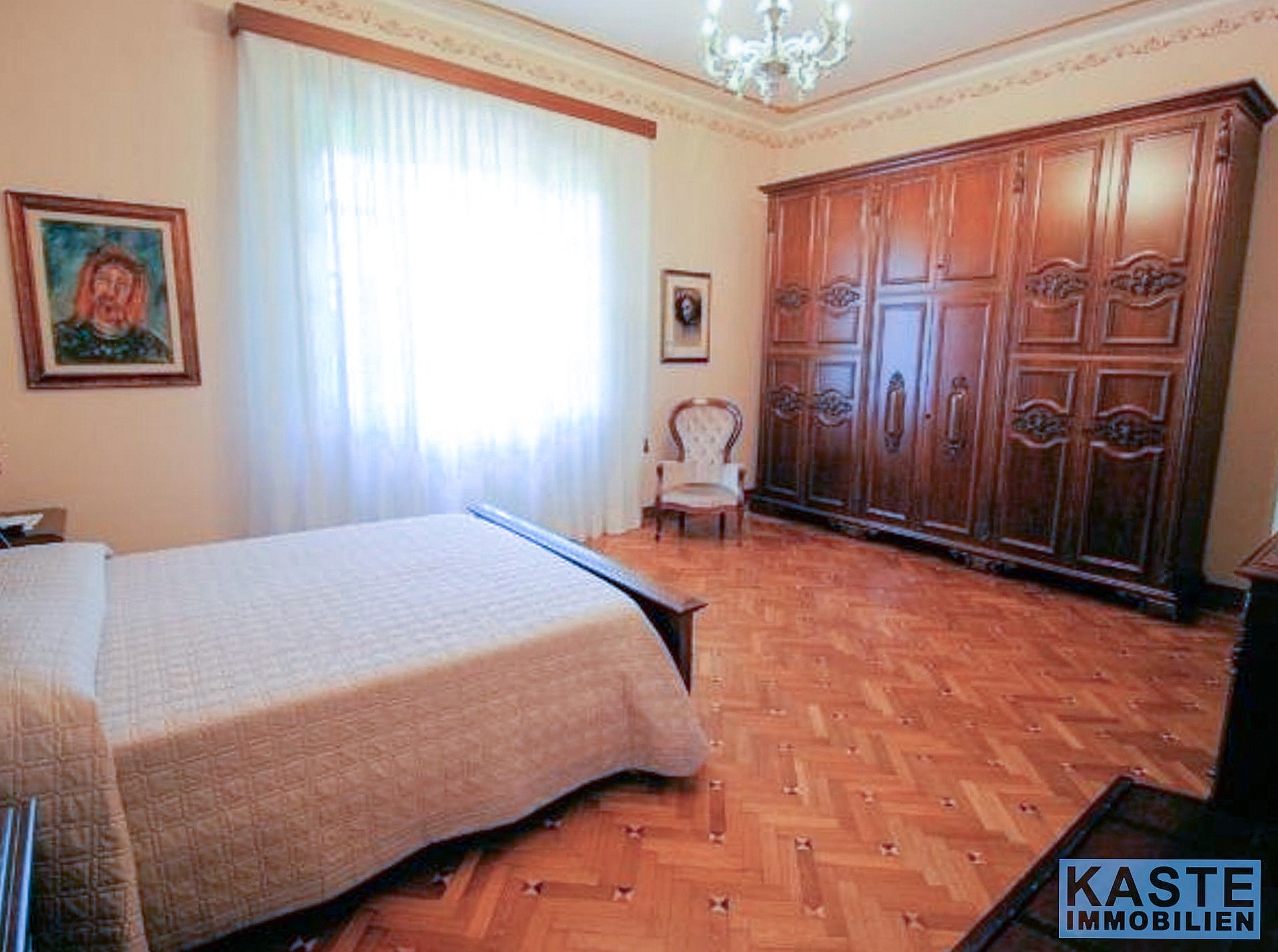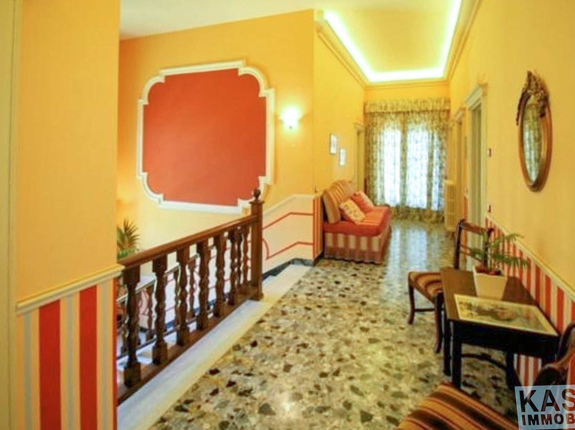Obytná plocha přibližně 425 m² je rozložena do tří podlaží a kombinuje historické prvky s moderním komfortem. Interiér zdobí dekorativní mramorové sloupy, prostorné místnosti s krbem a parketové podlahy. V patře se nachází pět ložnic s přístupem na terasu, která nabízí výhled do udržované zahrady o rozloze cca 2 000 m² – klasického parku inspirovaného italským zahradním uměním.
