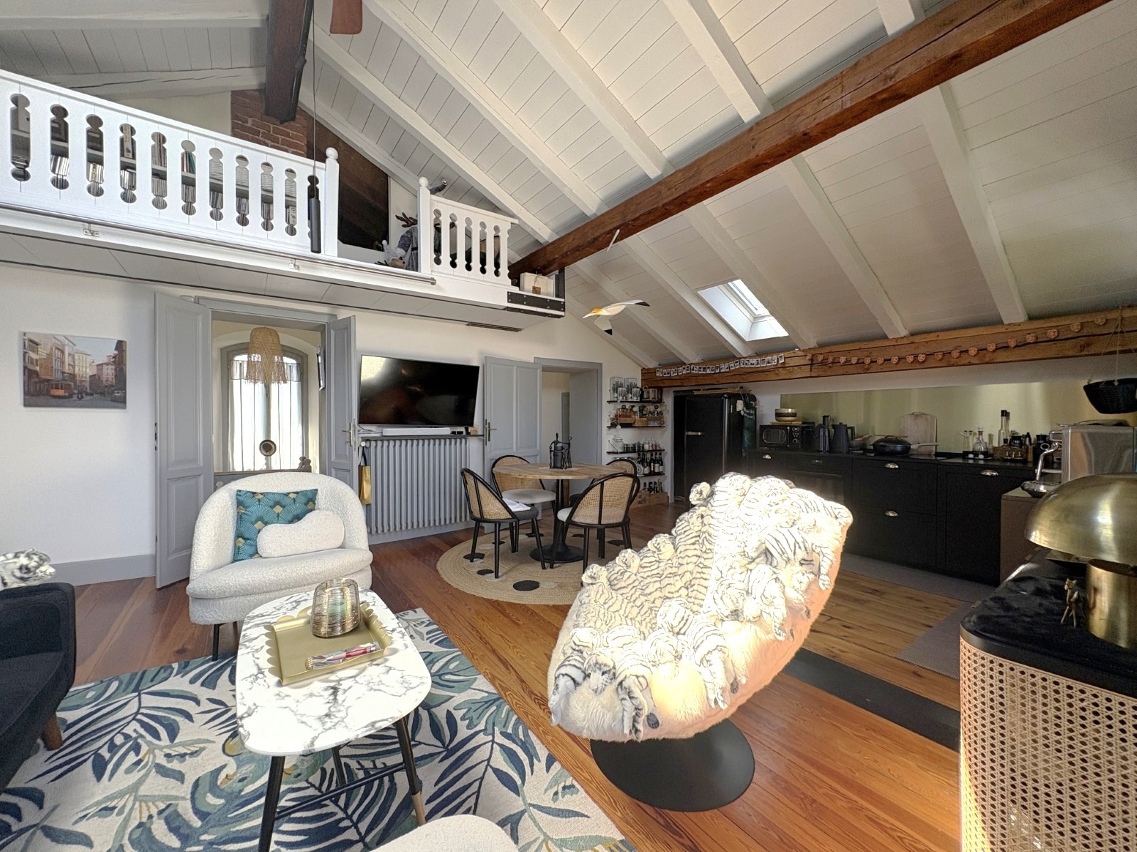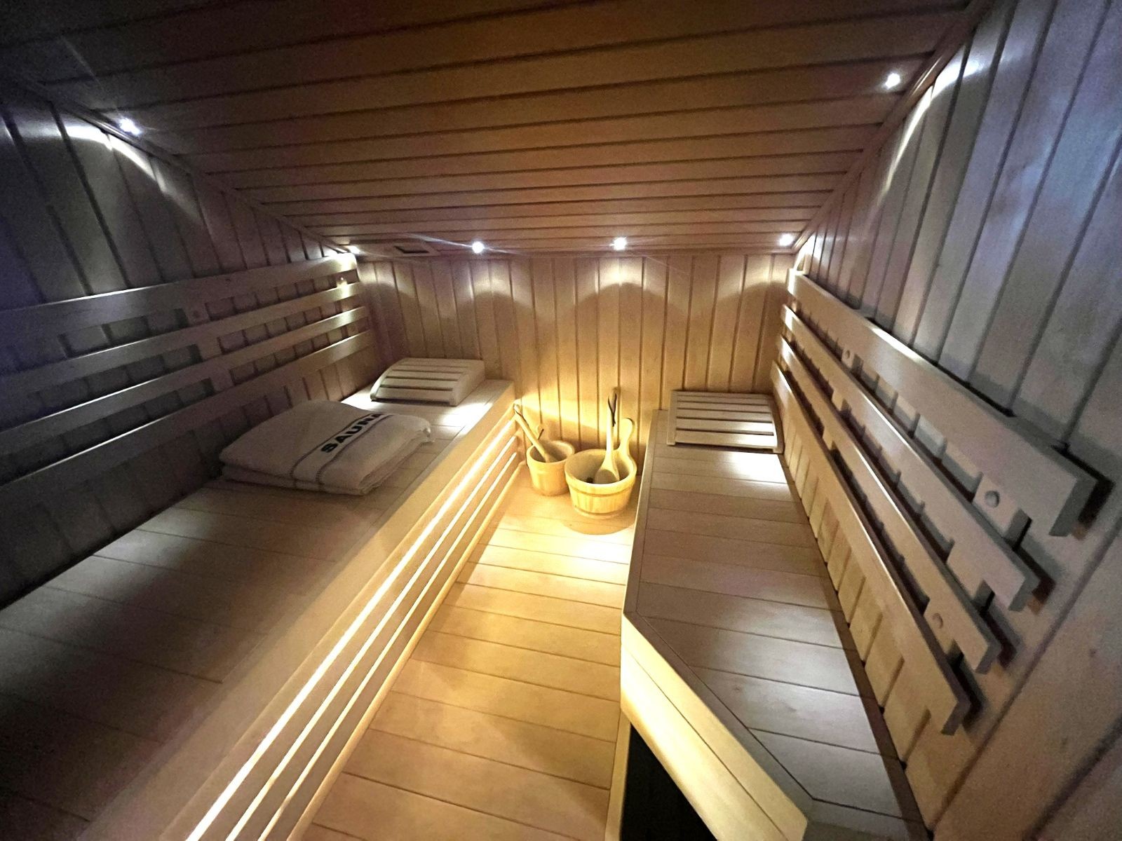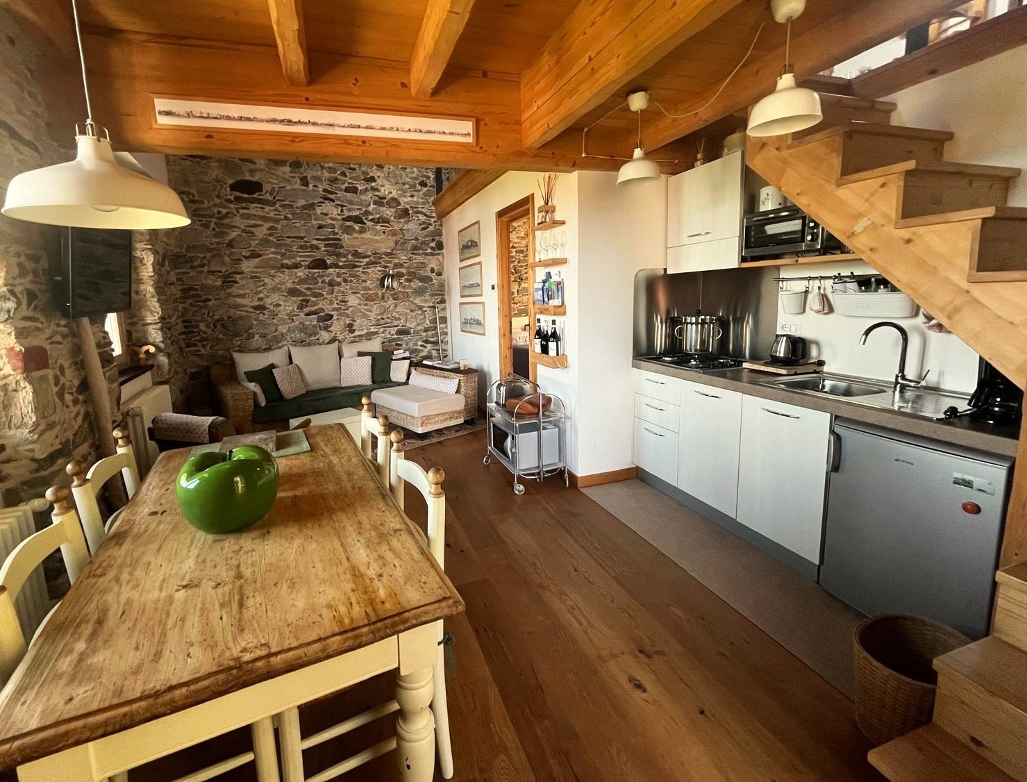 Samostatný byt s odkrytými dřevěnými trámy, balkonem s výhledem na jezero, otevřeným obývacím a jídelním prostorem s kuchyní, dvěma ložnicemi, koupelnou, privátní saunou a galerií v horní části.
