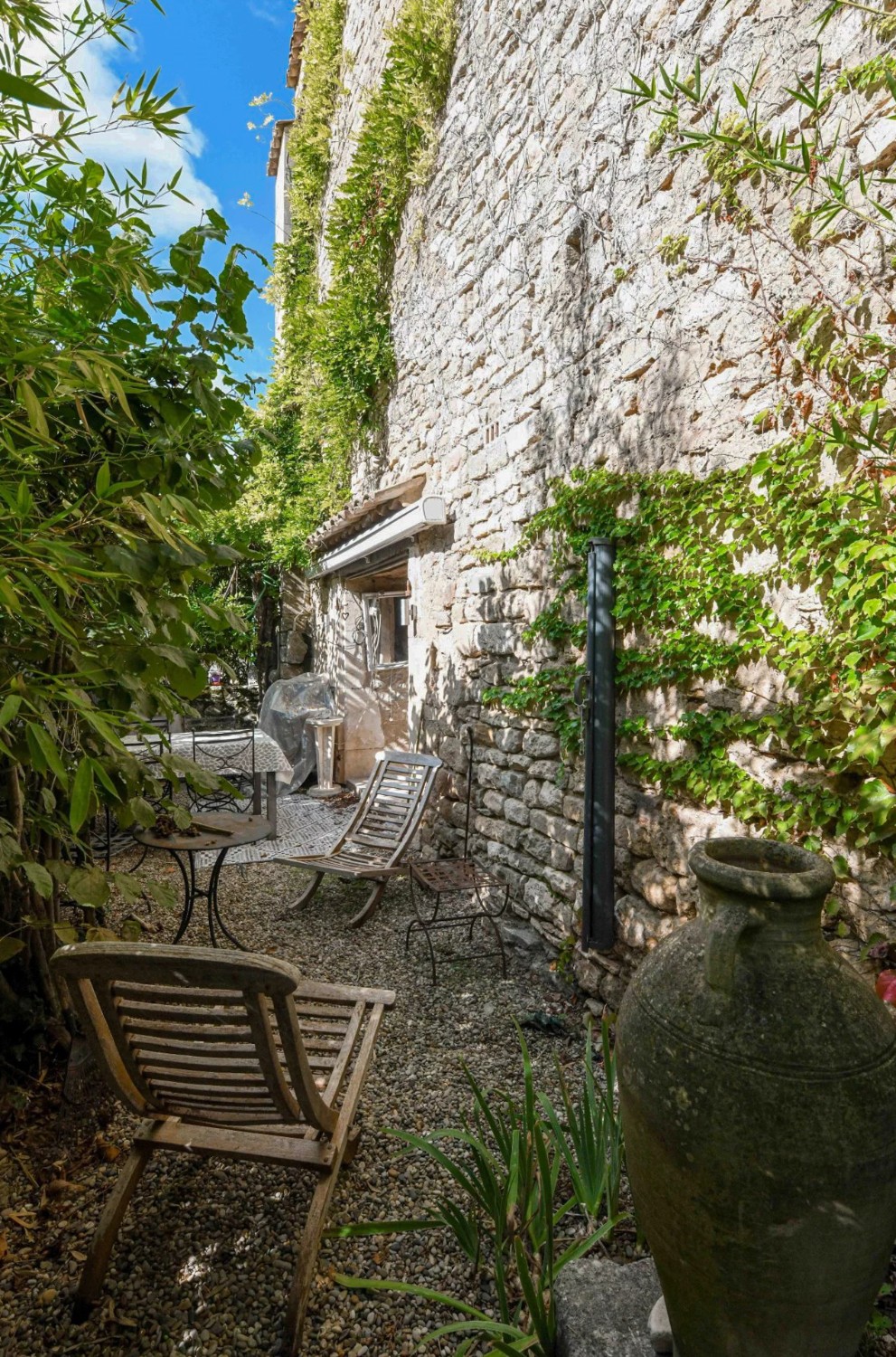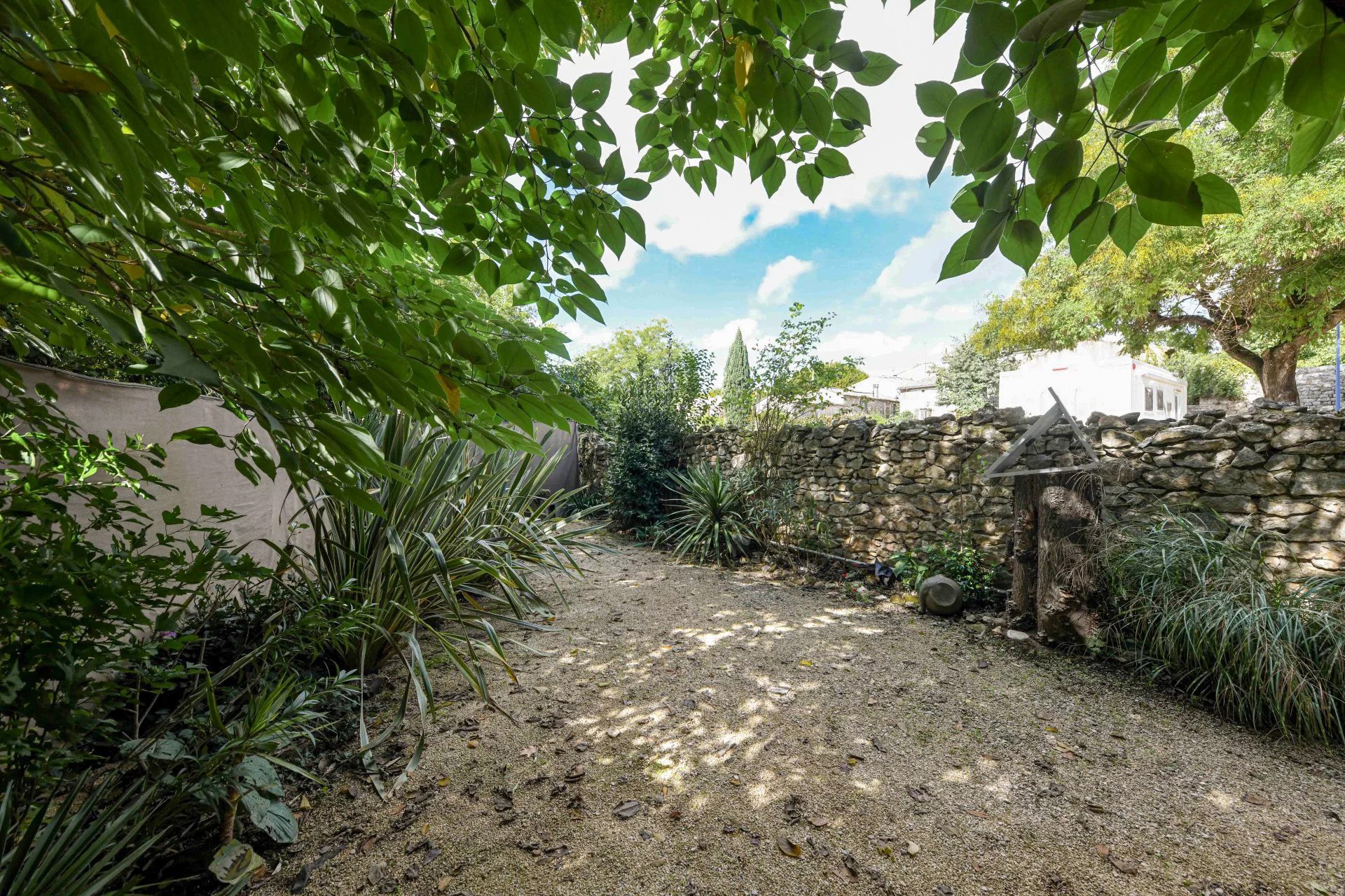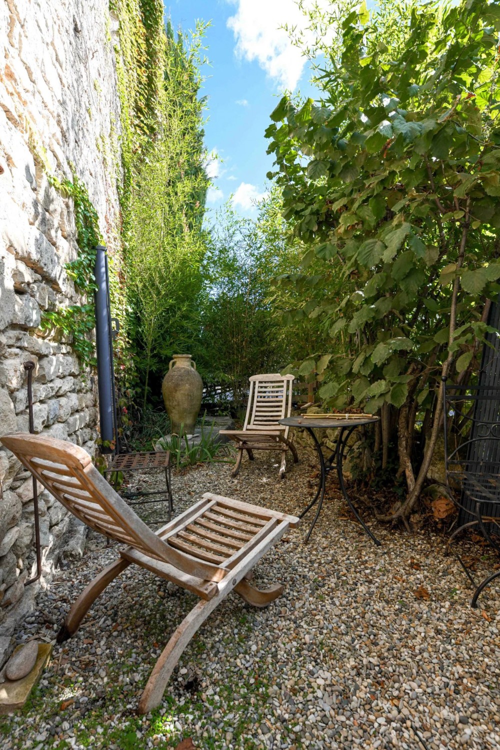Malá zahrada o ploše 110 m², chráněná starými stromy, poskytuje klidné útočiště, ideální k odpočinku během léta.