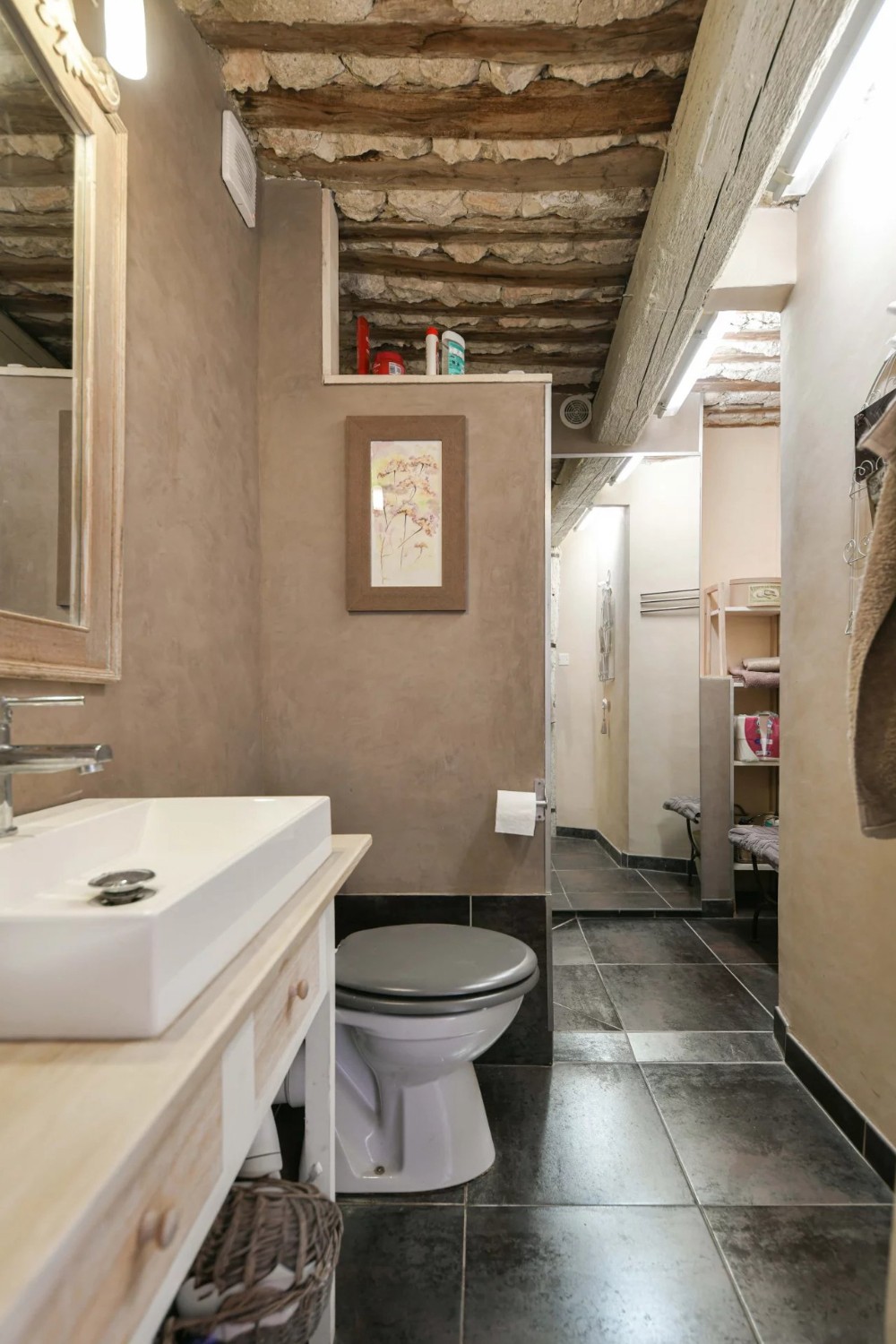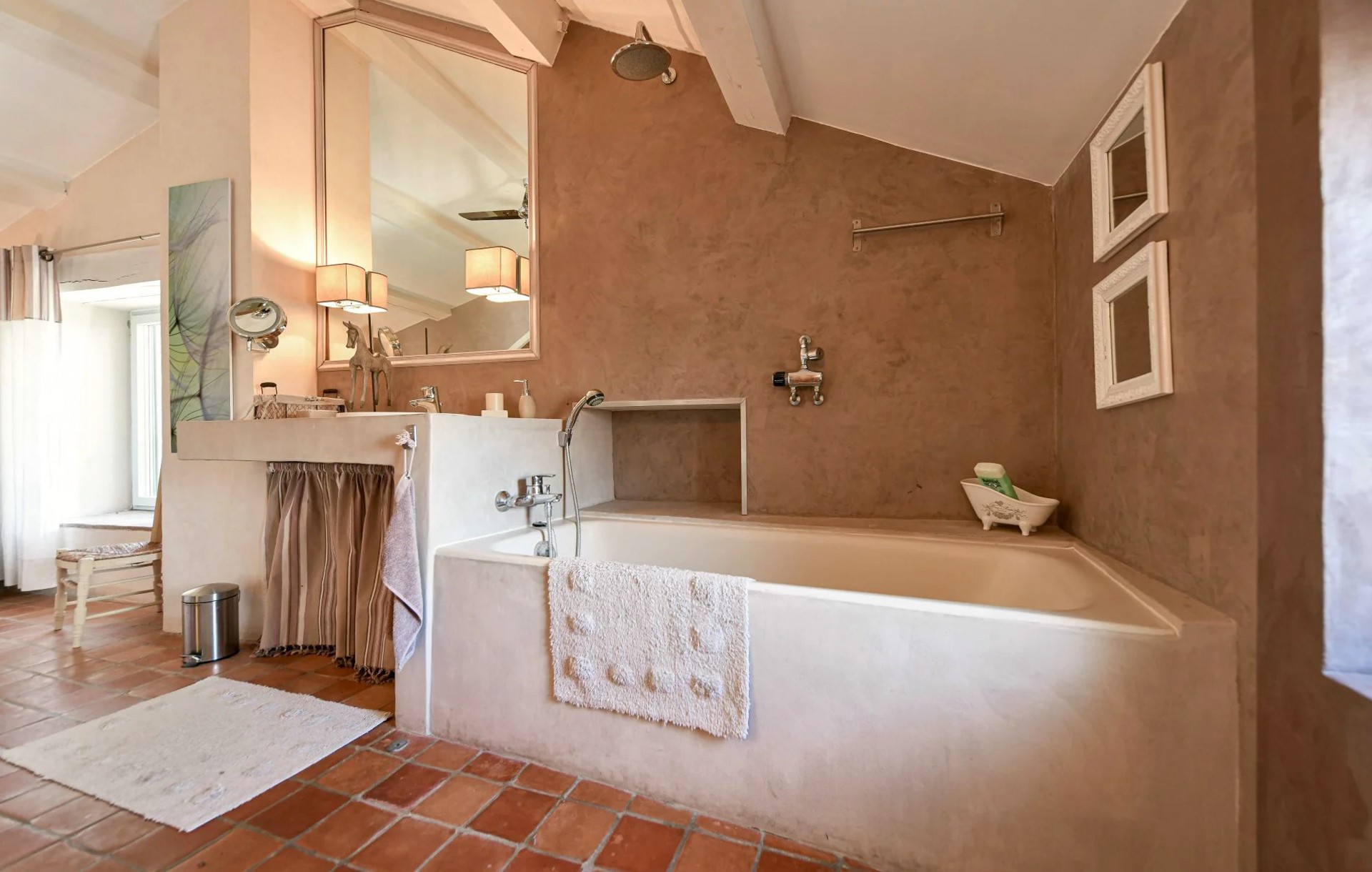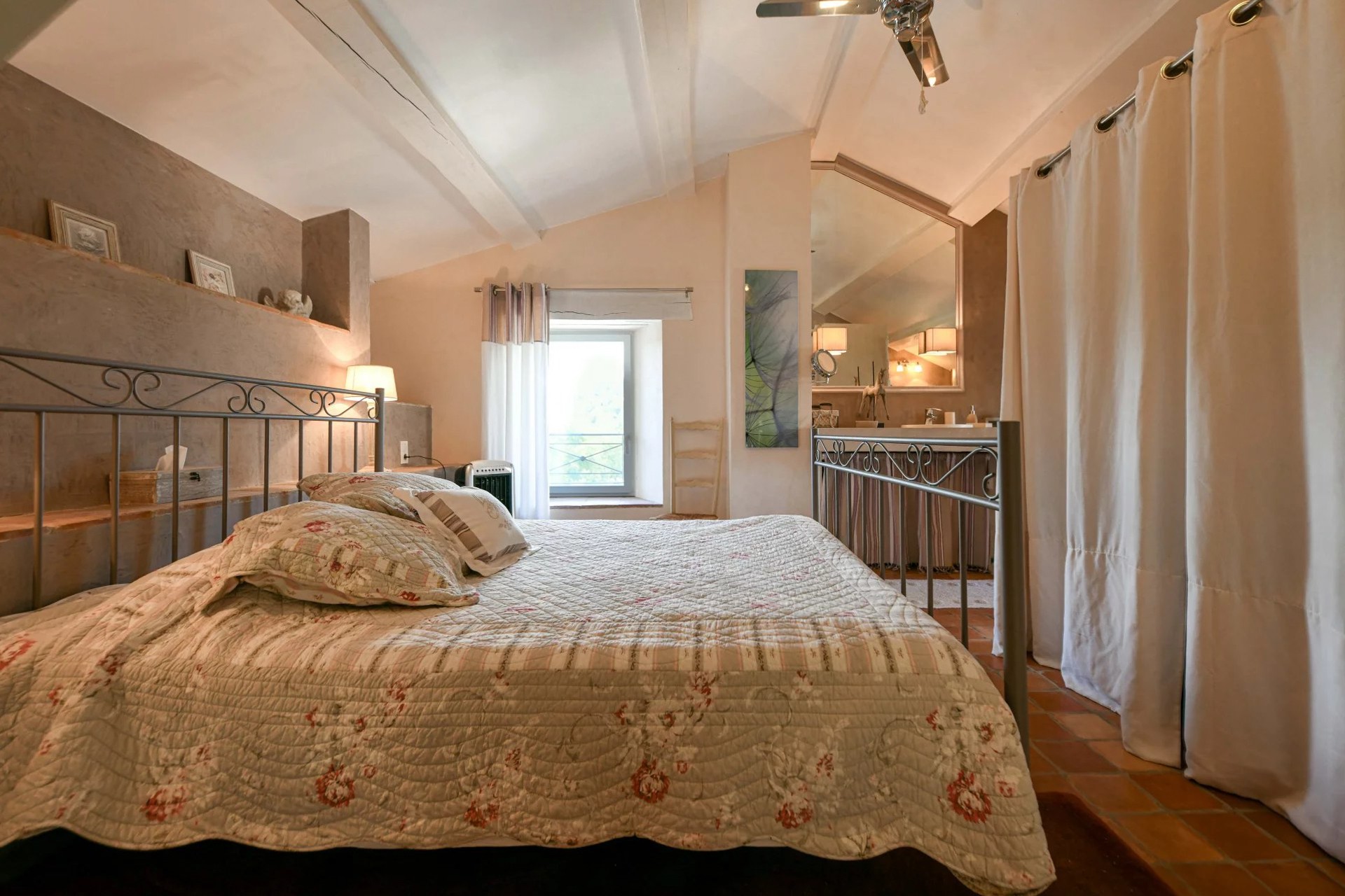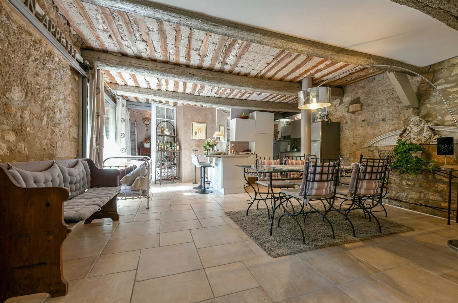 V přízemí se v apsidě nachází vstupní prostor s impozantní výškou stropu, který okamžitě zaujme. Jídelní a kuchyňská část o ploše 37 m² se pyšní nádhernými provensálskými stropy a otevírá se velkou skleněnou stěnou na soukromý dvorek o velikosti 30 m². Na straně, v bývalé sakristii, se nachází útulný TV pokoj, který lze alternativně využít jako třetí ložnici. K dispozici je také moderní koupelna se sprchovým koutem ve stylu italské sprchy, umyvadlem a WC a praktická úložná skříň.