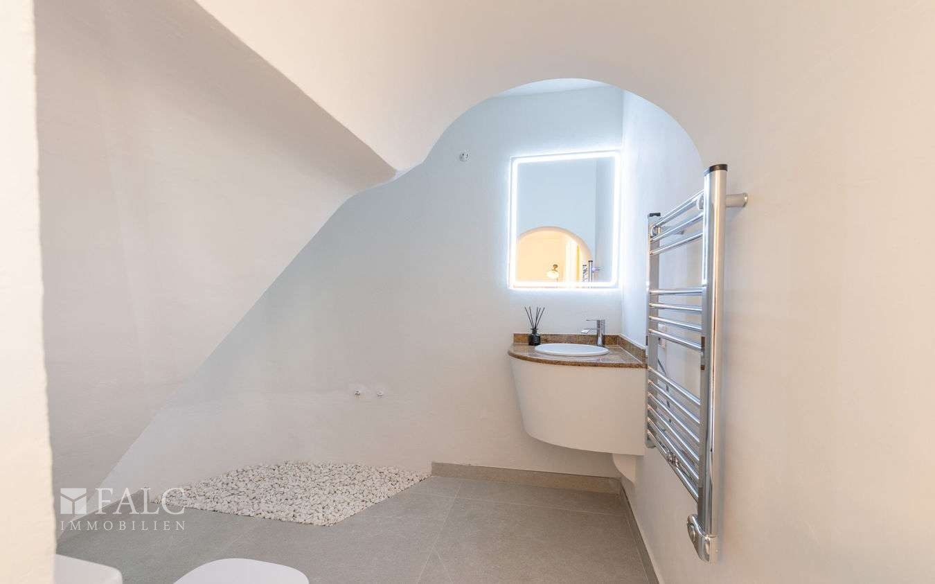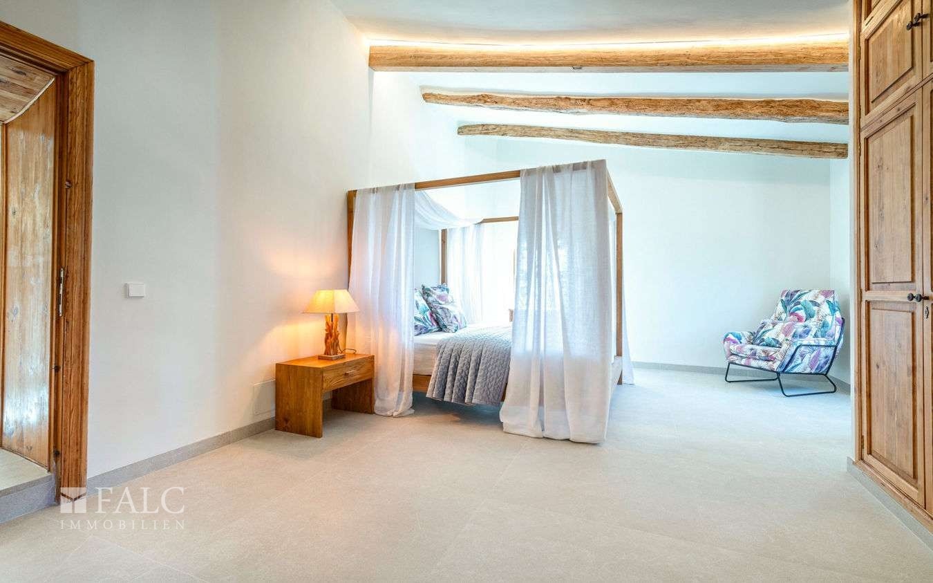 Horní patro: Tři ložnice s vlastní koupelnou a hlavní apartmá s dřevěnými trámovými stropy a dvěma koupelnami en suite. Schodiště vede na terasu věže s 360° výhledem na nemovitost a moře.