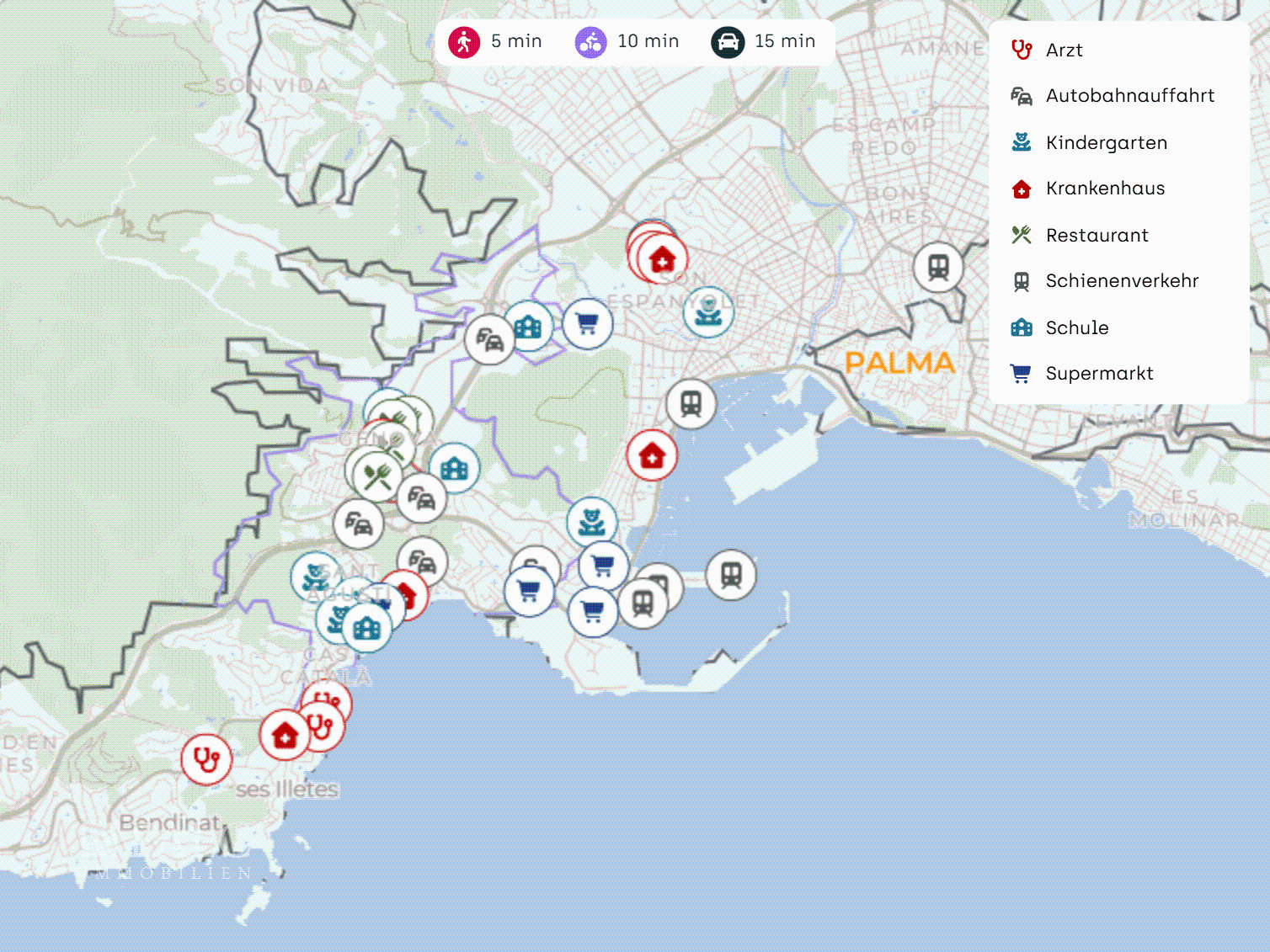 Sport a zdraví: Queen’s Centre cca 700 m, fitness centra 1,2–2,6 km. Clínica Juaneda cca 2,8 km.