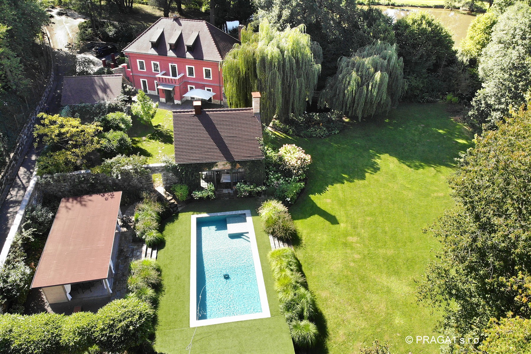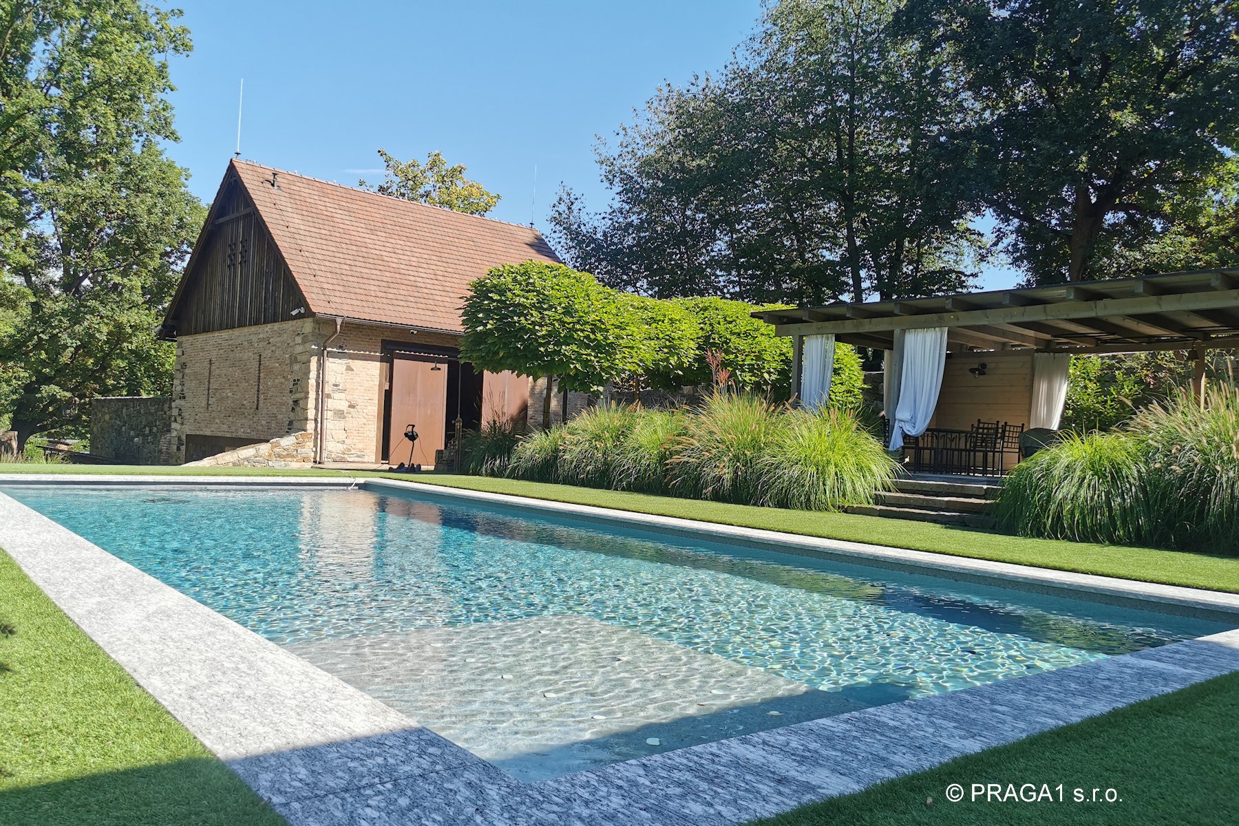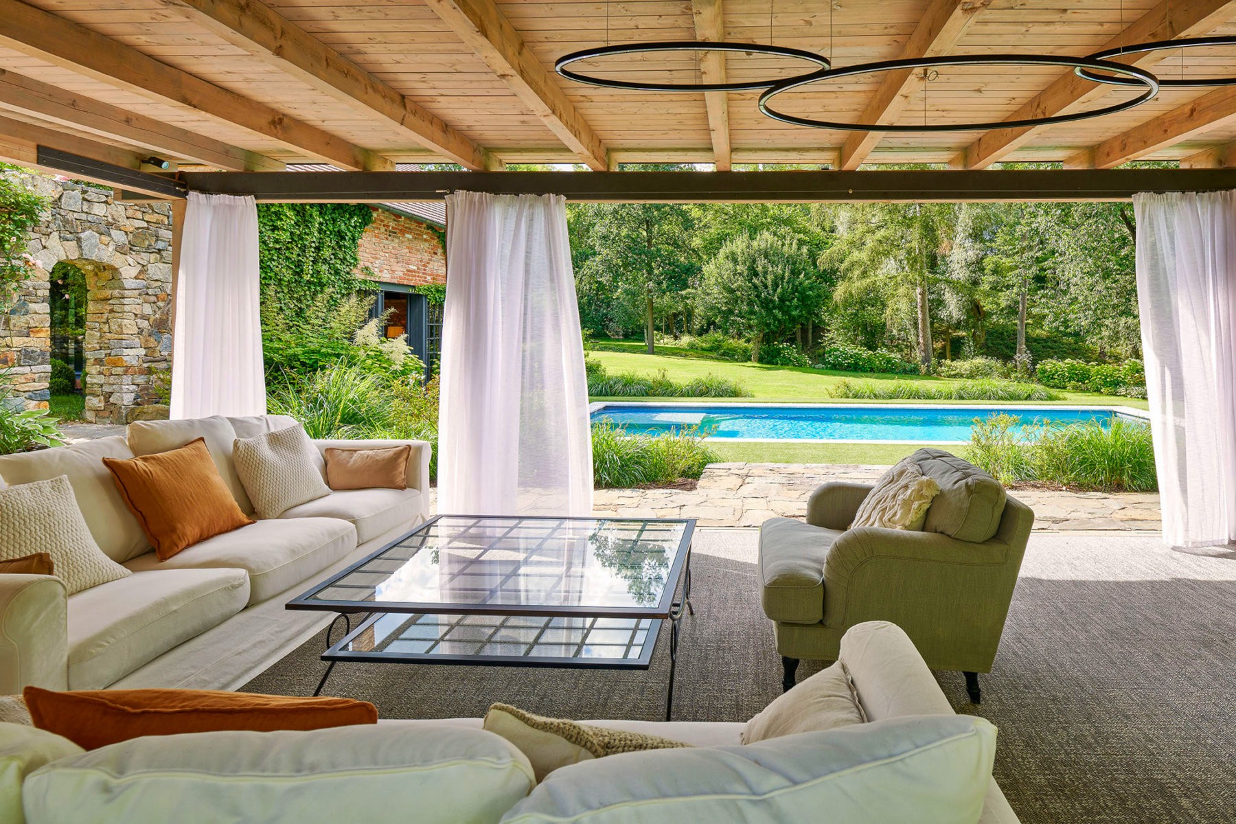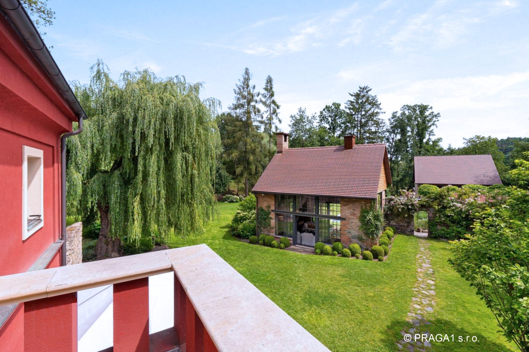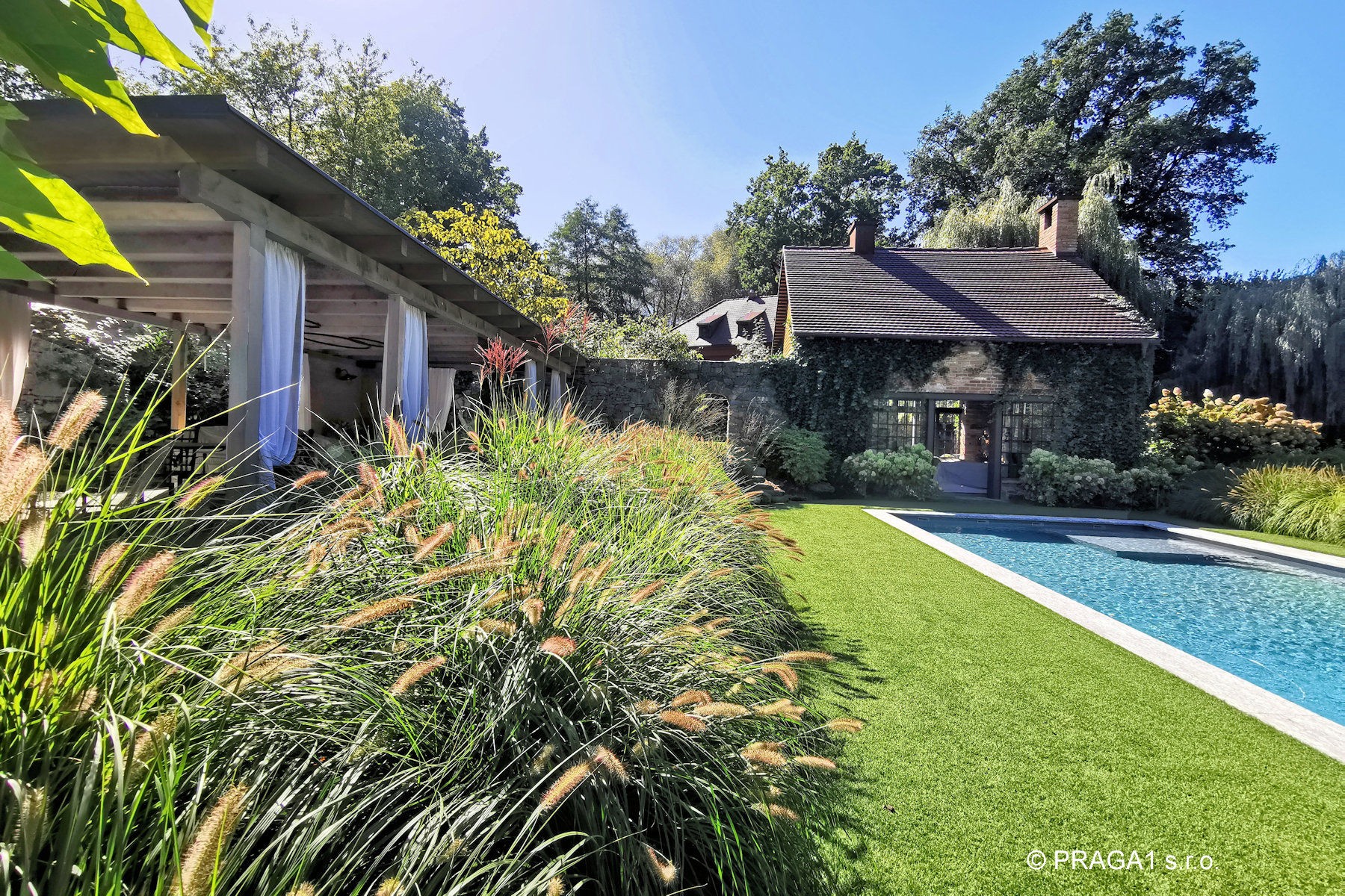 Vedle bazénu se nachází samostatný dům s krbem, propojený terasou s odpočinkovou zónou u bazénu. Na opačné straně bazénu je krytá terasa se sezením. Dále od hlavního domu stojí plně odrestaurovaná stodola, která slouží jako velká garáž s dílnou, hobby místností a umývárnou.