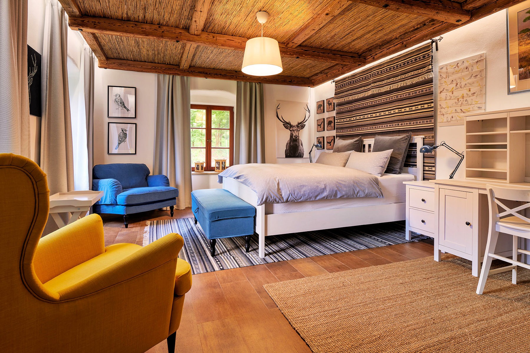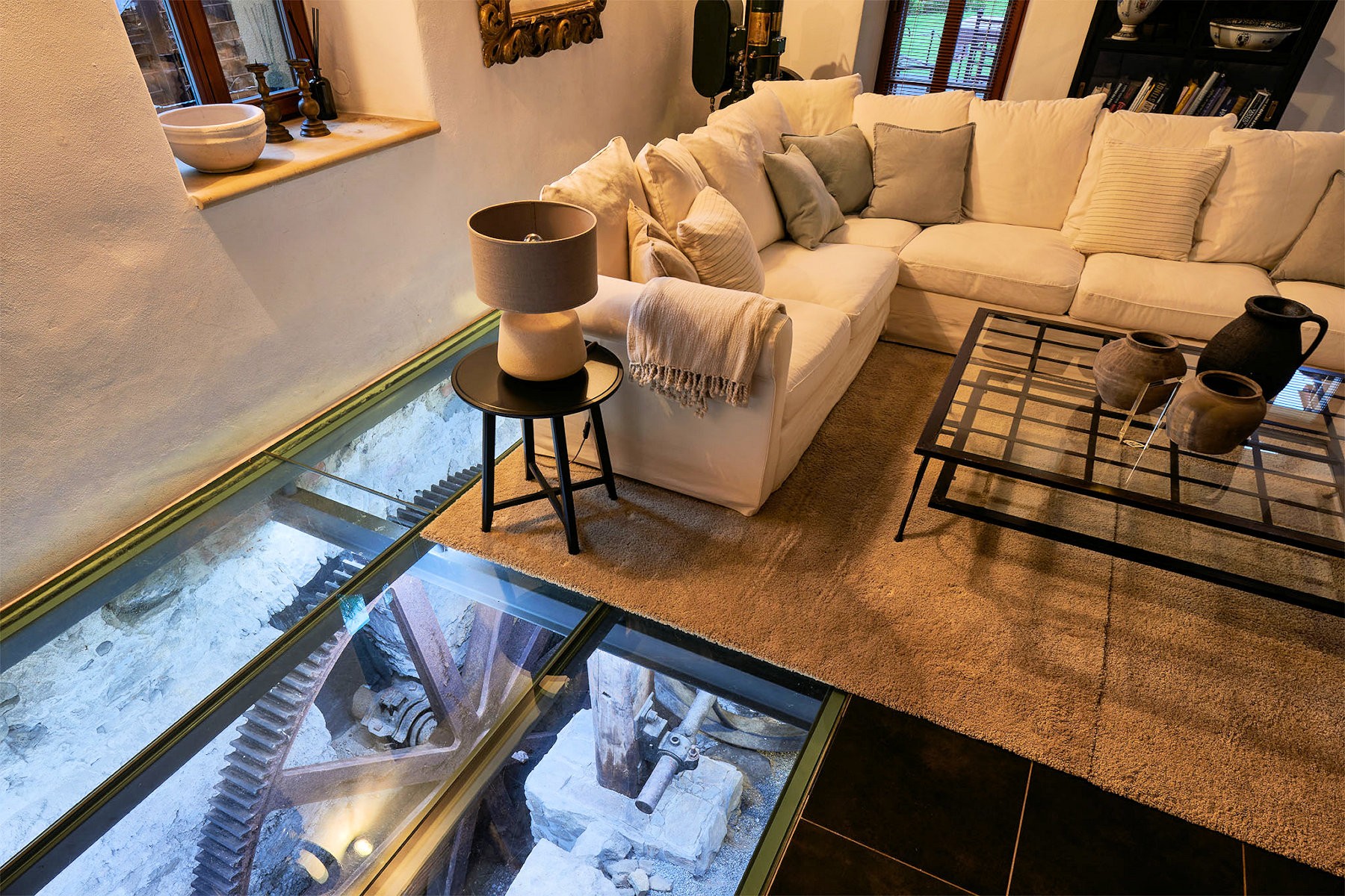 Mlýn nabízí čtyři ložnice s vlastními koupelnami. V přízemí se nachází prostorný obývací prostor s výhledem na staré mlýnské kolo, kuchyně a technické místnosti. Pod hlavní budovou je sklep.