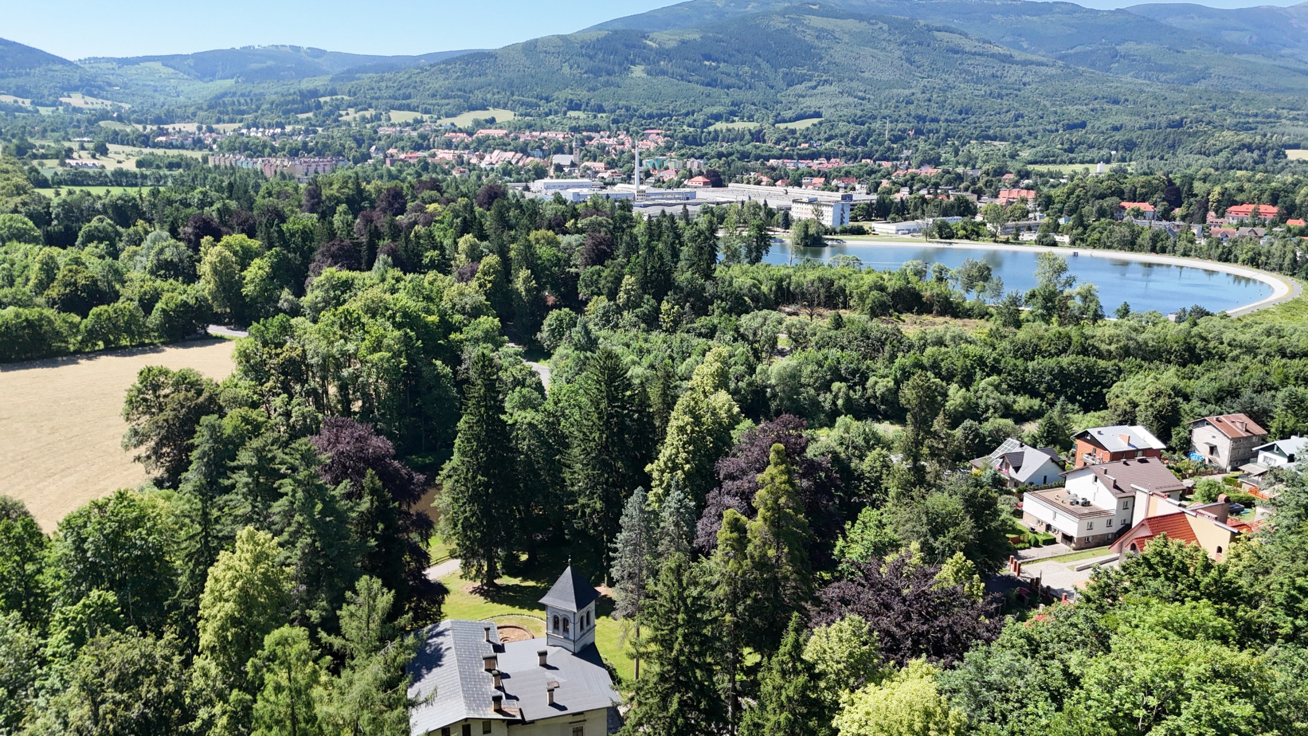 Vyhlídková věž s výhledem na Krkonoše nabízí ideální prostor pro pracovnu nebo malý ateliér.
